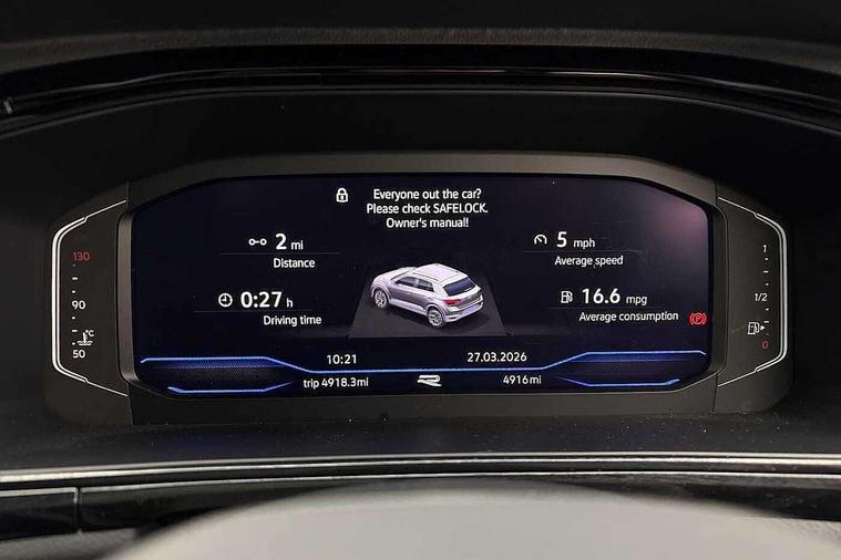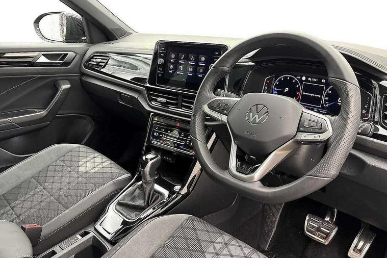 10.25" Digital cockpit pro, Advanced driver attention and drowsiness monitor, Emergency call service, Lane keeping system Lane Assist, Mobile phone interface, Modified key software - reduce switch off time for key status change to Long no motion, Online services, Park assist including front and rear parking sensors, Power assisted speed sensitive steering, Rear view camera, Service interval indicator, Tailgate/trunk lid release from outside, Think blue trainer driver tips and journey analysis, Warning sound and light for front seatbelts unfastened, Wireless app connect, Battery regeneration during braking, Rear shock absorption chassis with increased ride height, Start/stop function with battery regeneration, DAB Digital radio, Diversity antenna for FM reception, Music playback - MP3, WMA and AAC files, SD card slot, Simultaneous pairing of 2 compatible mobile devices, Title and cover art display, We Connect and We Connect Plus functionality, Advanced dynamic light assist for LED matrix headlights, Auto dimming interior rear view mirror, Automatic hazard lights activation under emergency braking, Black roof rails, Dynamic cornering light, Dynamic headlight range control with self adjusting whilst driving, Electrically adjustable and heated door mirrors, Extended roof spoiler, Exterior ambient lighting, Exterior mirrors aspherical on driver side, convex on front passenger side, External USB type C socket and charging sockets, Front windscreen wiper with intermittent wipe and 4 position delay, Heated rear window, Illuminated front grille, IQ LED matrix headlights, LED 3rd brake light, LED rear number plate lights, LED rear tail lights with dynamic turn signal, LED separate daytime running light, Light mode for poor weather, rain, fog or snow, Power windows with comfort operation and circuit breaker, Privacy glass for rear side windows and rear window, R-Line design body coloured bumpers, Rain sensor, Rear exhaust tailpipe, Rear fog light on one side and reversing lights on both sides, Rear side wing doors, Rear wash/wipe with intermittent wipe setting, Remote electrically foldable door mirrors, puddle lights and reverse activated passenger's door mirror, Tilting and sliding panoramic sunroof with rear panoramic sunroof, 12V power socket in centre console, 3 rear head restraints, 3 seat bench in 2nd row, 4 load lashing points in luggage compartment, Air care climatronic air conditoning system with active combination filter and 2-zone temperature control, Chrome plated radiator grille inserts, air vent surrounds and light switch surrounds, Door and side trim panel with leatherette insert, Drawer under drivers seat, Front + rear carpet mats, Front centre armrest, Front comfort sports seats, Front cupholders x 2, Front footwell illumination, Front reading light, Front scuff plates with R Line logo, Front seat back storage pockets, Glove compartment door with light, Instrument lighting, white adjustable panel illumination, Interior ambient lighting and surround lighting, Interior light delay, Isofix child seat preparation, Leather gearshift handle, Load-through provision with cup holder when folded down ('Unsplit rear seat bench, split folding backrest, with centre armrest), Luggage compartment lighting, Non-folding front passenger seat backrest, Single front passenger seat, Stainless steel pedals, Storage compartment in left and right luggage area, Storage compartment in rear doors, Storage compartments in driver and front passenger doors, Sunvisors with illuminated vanity mirrors, Variable boot floor, height adjustable and removable, Black design pack - T-Roc black edition plus, Easy open package with safelock - T-Roc, Sport pack with sports suspension - T-Roc, 3 point height adj front seatbelts + pretensioners, 3 point seatbelts in outer rear with ECE label, ABS, Child locks on rear doors, City emergency braking and pedestrian monitoring, Driver and front passenger airbag with front passenger airbag deactivation, Driver and front passenger safety-optimised head restraints, Drivers seatbelt reminder, Electronic parking brake, Electronic Stability Control (ESC) inc EDL (Electronic Differential Lock) and ASR (Traction Control), Front and rear passengers curtain airbag system including front side airbags, Front disc brakes, Hill start assist, Predictive pedestrian protection, Rear disc brakes, Two tone horn, Tyre pressure loss indicator, Volkswagen roadside assistance, Keyless locking and starting system keyless access with safelock, Gloss deep iron dash trim, 19" Misano black diamond turned alloy wheels with low rolling resistance and anti theft wheel bolts, Tool kit, Trims for alloy wheels, Tyre mobility kit including compressor and sealing foam,