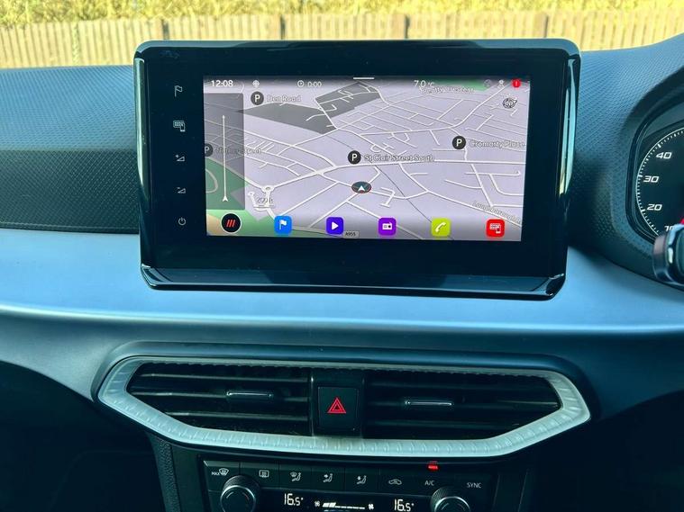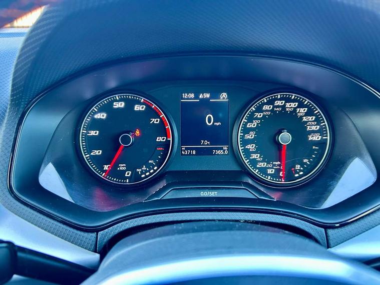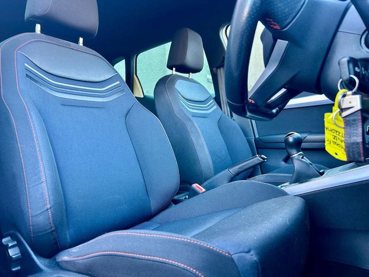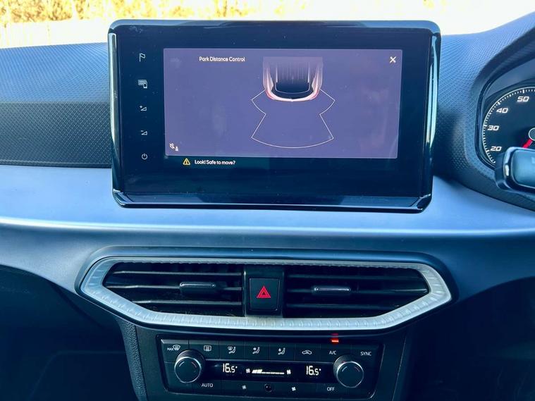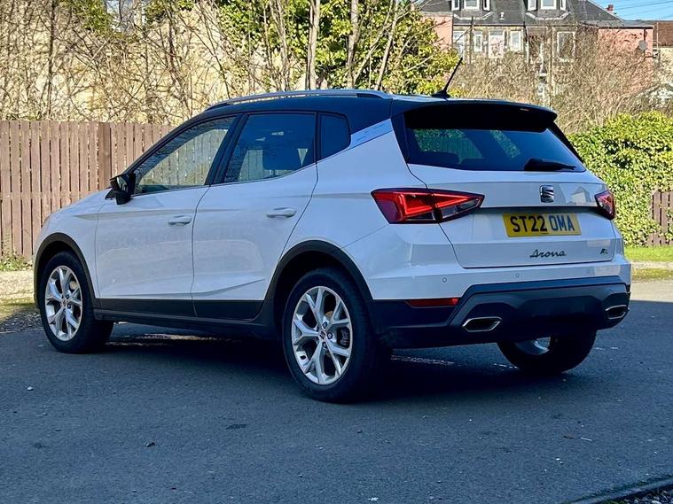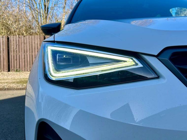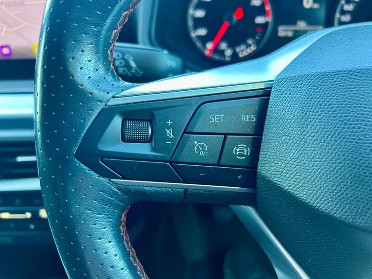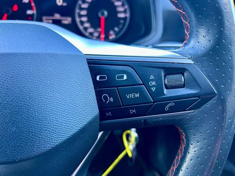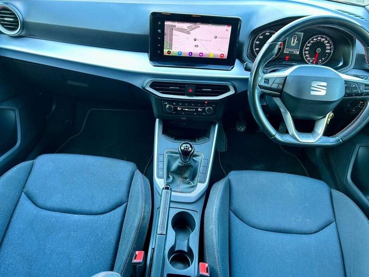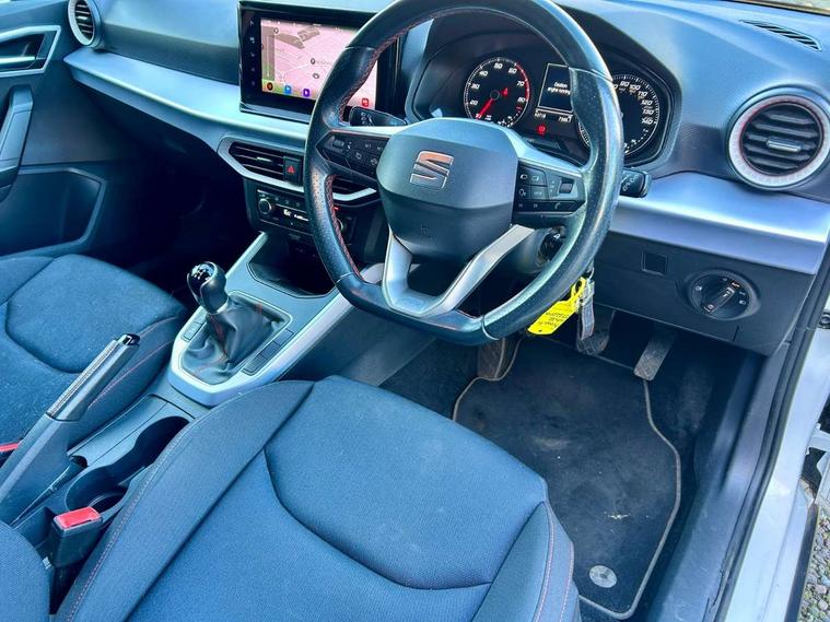 'Lights On' Reminder warning buzzer, 8" Digital cockpit, Digital clock, E-call, Electric speed sensitive power steering, Full Link Smartphone Integration with Mirror Link, Apple Car Play, Google Android Auto with USB Type C cable for Apple and Android compatibility, Lane keeping system, Low fuel warning light, Outside temperature display, Rear parking sensor, RPM counter, Seat connect with safety, service, remote and online, SEAT Drive profile - Four different models normal-sport-eco-individual, steering response, throttle response, Trip computer, Bluetooth interface for hands free and audio streaming, DAB digital radio and AM/FM radio, Steering wheel mounted audio controls, Anti theft roof antenna, Auto dimming interior rear view mirror, Automatic activation of hazard warning lights, Body coloured bumpers, Body coloured door handle inserts, Chrome roof rails and window surrounds, Dark tinted rear windows, Electric front/rear windows, Electrically adjustable, heated and folding door mirrors, Front fog lights with cornering function and rear fog light, FULL LED automatic headlights with dynamic headlight range control, coming and leaving home, LED daytime running lights, LED rear tail lights and licence plate lights, Protective side mouldings, Rain sensing wipers, Rear side wing doors, Rear spoiler, Rear window wash/wipe, Roof colour door mirrors, Third brake light, Twin exhaust pipe styling hidden exhaust pipe, Visible VIN plate, Windshield wiper with intermittent control and potentiometer, 2 cupholders, 3 seat bench in 2nd row, 60/40 split folding rear seat, Aircare filter, Black interior roof, Cloth upholstery, Double boot floor, Driver sunvisor with covered mirror + card holder, Dual zone climate control, Front courtesy light with 2x front and 2x rear reading lights, Front sport seats, Gear shift indicator, Height adjustable front seats, Height/reach adjustable steering column, Illuminated boot, Instrument lighting with brightness control, Interior ambient lighting, Interior light in footwell, central console and door panel, ISOFIX points in outer rear seats with top tether anchorage points, Passenger sunvisor with vanity mirror, Perforated flat bottomed leather steering wheel/gear knob/handbrake with red stitching and FR logo, Single front passenger seat, Two front and three rear height adjustable headrests, Connectivity pack plus - Arona, Interior chrome pack - Arona, 3 point seatbelts on all rear seats, ABS, Active front headrests, Child locks on rear doors, Driver and front passenger airbags with front passenger airbag de activation, front side and curtain airbags, Electronic stability control, Emergency Brake Assist (EBA) and front assist, Front and rear seatbelt reminder, Hill hold control, Multi-Collision braking, Tiredness recognition system, Traction control, Tyre pressure monitoring system, Alarm with back-up horn, Electronic engine immobiliser, Locking wheel bolts, Remote central locking + deadlocks, Tow away protection, Titan black dashboard, 17" Dynamic alloy wheels,