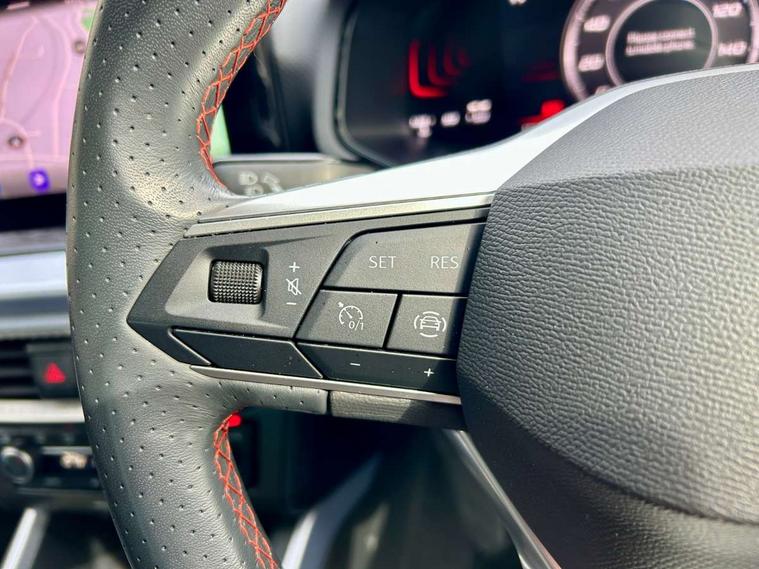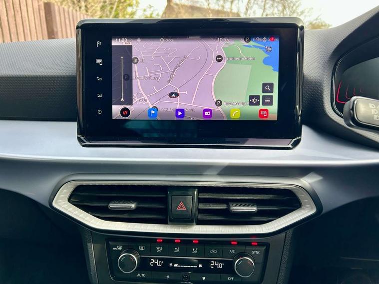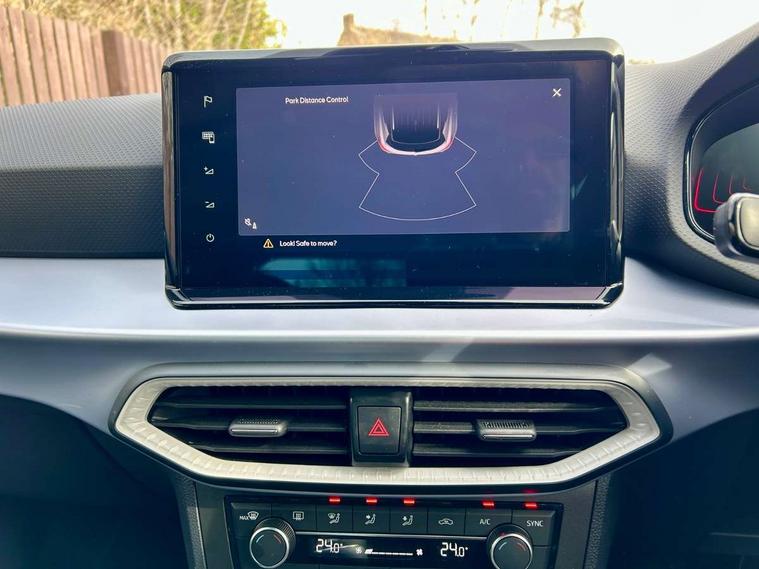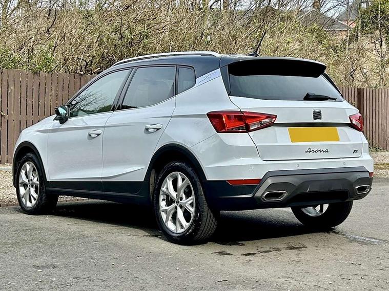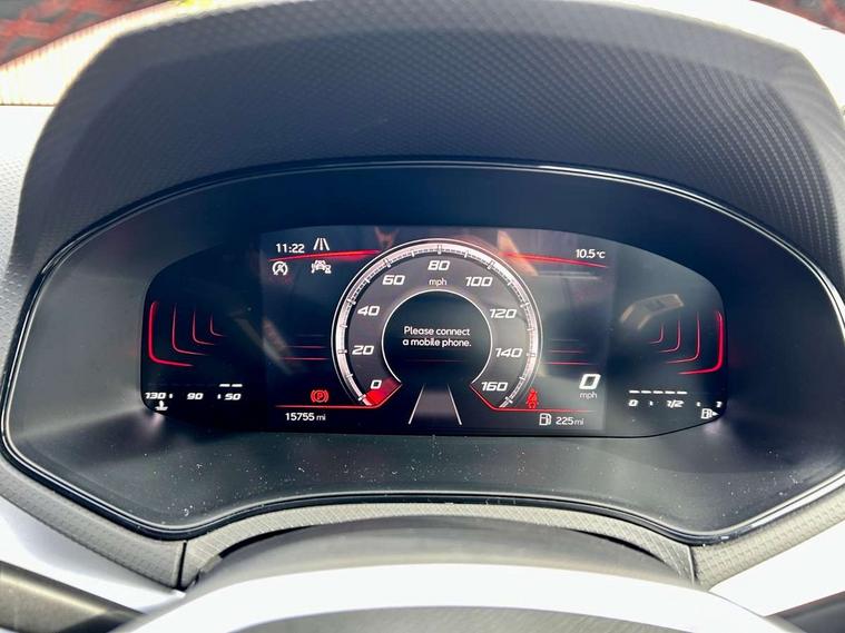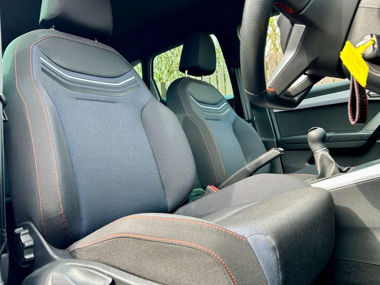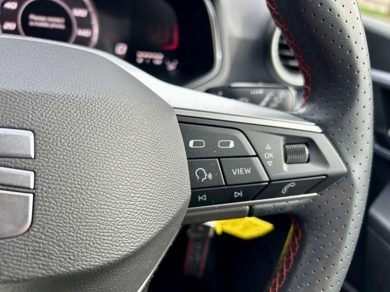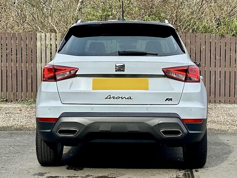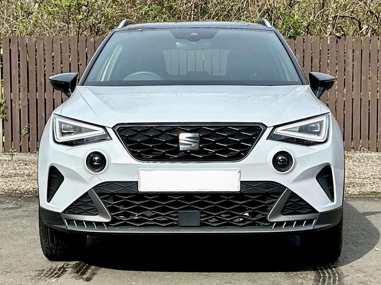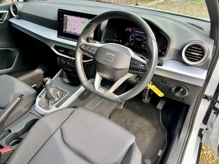 'Lights On' Reminder warning buzzer, 8" Digital cockpit, Digital clock, E-call, Electric speed sensitive power steering, Full Link Smartphone Integration with Mirror Link, Apple Car Play, Google Android Auto with USB Type C cable for Apple and Android compatibility, Lane keeping system, Low fuel warning light, Outside temperature display, Rear parking sensor, RPM counter, Seat connect with safety, service, remote and online, SEAT Drive profile - Four different models normal-sport-eco-individual, steering response, throttle response, Trip computer, Wireless phone charger, 9.2" colour touchscreen with navigation system, voice control and USB port (type c), Bluetooth interface for hands free and audio streaming, DAB digital radio and AM/FM radio, Steering wheel mounted audio controls, Anti theft roof antenna, Auto dimming interior rear view mirror, Automatic activation of hazard warning lights, Body coloured bumpers, Body coloured door handle inserts, Chrome roof rails and window surrounds, Dark tinted rear windows, Electric front/rear windows, Electrically adjustable, heated and folding door mirrors, Front fog lights with cornering function and rear fog light, FULL LED automatic headlights with dynamic headlight range control, coming and leaving home, LED daytime running lights, LED rear tail lights and licence plate lights, Protective side mouldings, Rain sensing wipers, Rear side wing doors, Rear spoiler, Rear window wash/wipe, Roof colour door mirrors, Third brake light, Twin exhaust pipe styling hidden exhaust pipe, Visible VIN plate, Windshield wiper with intermittent control and potentiometer, 2 cupholders, 3 seat bench in 2nd row, 60/40 split folding rear seat, Aircare filter, Black interior roof, Cloth upholstery, Double boot floor, Driver sunvisor with covered mirror + card holder, Dual zone climate control, Front courtesy light with front reading lights, Front sport seats, Gear shift indicator, Height adjustable front seats, Height/reach adjustable steering column, Illuminated boot, Instrument lighting with brightness control, Interior ambient lighting, Interior light in footwell, central console and door panel, ISOFIX points in outer rear seats with top tether anchorage points, Passenger sunvisor with vanity mirror, Perforated flat bottomed leather steering wheel/gear knob/handbrake with red stitching and FR logo, Single front passenger seat, Two front and three rear height adjustable headrests, Interior chrome pack - Arona, 3 point seatbelts on all rear seats, ABS, Active front headrests, Child locks on rear doors, Driver and front passenger airbags with front passenger airbag de activation, front side and curtain airbags, Electronic stability control, Emergency Brake Assist (EBA) and front assist, Front and rear seatbelt reminder, Hill hold control, Multi-Collision braking, Tiredness recognition system, Traction control, Tyre pressure monitoring system, Alarm with back-up horn, Electronic engine immobiliser, Locking wheel bolts, Remote central locking + deadlocks, Tow away protection, Titan black dashboard, 17" Dynamic alloy wheels,