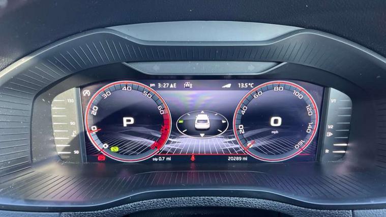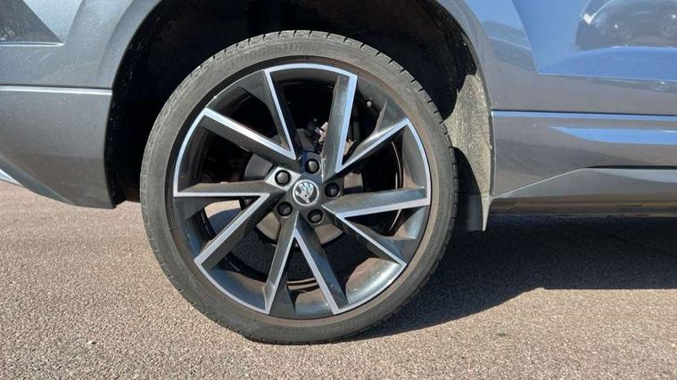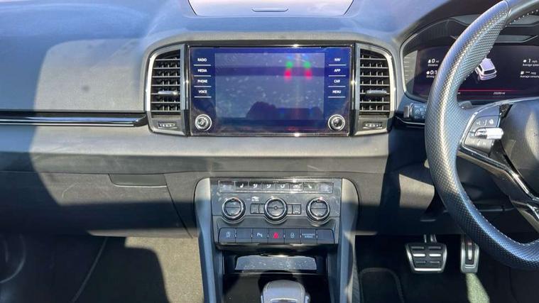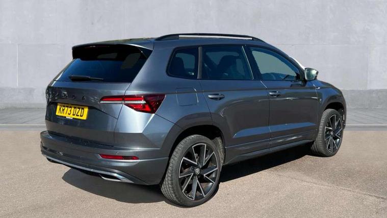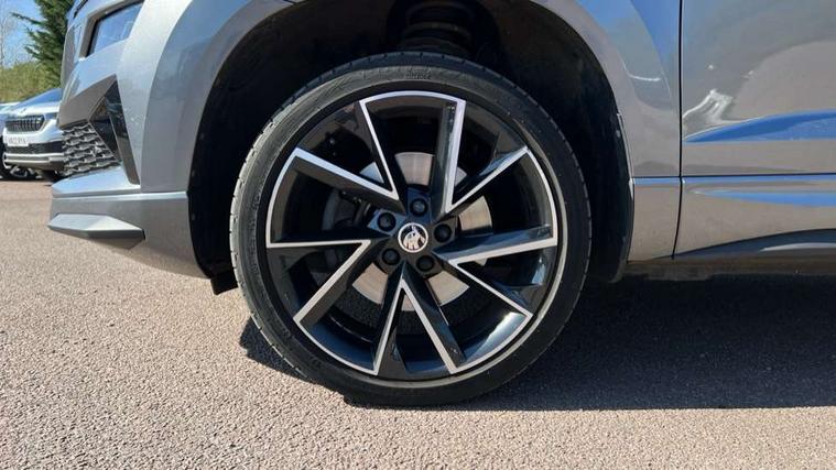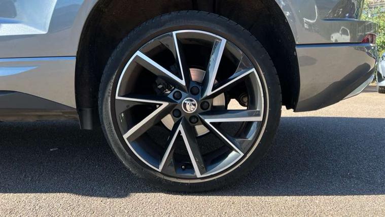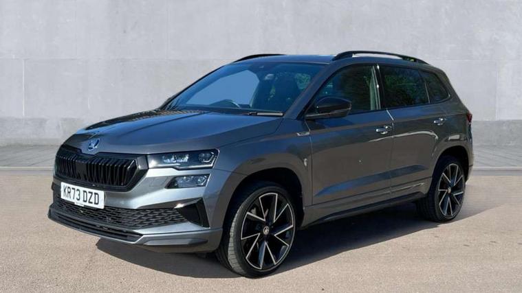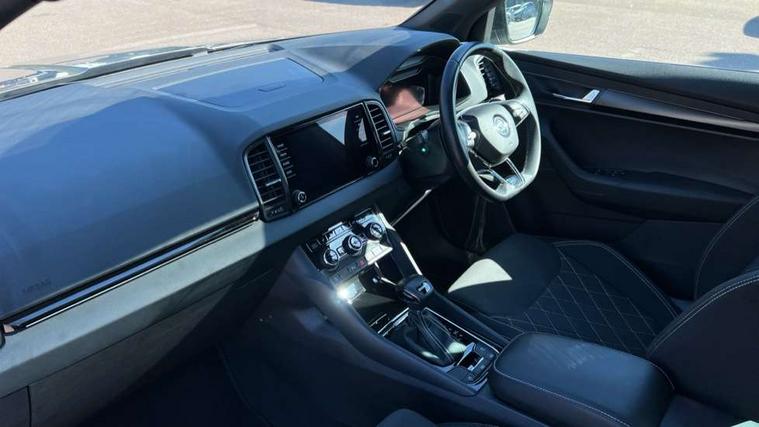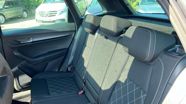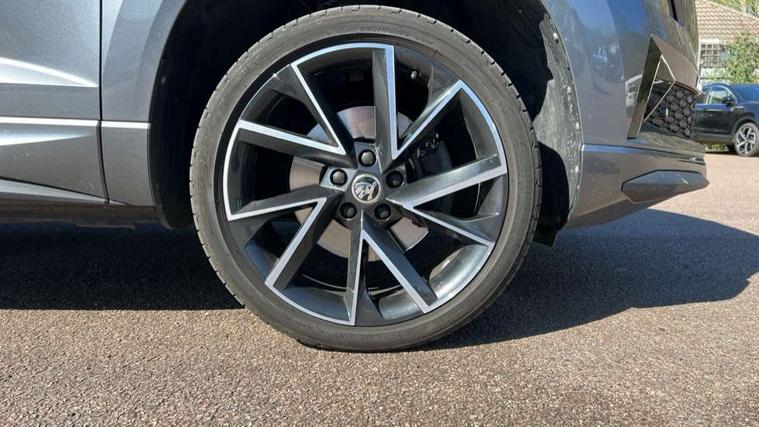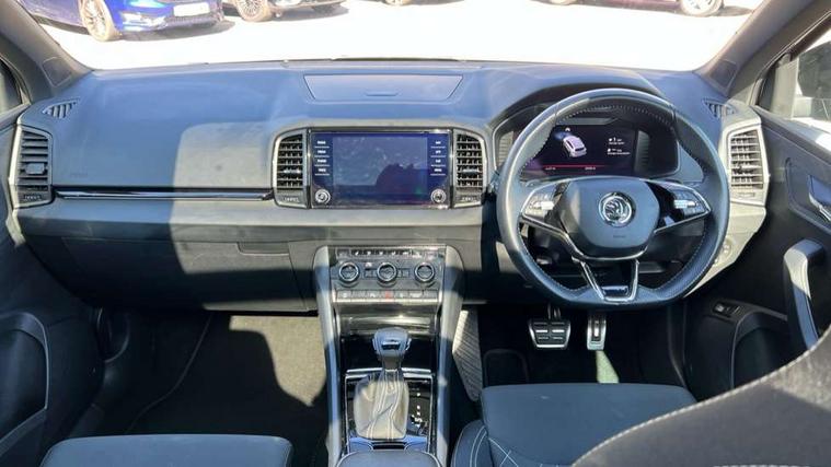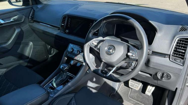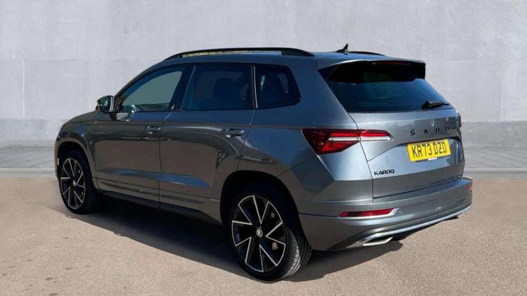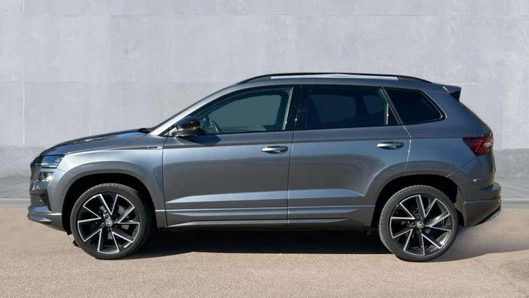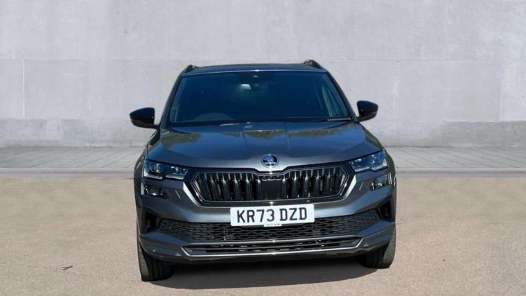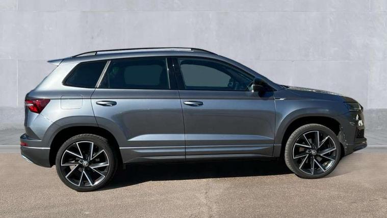 8" Digital display, Care connect, Driver fatigue sensor, Emergency services call system, Outside temperature gauge, Service interval indicator, SmartLink wireless for Apple and wired for Android, Start/stop system with regenerative braking, USB C Port x 2 in front centre console, Virtual cockpit, Virtual pedal with electrically operated boot door, 8 Speakers, DAB radio with Bluetooth, USB connection, Wireless charging without wireless aerial connection, Acoustic glass, Aero front windscreen wipers with intermittent function, Auto dimming rear view mirror with light and rain sensors, Black door mirrors, Black electric window control buttons, Black radiator grille, Black roof rails, Body colour door handles, Electric front and rear windows with child proof lock, Front door steps with SportLine logo, Heated rear windscreen, LED daytime running lights, LED rear lights with high functionality welcome effect and dynamic indicators, Light assistant (coming/leaving home/tunnel light), Panoramic sliding sunroof, Plastic scuff plates, Privacy glass, Protective door side sills in body colour, Rear diffuser, Rear side wing doors, Rear spoiler, Rear window wiper with washer system and intermittent control, Safety reflectors on front doors, Skoda lettering on tailgate in black, Sportline badge on front fender, Sportline decorative inserts with badging, Sports front and rear bumpers, 1.5 litre bottle holders in driver and front passenger door panels, 12V socket in boot, 12v socket in front centre armrest with storage compartment and rear air vents, 3 rear height adjustable headrests, 3 seat bench in 2nd row, 3 spoke leather sports multifunction steering wheel and silver stitching with gear shift paddles, 4 foldable roof handles with rear coat hooks, Black floor carpet, Black roof headlining, Chrome inner door handles, Double sided boot floor, Foldable hooks in the boot, Front head restraints, Height adjustable front three point seats belts with tensioners, Height/reach adjust steering wheel, Ice scraper, Illuminated glovebox, Illuminated luggage compartment, Isofix child seat preparation outer rear, Manual lumbar support for front seats, Pen holder, Pollen filter, Rear boot cover, Rear reading lights, Rear seats fixed folding and divided 60:40, Rubbish bin door, Safety vest holder, Single front passenger seat, Storage box in upper central dashboard closed, Sunvisors with illuminated vanity mirrors, Textile floor mats, Ticket holder, Titan black interior ceiling, Welcome animation with sportline logo, Boot pack - Karoq, Light Pack - Karoq, Parking pack - Karoq, Automatic door unlocking in case of crash, Automatic fuel cut off in case of crash, Child locks on rear doors, Driver airbag, Electronic parking brake with auto hold function, Emergency rear braking signal, ESC including ABS, MSR, ASR, EDS, HBA, DSR, RBS, MKB and traction control, Front side airbags, Hill hold control, Knee airbags, Passenger airbag with switch-off function, Pedestrian monitor, Seatbelt reminder signalisation and pretensioner for all seats, Three point seatbelts rear, Two tone horn, Tyre pressure display, Tyre pressure monitor, Alarm with interior monitoring, back up horn and tilt sensor with safe function, Electronic engine immobiliser, Keyless entry and start/stop, Remote central locking with 2 remote folding keys, Black air vent surround, Black centre console, Satin black dashboard, Satin black door trim, 19" Sagitarius anthracite alloy wheels with matt black aero inserts, Anti-theft wheel bolts protection, Matt black aero hub caps, Tool kit,