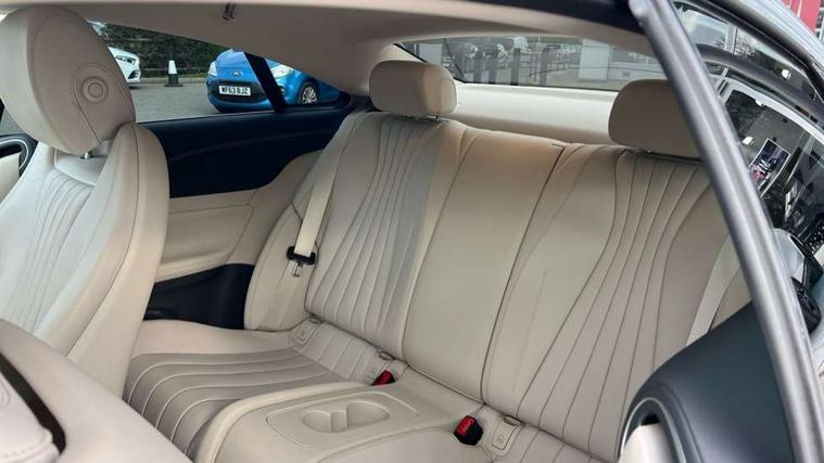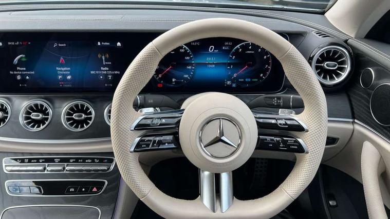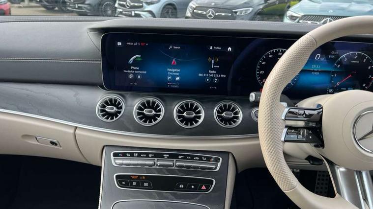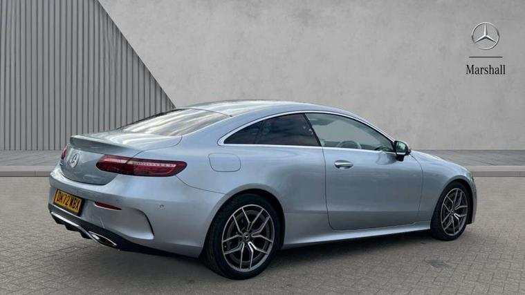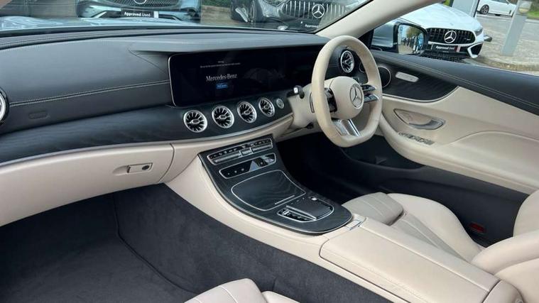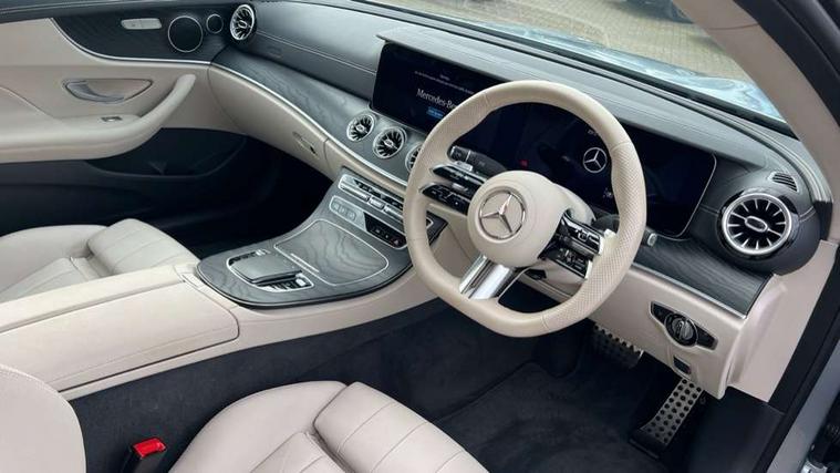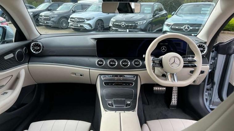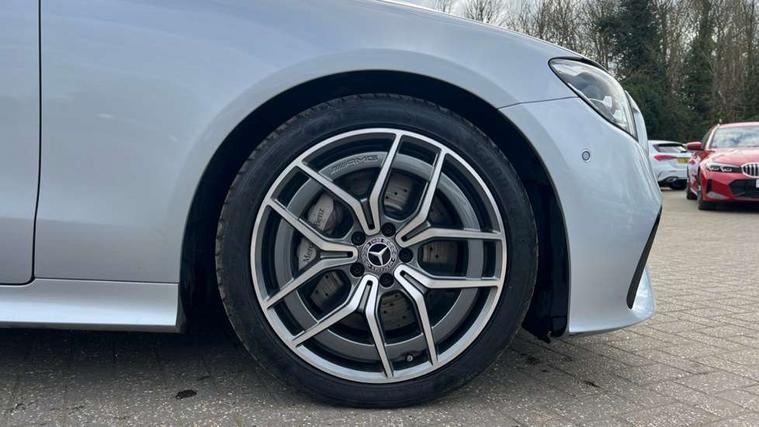 360 degree parking camera, Active parking assist including front and rear parking sensors, Analogue clock, Attention assist, Blind spot assist, Brake wear warning display, Cockpit display 12.3" widescreen digital instrument cluster, Collision prevention assist plus, Cruise control with variable speed limiter, Direct steer speed sensitive steering, DYNAMIC SELECT with a choice of driving modes (ECO, Comfort, Sport, Sport+ and Individual), E-call, ECO start/stop function, Hey Mercedes Voice activation, High resolution 12.3" multimedia colour display, Mercedes connect me, Outside temperature display, Pre-installation for Vehicle Monitoring, Pre-installation for Vehicle Setup, Remote boot release, Service indicator (ASSYST), Status display for rear seat belts in instrument cluster, Touchpad without controller, Traffic sign assist, Trip computer in multifunction display showing current fuel consumption, Wireless charging, 66 litre fuel tank, 9G TRONIC 9 speed automatic transmission, Agility control sports suspension with selective damping system, 2 USB ports in centre console, 2 USB ports in the rear, MBUX multimedia system with DAB digital radio and touchpad including satellite navigation, Smartphone integration via Android Auto/Apple CarPlay, Media Interface, USB and Bluetooth interface and touchpad with control wheel, Adaptive brake lights, Adaptive high beam assist, AMG bodystyling front and rear aprons in polished aluminium, AMG boot lid spoiler in body colour, Body colour door handles, Body coloured bumpers, Electric windows with one touch opening/closing and obstruction sensors, Exterior mirrors heated and electronically adjustable, Illuminated front door sill panels with Mercedes-Benz lettering, LED daytime running lights, LED high performance headlamps, Magic Vision Control heated windscreen wiper system, Pre-installation for roof rail systems, Privacy glass Includes rear side windows and rear windscreen, Radiator grille with integral star and 2 louvres in matt iridium silver with chrome trim, Radio aerial integrated into rear window, Rain sensing windscreen wipers, Rear boot, Rear LED lights, Third brake light, Top surround of side windows in polished aluminium, Visible twin pipe exhaust system integrated into bumper, Waistline in polished aluminium, 2 seat bench in 2nd row, 3-spoke flat bottom multifunction AMG steering wheel with Touch Control buttons, trimmed in black nappa leather, 40:20:40 split folding rear seats, Artico man-made leather upper dashboard and beltlines with contrast stitching, Automatic child seat recognition sensor, Belt feeder driver and front passenger seat belt automatically positioned within easier reach, Black door pins, Black roof lining, Central stowage compartment with 12 V socket in centre console, Central stowage compartment with USB socket for use with Android Auto and Apple CarPlay, Centre armrest and door handle illumination, Centre console in black open-pore ash wood, Floor mats with AMG lettering, Front and rear door pockets, Front centre armrest with stowage compartment, Front footwell lights, Glasses compartment in overhead control panel, Glove compartment - lockable, air conditioned and illuminated, Head restraints for driver and front passenger (four-way adjustability) and in rear (two-way), Heated front seats with partial electric adjustment and electro-pneumatic four-way lumbar support, Interior lighting - 64 colour Ambient lighting, Interior rear light/integral reading lights, Isofix rear child seat fastenings, Multi contour front sports seats, Seat occupancy sensor for front passenger seat, Single front passenger seat, Sports pedals in brushed stainless steel with black rubber studs, Steering column manually adjustable for height and reach, Steering wheel gearshift paddles, Sunvisors with illuminated vanity mirrors, THERMOTRONIC automatic climate control system with 3 climate zones, Mirror pack - E Class, Seat comfort pack - E Class, Stowage pack - E Class, 2 x 3-point rear seatbelts, Active bonnet pedestrian safety measure which detects an impact and raises bonnet, Active brake assist, Adaptive brake system with HOLD function and brake drying in the wet, Adaptive driver and front passenger airbags, Airbags - sidebag for driver and front passenger with combined thorax/pelvis bag, Anti-lock braking system (ABS), Drivers knee airbag, Electric parking brake, Electronic Stability Programme, Front and rear window airbags, Head airbags, Hill hold function, Perforated front brake discs with "Mercedes-Benz" lettering, Pre-Safe anticipatory safety system, Seatbelt warning, Tyre pressure monitoring system, Warning triangle and first aid kit, Alarm system/interior protection/immobiliser, Central locking with interior switch, automatic locking and crash sensor with emergency opening function, Chrome surround in electric key, Keyless Go entry and starting function, Open-pore black ash wood trim, 19" AMG 5 twin spoke alloy wheels in tantalite grey with high sheen finish (RZI), Summer tyres, TIREFIT with tyre inflation compressor,
