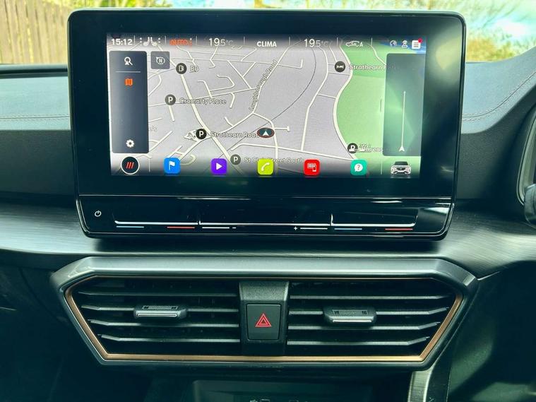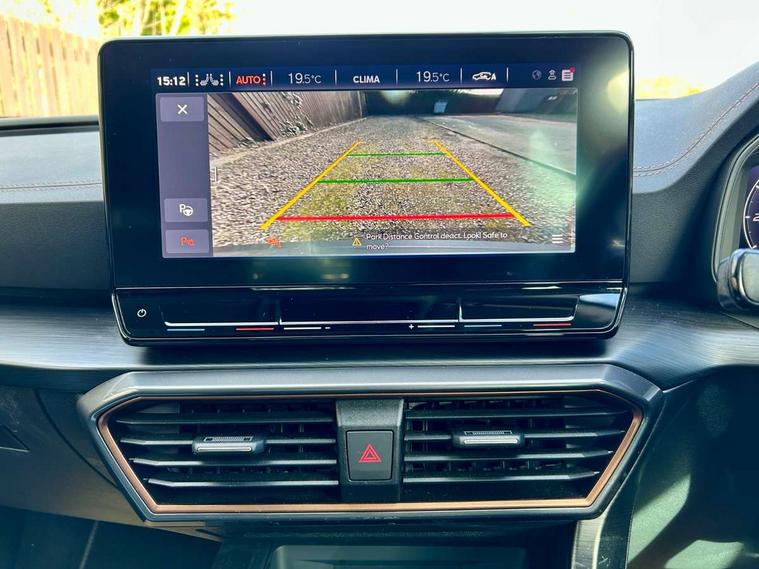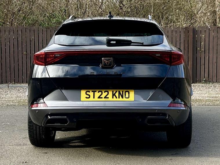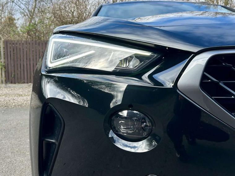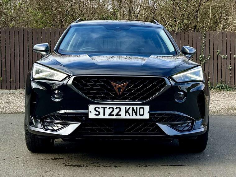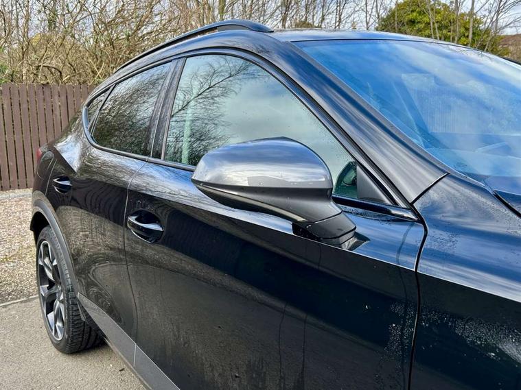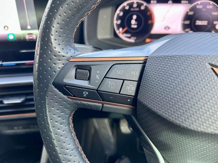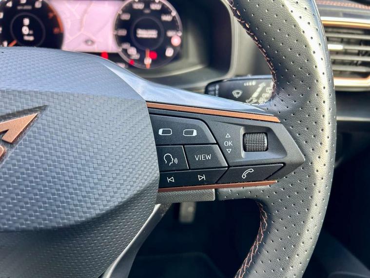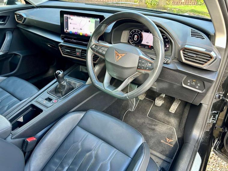 Digital cockpit and configurable dashboard, Driver alert system, Driving profile selection, E-call, Forward collision warning with automatic braking, Lane assist, Park assist (inc front/rear parking sensors), PAS, Predictive adaptive cruise control with speed limiter, Rear view camera, RPM, trip computer, outside temp gauge, instrument light brightness, low fuel warning light, lights on reminder, gearshift indicator, Service interval indicator, Start/stop system with regenerative braking, Wireless apple carplay, Wireless phone charger, Electronic locking differential and dynamic traction support, Standard suspension, 2 front and 2 rear USB type C sockets, Auxiliary input socket, DAB radio, Auto dimming rear view mirror, Body colour door handles, Body coloured bumpers, Dark grey wing mirror, Daytime running light with automatic headlight control and coming home feature, Dynamic headlight range control, Electric front/rear windows, Electrically adjustable heated and folding door mirrors with memory function, Front fog lamps with cornering function, Gloss black roof rails and window surrounds, LED Headlights, LED Taillights with dynamic indicator, Rain sensing wipers, Rear diffuser with black simulated exhaust pipes, Rear side wing doors, Rear wash/wipe, Third brake light, Tinted rear windows, Welcome lights, 12v power supply in centre console, 12V socket, 12v socket in loadspace, 2 front and 2 rear reading lights, 230V socket, 3 seat bench in 2nd row, 60/40 split rear bench seat with armrest and mechanical seat release, Dust/pollen filter, Front and rear head restraints, Front centre armrest, Height/reach adjust steering wheel, Illuminated interior front door sills, Illuminated sunvisor with mirror, Isofix, Leather multi function steering wheel, Luggage tie-down hooks, Single front passenger seat, Three zone climate control with control panel in rear, Variable luggage/load compartment floor, Wraparound lighting, Genuine Nappa leather Pack - Cupra, Navigation system pack with 10" navigation system - Formentor, Safety and driving pack (M) - Formentor, 3 point seatbelts on all rear seats, ABS, Brake control system - ESC and brake booster, Child proof door locks, Driver and front passenger airbags with front passenger airbag de-activation, Electronic parking brake, Front and rear disc brakes, Front side curtain airbags, Hill hold control, Seat belt reminder for front and rear seats, Tyre pressure monitoring system, Anti theft alarm system, Keyless entry and start system (KESSY), Locking wheel bolts, Copper and aluminium interior detailing, 19" 'Exclusive' machined sport matte black and silver alloy wheels,