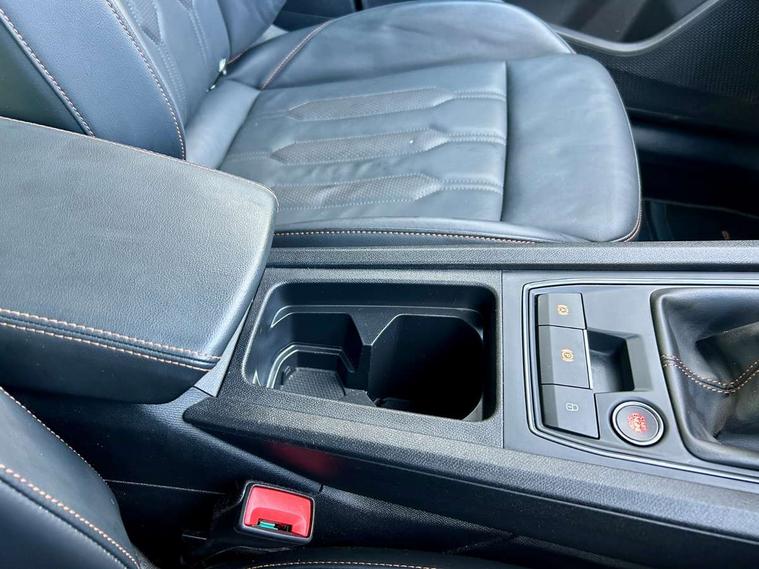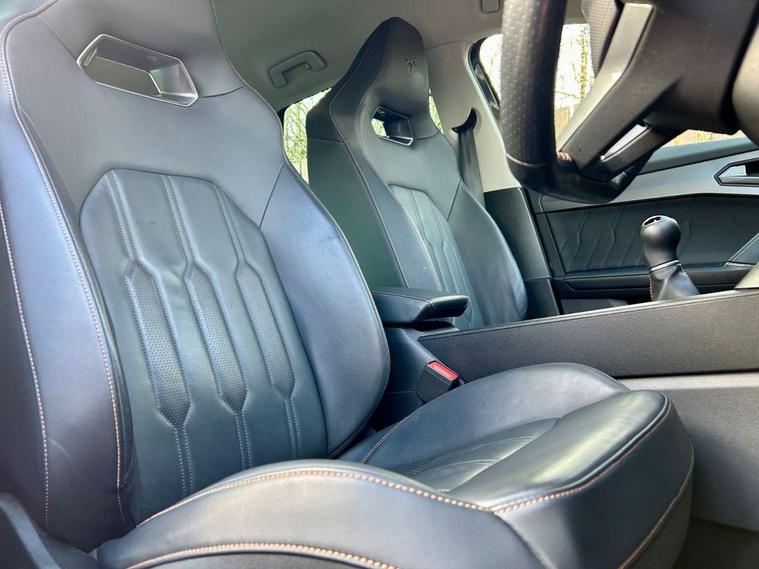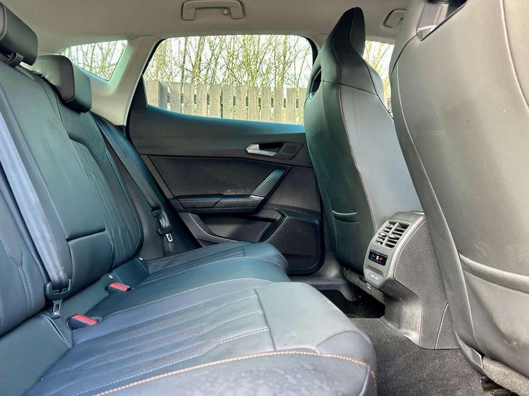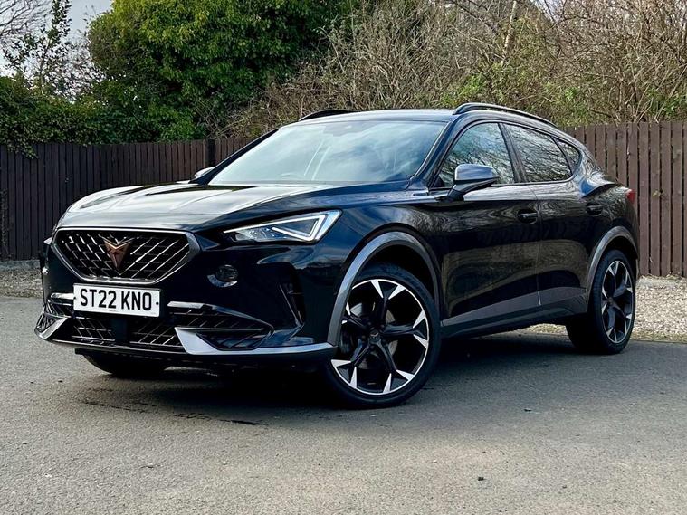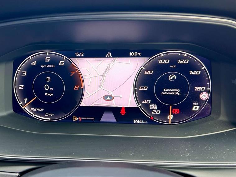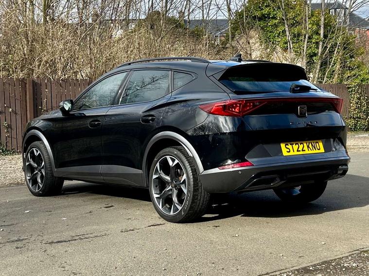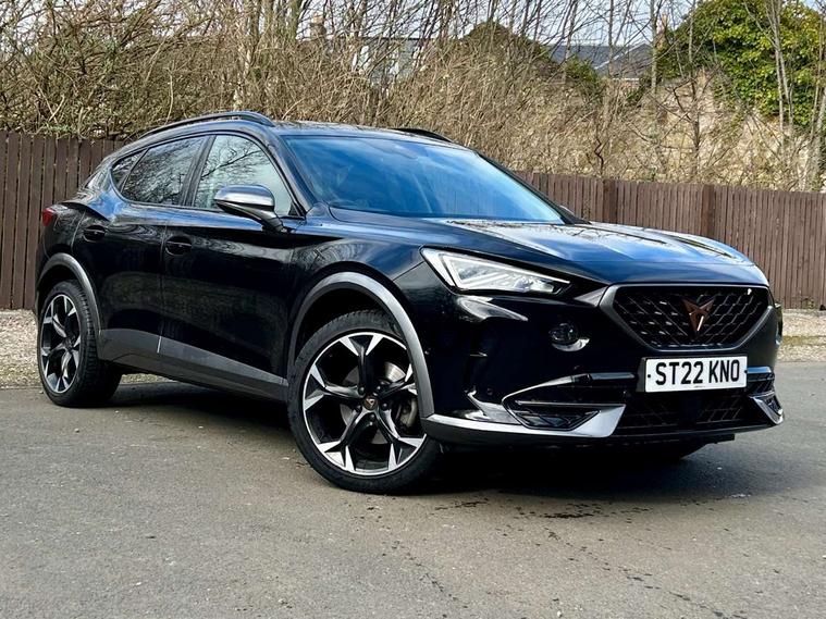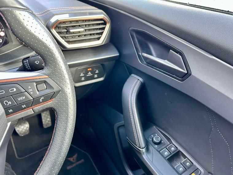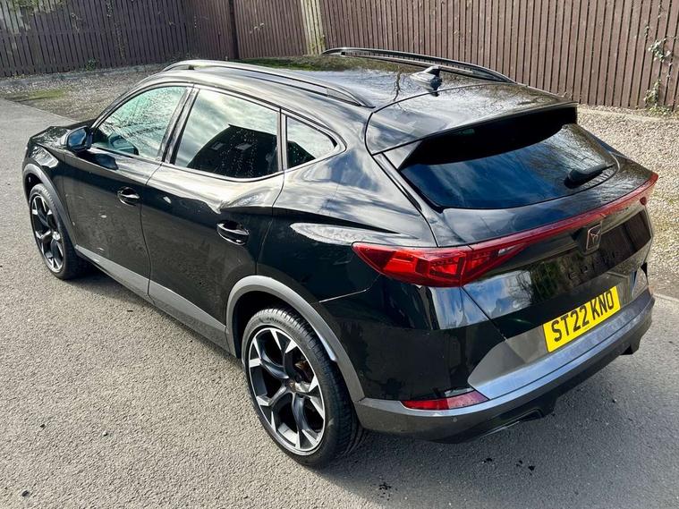 Digital cockpit and configurable dashboard, Driver alert system, Driving profile selection, E-call, Forward collision warning with automatic braking, Lane assist, Park assist (inc front/rear parking sensors), PAS, Predictive adaptive cruise control with speed limiter, Rear view camera, RPM, trip computer, outside temp gauge, instrument light brightness, low fuel warning light, lights on reminder, gearshift indicator, Service interval indicator, Start/stop system with regenerative braking, Wireless apple carplay, Wireless phone charger, Electronic locking differential and dynamic traction support, Standard suspension, 2 front and 2 rear USB type C sockets, Auxiliary input socket, DAB radio, Auto dimming rear view mirror, Body colour door handles, Body coloured bumpers, Dark grey wing mirror, Daytime running light with automatic headlight control and coming home feature, Dynamic headlight range control, Electric front/rear windows, Electrically adjustable heated and folding door mirrors with memory function, Front fog lamps with cornering function, Gloss black roof rails and window surrounds, LED Headlights, LED Taillights with dynamic indicator, Rain sensing wipers, Rear diffuser with black simulated exhaust pipes, Rear side wing doors, Rear wash/wipe, Third brake light, Tinted rear windows, Welcome lights, 12v power supply in centre console, 12V socket, 12v socket in loadspace, 2 front and 2 rear reading lights, 230V socket, 3 seat bench in 2nd row, 60/40 split rear bench seat with armrest and mechanical seat release, Dust/pollen filter, Front and rear head restraints, Front centre armrest, Height/reach adjust steering wheel, Illuminated interior front door sills, Illuminated sunvisor with mirror, Isofix, Leather multi function steering wheel, Luggage tie-down hooks, Single front passenger seat, Three zone climate control with control panel in rear, Variable luggage/load compartment floor, Wraparound lighting, Genuine Nappa leather Pack - Cupra, Navigation system pack with 10" navigation system - Formentor, Safety and driving pack (M) - Formentor, 3 point seatbelts on all rear seats, ABS, Brake control system - ESC and brake booster, Child proof door locks, Driver and front passenger airbags with front passenger airbag de-activation, Electronic parking brake, Front and rear disc brakes, Front side curtain airbags, Hill hold control, Seat belt reminder for front and rear seats, Tyre pressure monitoring system, Anti theft alarm system, Keyless entry and start system (KESSY), Locking wheel bolts, Copper and aluminium interior detailing, 19" 'Exclusive' machined sport matte black and silver alloy wheels,