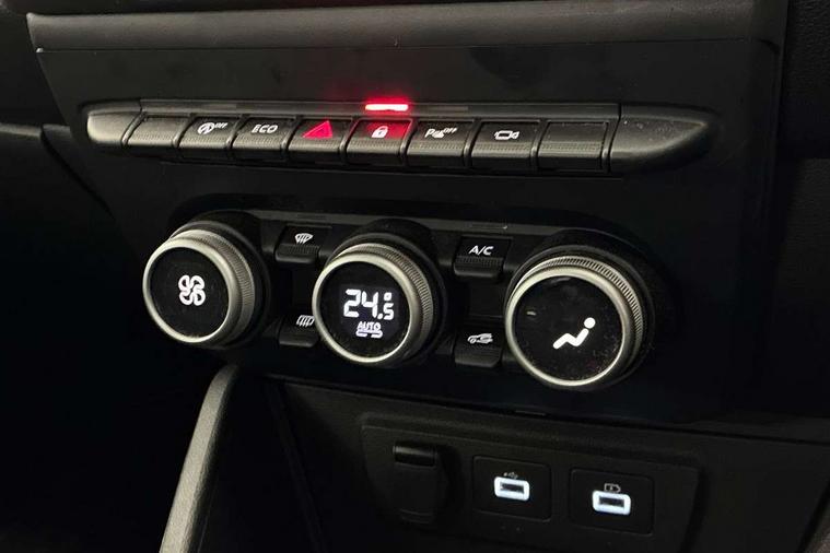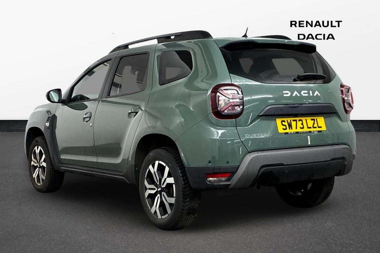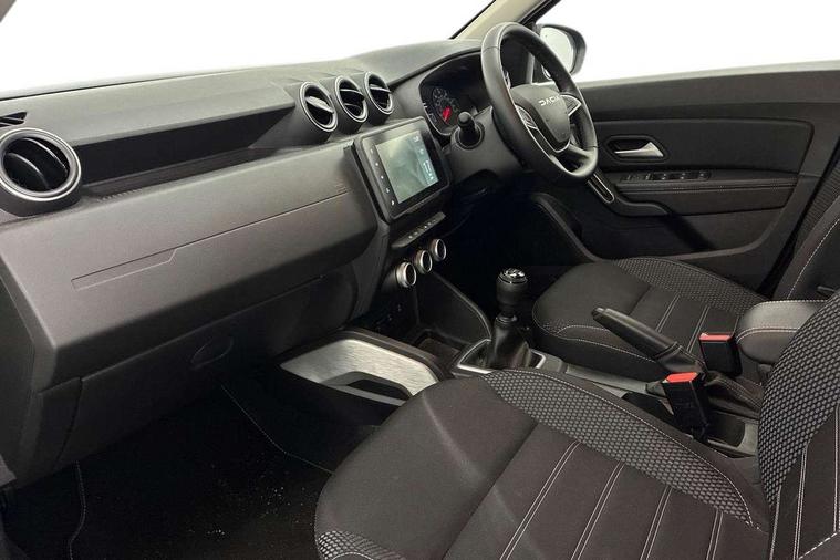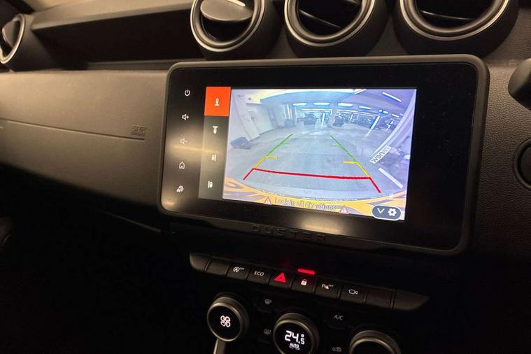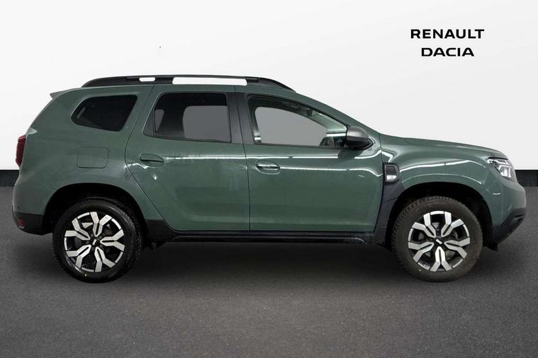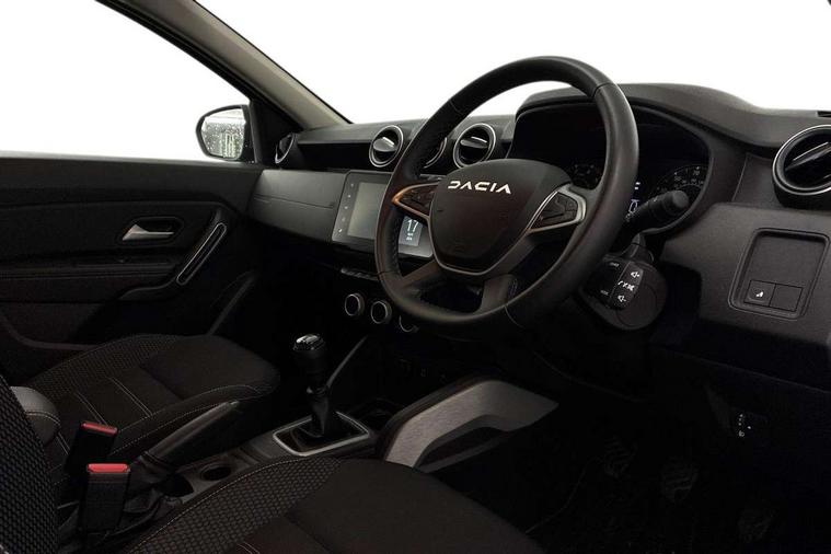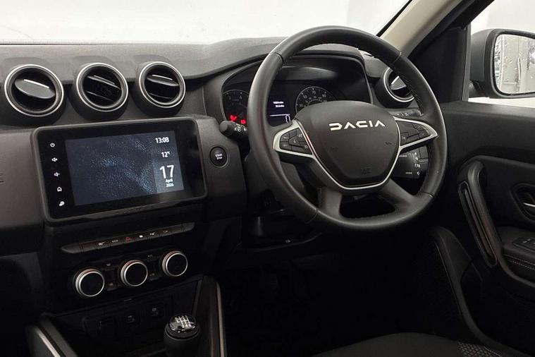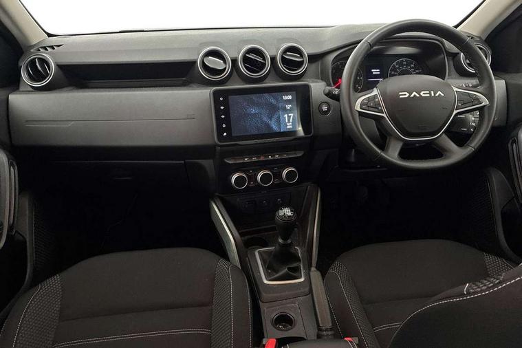 Blind spot warning, Cruise control and speed limiter, eCall emergency system, Eco mode, Electric power assisted steering, Multi view camera, On board computer, odometer, trip computer, average fuel consumption, average speed, service indicator, outside temperature gauge, Rear parking sensors, Rev counter, Reversing camera, Stop/start system, 8" Media Navigation with wireless smartphone replication, Dacia plug and radio/MP3/USB/bluetooth/DAB/steering wheel control, 3 speed windscreen wipers, Acoustic windshield, Automatic front wipers, Black side sills, Black/satin chrome tailgate trim with Duster inscription in black background and lettering, Body coloured door handles, Chrome front grille with hot stamping, Chrome logo surround on steering wheel, Dark glass on lateral rear windows, Daytime running lights, Drivers window one touch up/down, Dusk sensor, Electric adjustable/heated door mirrors, Electric folding door mirrors, Electric front windows, Electric rear windows, Front and rear body coloured bumpers, Front door sill protection strip, Front fog lights, Grey quartz longitudinal roof bars with Duster inscription, Heated rear window, High level third rear brake light, Modular roof bars, Rain sensor, Rear side wing doors, Rear spoiler, Rear wash/wipe, Satin chrome door mirrors, Underbody protection skid plates, Y shaped LED headlights with rear LED lights, 3 rear height adjustable headrests, 3 seat bench in 2nd row, 60/40 split folding rear seat, Automatic air conditioning, Backlighted steering wheel buttons, Boot light, Driver seat lumbar adjustment, Fabric decorative insert on door panels, Fabric upholstery, Front head restraints, Front passenger reading light, Gear shift indicator, Glovebox light, Heated seats, Height adjustable driver seat, Height adjustable front and rear headrests, Height and depth adjustable steering wheel, High centre console with driver armrest, Isofix points for child seats in both outer rear seats, Map pocket on front seat backs, Passenger sunvisor with vanity mirror, Rear passenger reading light, Satin chrome gear lever cap insert, Satin chrome interior door handles, Satin chrome lower steering wheel insert, Single front passenger seat, Soft feel leather steering wheel, 3x3 point rear seatbelts, ABS and Emergency brake assist, ASR traction control with Electronic stability control, Child locks on rear doors, Door open visual and audible warning, Driver airbag, Driver and passenger seatbelt not fastened - visual and audible warning, EBD - Electronic brakeforce distribution, Front passenger airbag, Front passenger airbag deactivation, Front seatbelt pretensioners, Front side airbags, Height adjustable front seatbelts, Hill start assist, Tyre pressure monitor, Keyless entry, Remote central locking, Thatcham approved engine immobiliser, Charcoal grey central console surround, Matt black central console fascia, Matt black decorative insert on rear door panels, Piano black decorative insert on front door panels, Satin chrome air vent surround, Satin chrome instrument dial surrounds, 17" Alloy wheels,