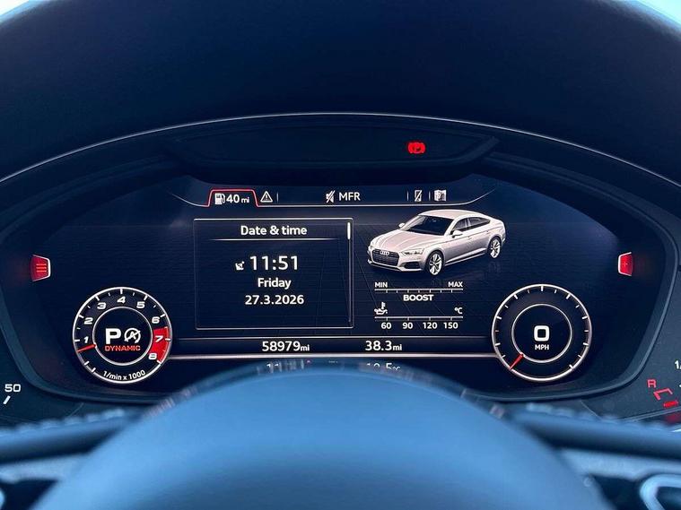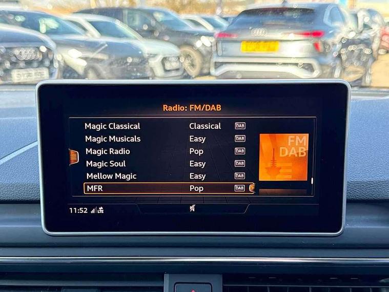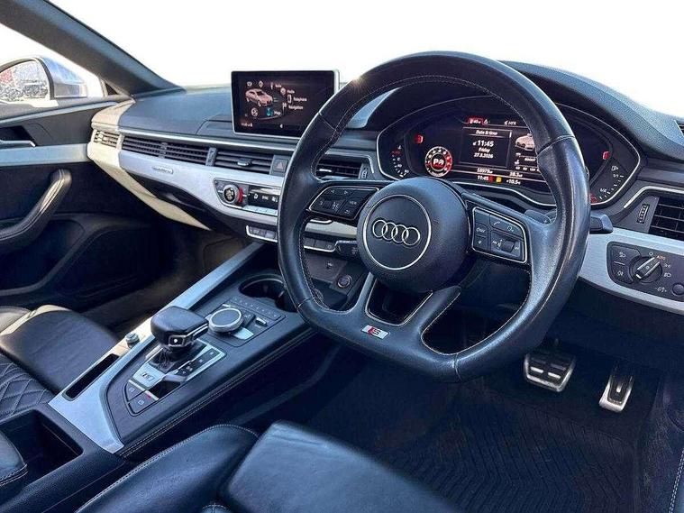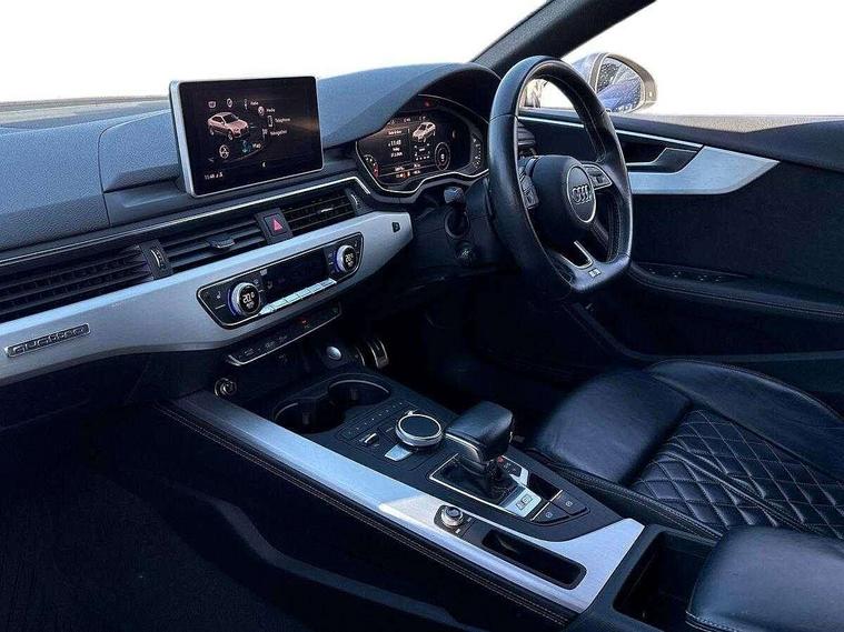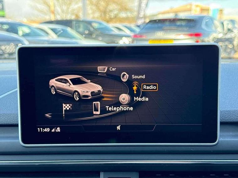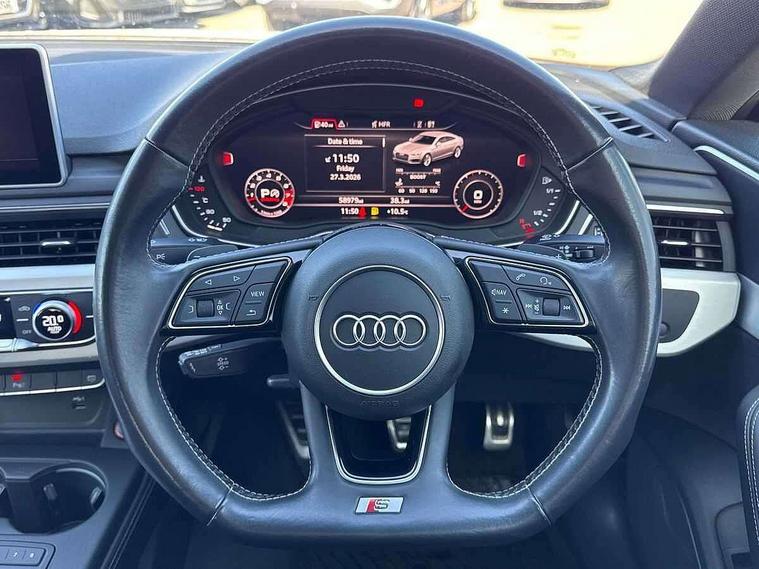 Audi drive select, Audi parking system plus with front and rear sensors, Audi smartphone interface, Colour driver's information system display, Electric tailgate release, Electro-mechanical PAS, MMI navigation plus with MMI touch, Mobile telephone preparation - bluetooth interface, Service interval indicator, Voice control system, CD player, DAB Digital radio, MMI radio plus with 7" colour MMI screen and MMI controller, Two SDXC card slots, Air inlets in titanium black, Aluminium door mirror housings, Auto dimming rear view mirror with acoustic windscreen, Body colour bumpers, Body colour rear spoiler, Chrome door handles, Electric adjustable heated door mirrors, Electric front windows, Front fog lights, Headlight washers, Heat insulated glass, High beam assistant, Rain and light sensors, S body styling, Twilight grey matt radiator grille in aluminium silver matt inlay, Twilight grey matt rear diffuser, Twin chrome exhaust tailpipes x2, 'S' instrument dials, 2 x USB charging port with aux input socket, 3 seat rear bench, Adjustable steering column, Automatic tri-zone climate control, Black headlining, Boot mat, Centre console with cupholders, Electric lumbar support, Fine Nappa leather upholstery, Front centre armrest, Front head restraints, Front/rear floor mats, Illuminated door sills, Isofix front passenger and rear seat preparation, Jack and tool kit, Massage function for front seats, Rear headrests, Split folding rear seat, Stainless steel pedals and foot rest, Super sports seats, Top tether anchor plate for isofix child seat, Extended interior upholstery pack - A5/RS5, Non Smokers pack, 3x3 point rear seatbelts, ABS, ASR, Driver/Front Passenger airbags, Electromechanical parking brake, Enhanced braking system, ESP + traction control, First aid kit, Front and rear curtain airbags, Front passenger airbag deactivation, Front side airbags, Height adjustable front seatbelts, Hill hold function, Multi-Collision braking, Pre-sense city emergency braking system, Seatbelt warning, Tyre pressure monitor, Warning triangle, Anti theft system, Immobiliser, Keyless Start, Locking wheel bolts, Remote central locking, 19" 5 spoke cavo design alloy wheels in part polished/contrast grey finish, Space saver spare wheel,