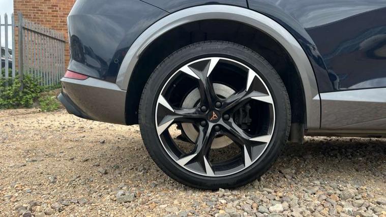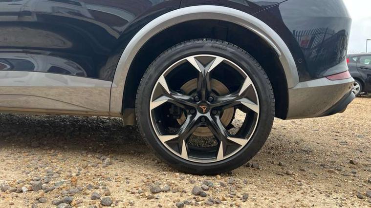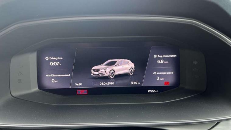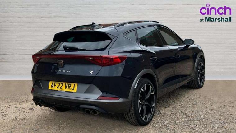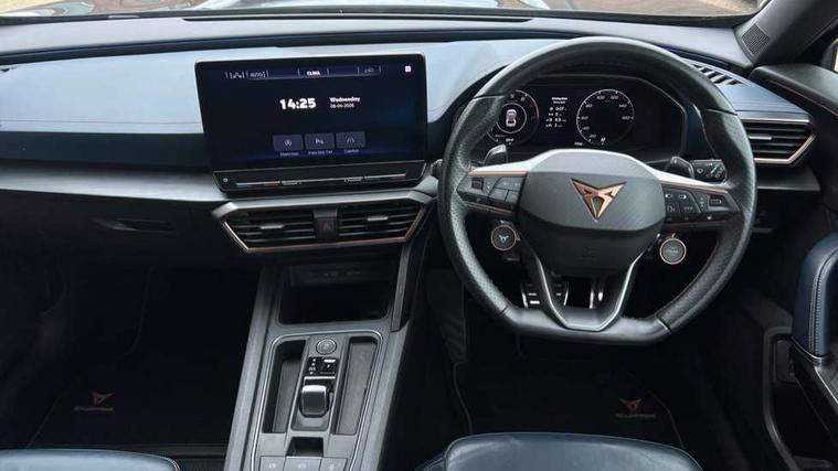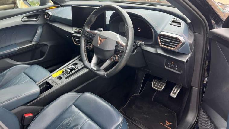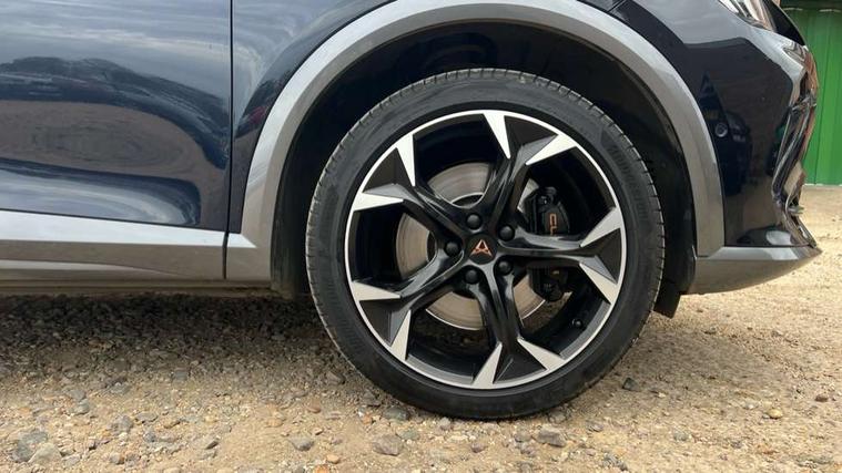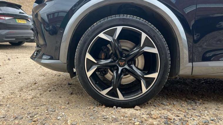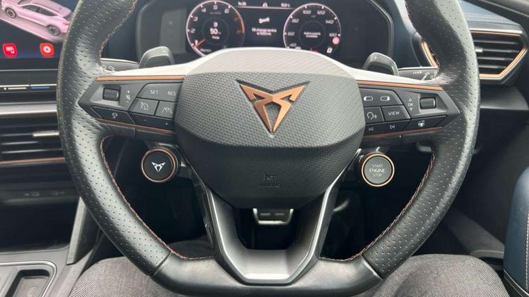 Digital cockpit and configurable dashboard, Driver alert system, Dynamic chassis control with driving profile selection (Comfort, Sport, CUPRA, Individual), E-call, Forward collision warning with automatic braking, Lane assist, Park assist (inc front/rear parking sensors), Predictive adaptive cruise control with speed limiter, RPM, trip computer, outside temp gauge, instrument light brightness, low fuel warning light, lights on reminder, gearshift indicator, Service interval indicator, Speed sensitive power steering, Start/stop system with regenerative braking, Virtual pedal and electric tailgate, Wireless apple carplay, Wireless phone charger, Electronic locking differential and dynamic traction support, Sports suspension with front shock absoption, 2 front and 2 rear USB type C sockets, Auxiliary input socket, DAB radio, Auto dimming rear view mirror, Body colour door handles, Body coloured bumpers, Dark grey wing mirror, Daytime running light with automatic headlight control and coming home feature, Dynamic headlight range control, Electric front/rear windows, Electrically adjustable heated and folding door mirrors with memory function, Front fog lamps with cornering function, Gloss black roof rails and window surrounds, LED Headlights, LED Taillights with dynamic indicator, Rain sensing wipers, Rear diffuser with twin exhaust pipe on each side, Rear side wing doors, Rear wash/wipe, Sports bumpers, Third brake light, Tinted rear windows, VZ logo rear badging, Welcome lights, 12v power supply in centre console, 12V socket, 12v socket in loadspace, 2 front and 2 rear reading lights, 230V socket, 3 seat bench in 2nd row, 60/40 split rear bench seat with armrest and mechanical seat release, Black headlining, Cupra sports pedals, Dust/pollen filter, Front and rear head restraints, Front centre armrest, Height/reach adjust steering wheel, Illuminated interior front door sills, Illuminated sunvisor with mirror, Isofix, Leather heated multi-function sports steering wheel with start stop, CUPRA mode button and gear shift paddles, Luggage tie-down hooks, Single front passenger seat, Three zone climate control with control panel in rear, Variable luggage/load compartment floor, Wraparound lighting, Genuine Nappa leather Pack - Cupra, Navigation system pack - Formentor, Safety and driving pack (XL) - Formentor, 3 point seatbelts on all rear seats, ABS, Brake control system - ESC and brake booster, Child proof door locks, Driver and front passenger airbags with front passenger airbag de-activation, Electronic parking brake, Front and rear disc brakes, Front side curtain airbags, Hill hold control, Seat belt reminder for front and rear seats, Tyre pressure monitoring system, Anti theft alarm system, Keyless entry and start system (KESSY), Locking wheel bolts, Copper and aluminium interior detailing, 19" 'Exclusive' machined sport matte black and silver alloy wheels, Space saver spare wheel,