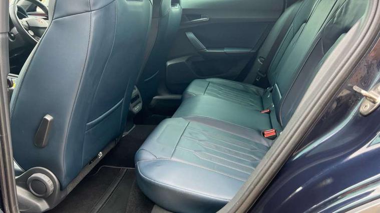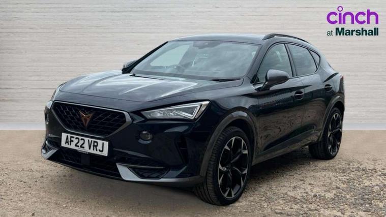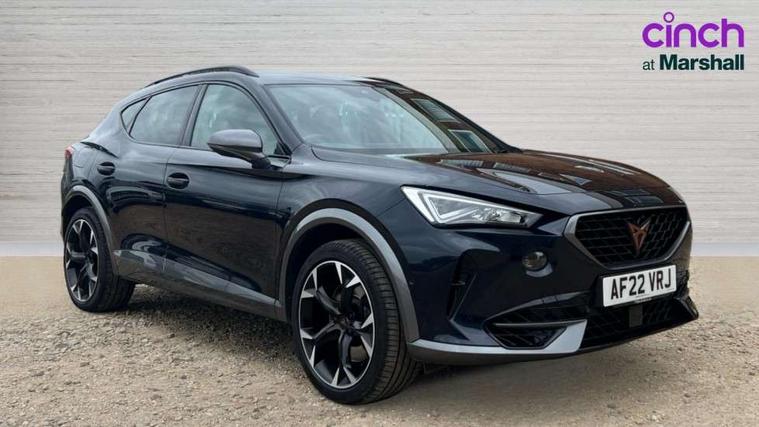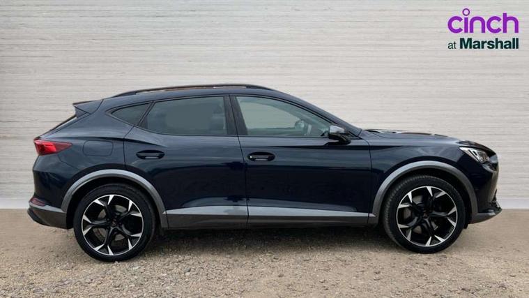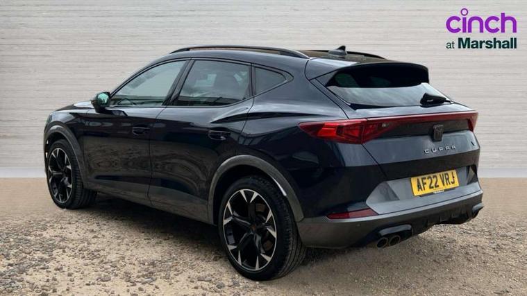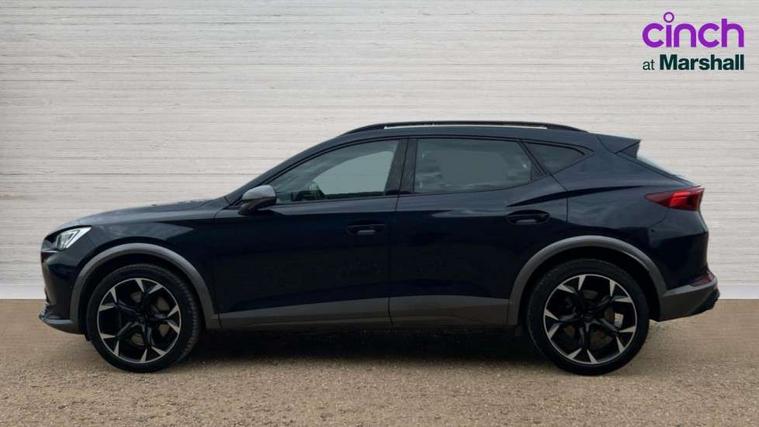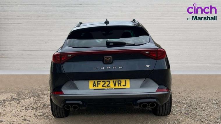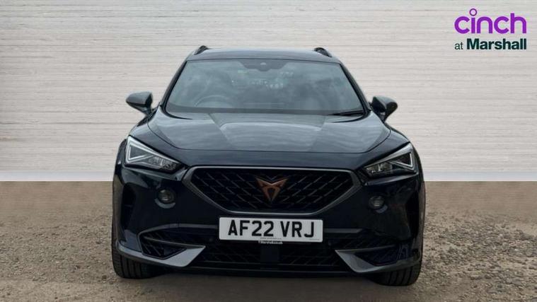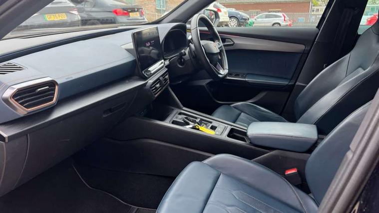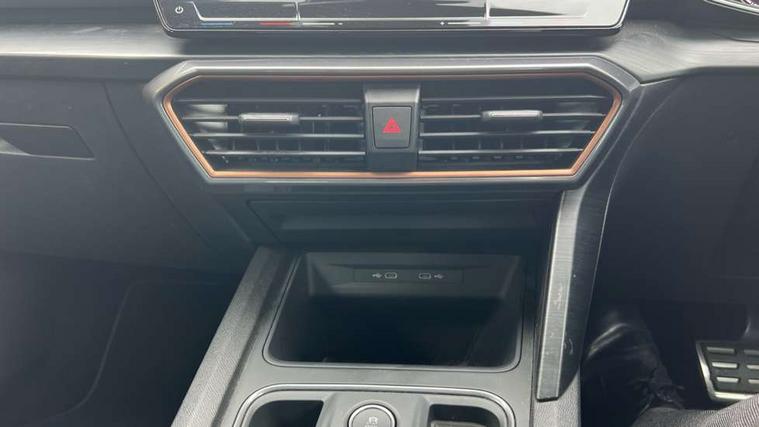 Digital cockpit and configurable dashboard, Driver alert system, Dynamic chassis control with driving profile selection (Comfort, Sport, CUPRA, Individual), E-call, Forward collision warning with automatic braking, Lane assist, Park assist (inc front/rear parking sensors), Predictive adaptive cruise control with speed limiter, RPM, trip computer, outside temp gauge, instrument light brightness, low fuel warning light, lights on reminder, gearshift indicator, Service interval indicator, Speed sensitive power steering, Start/stop system with regenerative braking, Virtual pedal and electric tailgate, Wireless apple carplay, Wireless phone charger, Electronic locking differential and dynamic traction support, Sports suspension with front shock absoption, 2 front and 2 rear USB type C sockets, Auxiliary input socket, DAB radio, Auto dimming rear view mirror, Body colour door handles, Body coloured bumpers, Dark grey wing mirror, Daytime running light with automatic headlight control and coming home feature, Dynamic headlight range control, Electric front/rear windows, Electrically adjustable heated and folding door mirrors with memory function, Front fog lamps with cornering function, Gloss black roof rails and window surrounds, LED Headlights, LED Taillights with dynamic indicator, Rain sensing wipers, Rear diffuser with twin exhaust pipe on each side, Rear side wing doors, Rear wash/wipe, Sports bumpers, Third brake light, Tinted rear windows, VZ logo rear badging, Welcome lights, 12v power supply in centre console, 12V socket, 12v socket in loadspace, 2 front and 2 rear reading lights, 230V socket, 3 seat bench in 2nd row, 60/40 split rear bench seat with armrest and mechanical seat release, Black headlining, Cupra sports pedals, Dust/pollen filter, Front and rear head restraints, Front centre armrest, Height/reach adjust steering wheel, Illuminated interior front door sills, Illuminated sunvisor with mirror, Isofix, Leather heated multi-function sports steering wheel with start stop, CUPRA mode button and gear shift paddles, Luggage tie-down hooks, Single front passenger seat, Three zone climate control with control panel in rear, Variable luggage/load compartment floor, Wraparound lighting, Genuine Nappa leather Pack - Cupra, Navigation system pack - Formentor, Safety and driving pack (XL) - Formentor, 3 point seatbelts on all rear seats, ABS, Brake control system - ESC and brake booster, Child proof door locks, Driver and front passenger airbags with front passenger airbag de-activation, Electronic parking brake, Front and rear disc brakes, Front side curtain airbags, Hill hold control, Seat belt reminder for front and rear seats, Tyre pressure monitoring system, Anti theft alarm system, Keyless entry and start system (KESSY), Locking wheel bolts, Copper and aluminium interior detailing, 19" 'Exclusive' machined sport matte black and silver alloy wheels, Space saver spare wheel,