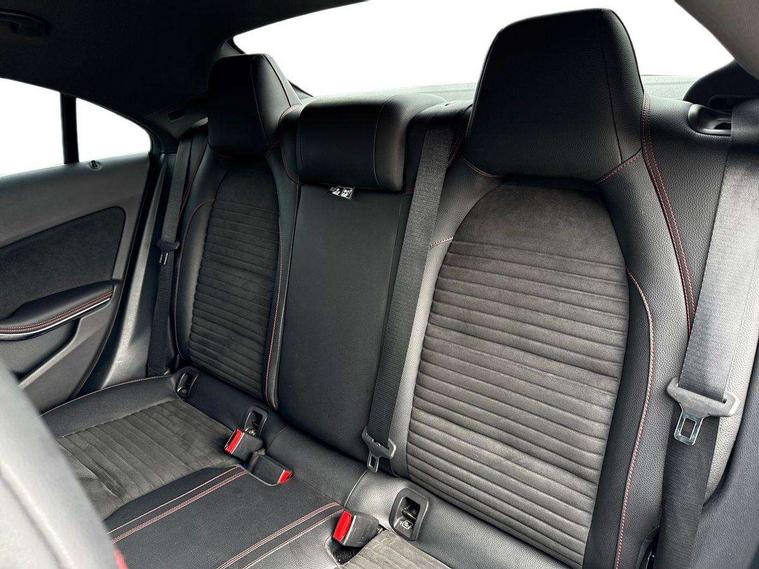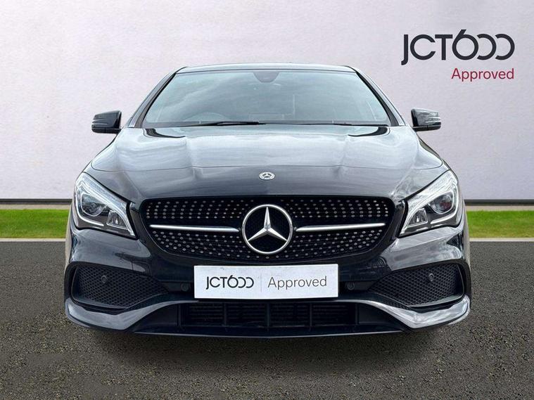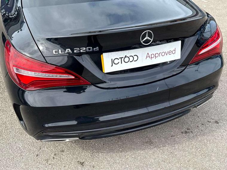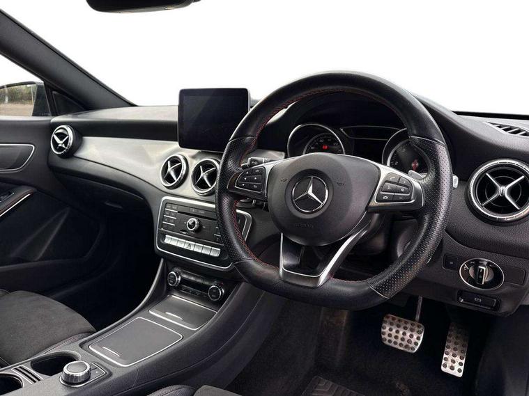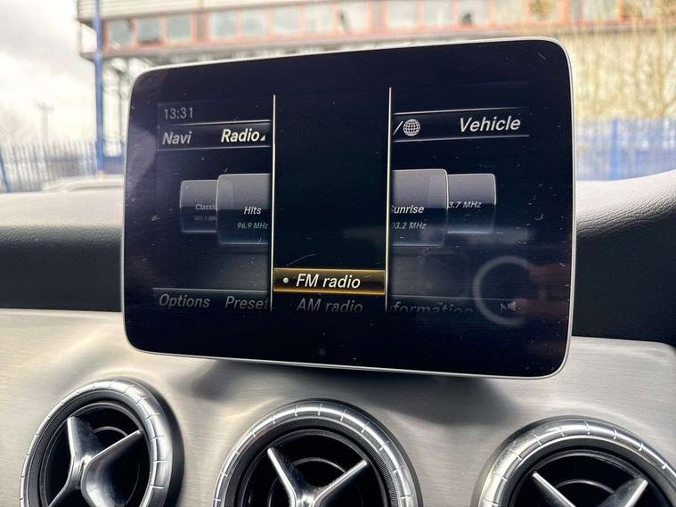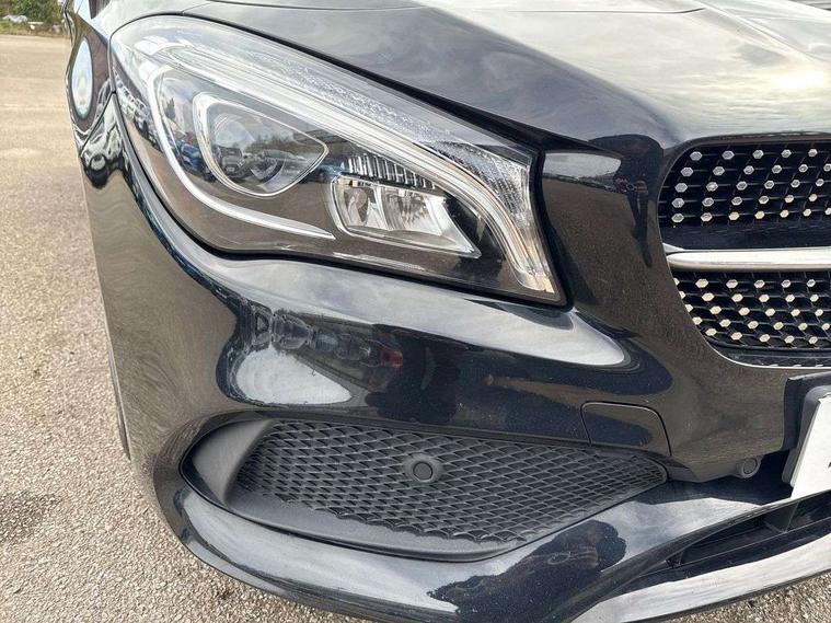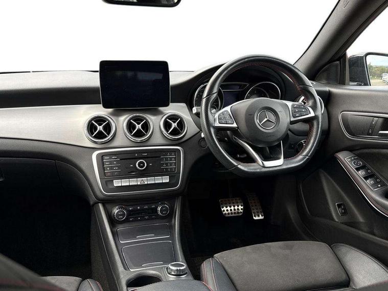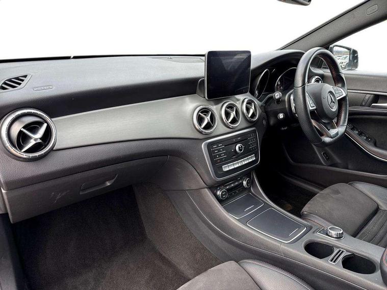8" colour display screen, Attention assist, Bluetooth system, Direct steering, Door/boot open warning light, DYNAMIC SELECT with a choice of driving modes (ECO, Comfort, Sport, Sport+ and Individual), ECO start/stop function, Lamp failure indicator, Low fluid warning light, Outside temperature gauge, Reversing camera, Service indicator (ASSYST), Trip computer, Diesel particulate filter, Lowered comfort suspension, Media interface, Mercedes Audio 20 radio/single CD, USB connection, Adaptive brake lights, AMG body styling, Auto dimming driver's door mirror, Auto dimming rear view mirror, Automatic headlights, Automatic rain sensing wipers, Black high gloss beltline, Body colour bumpers, Body colour door handles, Body colour side skirt, Diamond grille with pins in chrome and single louvre in high-gloss black with chrome inserts, Electric adjustable heated door mirrors, Electric folding door mirrors, Front and rear electric windows, Heated rear window with timer, High gloss black door mirror housing, LED headlights with LED daytime running lights, LED Indicators, LED tail lamp, LED third brake light, Privacy glass, Rear fog lights, 1/3 to 2/3 split folding rear seats, 3 spoke flat bottom multi-function sports leather steering wheel in black with topstitching in red, Auto Mercedes-Benz child seat recognition sensor, Brushed stainless steel sports pedals with rubber studs, Centre console with cupholders, Courtesy light in boot, Door sill illumination, Front centre armrest with storage box, Front door courtesy lamps, Front footwell lights, Front head restraints, Front seat cushion length adjustment, Front sports seats, Height adjustable front seats, Height/reach adjustable steering column, Illuminated glovebox, Illuminated storage compartment, Isofix rear child seat fastenings, Load securing rings in luggage compartment, Reading lights, Rear footwell lights, Rear head restraints, Seat cushion angle adjustment, Sunvisors with illuminated vanity mirrors, Thermotronic luxury automatic two zone climate control, Mirror pack - CLA, 3x3 point rear seatbelts, ABS with Brake Assist, Active bonnet, Adaptive brake system, ASR, Brake pad warning light, Child lock for rear electric windows, Child proof door locks, Crash responsive emergency lighting, Drivers knee airbag, Dual stage driver/passenger airbags, Electronic parking brake, ESP curve dynamic assist, Front and rear seatbelt reminder, Front brake callipers with Mercedes Benz lettering, Front passenger airbag deactivation, Front passenger seat occupancy sensor, Front side airbags, Hill start assist, Tyre pressure monitoring system, Warning triangle and first aid kit, Window airbags, Anti theft alarm system, Chrome surround electric key, Immobiliser, Keyless Go, Remote central locking, Chrome air vent surrounds, 18" AMG 10 spoke alloy wheels, Tirefit,