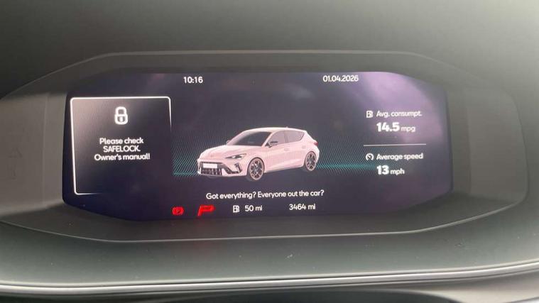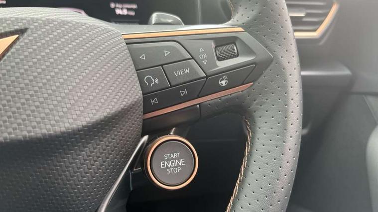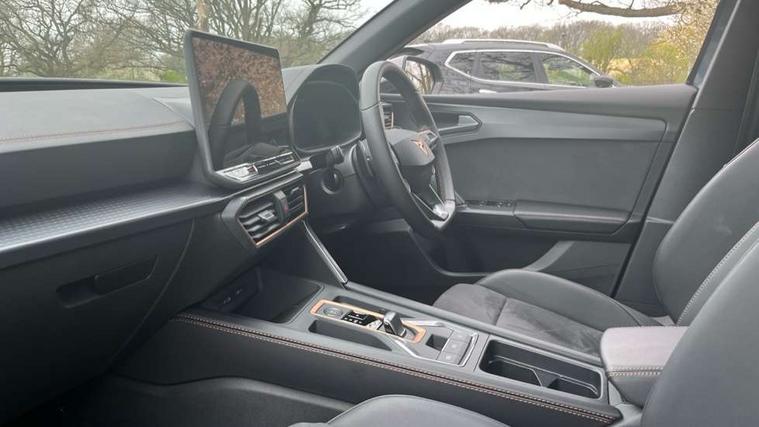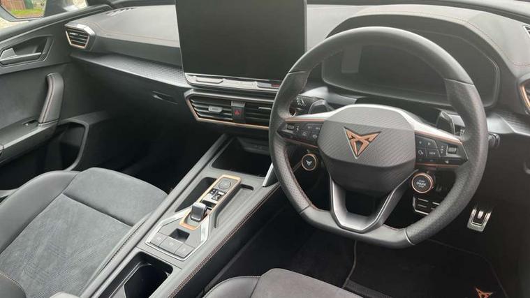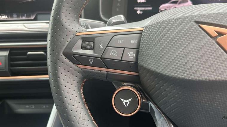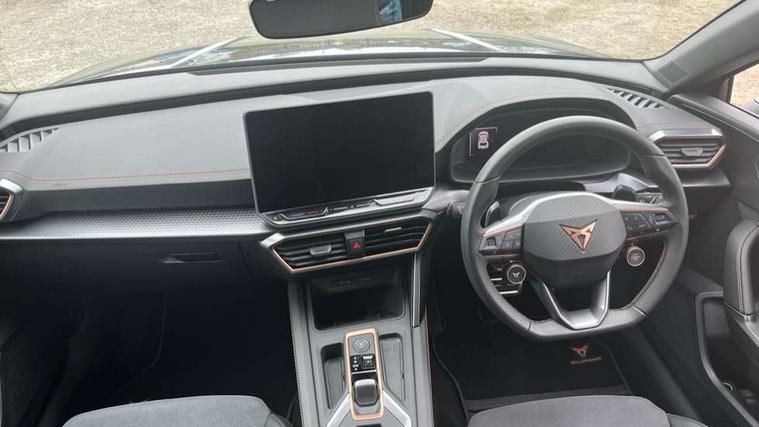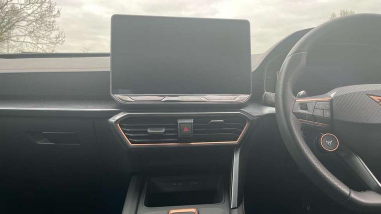 Adaptive cruise control with follow-to-stop and speed limiter, CUPRA drive profile selection with (Comfort/Sport/Individual), throttle response and gearshift mode, Digital cockpit, Dynamic road sign display, E-call, Front and rear parking sensors, Front assist with forward collision warning braking reaction to vehicles, pedestrians and cyclists, Full link smartphone integration with Mirror Link, wireless Apple CarPlay and wired Google Android Auto, Lane assist, Lockable tailgate, Rear view camera, RPM, trip computer, outside temp gauge, instrument light brightness, low fuel warning light, lights on reminder, gearshift indicator, Service interval indicator, Start/stop system with regenerative braking, Wireless phone charger, Auxiliary input socket, Auto dimming rear view mirror, Body colour door handles, Body coloured bumpers, Cupra sports bumpers, Dark tinted rear windows, Electric front/rear windows, Electrically adjustable, heated and folding door mirrors, High beam assist, LED front fog lamps with cornering function, LED headlights with dynamic turn signals, tail lights, rear fog lights with rear coast to coast lighting, LED rear fog lamp, Rain sensing wipers, Rear side wing doors, Rear wash/wipe, Separate daytime running light with automatic headlight control and coming home feature, Third brake light, Welcome light with logo projector in door mirrors, 12v power supply in centre console, 3 seat bench in 2nd row, 5 headrests, 60/40 split rear bench seat with armrest, Ambient lighting (glovebox, footwell, ambient lighting multicoloured), Black headlining, Cupra sports pedals, CUPRA Supersports, heated steering wheel with satellite buttons, Dinamica cloth upholstery, Electrically adjustable driver seat and lumbar support with memory function + manually adjustable passenger seat, Folding boot cover, Four x USB Type C ports (2 in front and 2 in rear), Front and rear reading lights X 4, Front centre armrest, Heated front seats, Height/reach adjust steering wheel, Illuminated interior front door sills, Interior wraparound lighting, ISOFIX points in outer rear seats with top tether anchorage points, Single front passenger seat, Storage pockets on rear of front seats, Sunvisors with illuminated mirror, Three zone climate control, Dynamic and comfort pack - Leon Cupra, Media system plus with 12.9" display + navigation pack - Leon Cupra, 3 point seatbelts on all rear seats, ABS, Brake control system - ESC and brake booster, Child proof door locks, Cupra black brake calipers, Driver and front passenger airbags with front passenger airbag de-activation, front side and curtain airbags, Electronic parking brake, Hill hold control, Rear disc brakes, Seat belt reminder for front and rear seats, Tiredness recognition system, Tyre pressure monitoring system, Anti theft alarm system with interior monitoring in cab, backup horn and towing protection, KESSY Advanced - Keyless start, keyless entry, Locking wheel bolts, Chrome and copper interior detailing, 19" Polar machined sport black and silver alloy wheel with 91Y tyres, Tool kit,