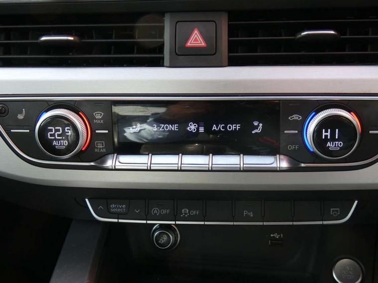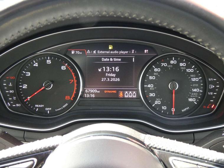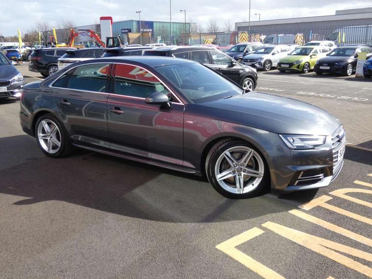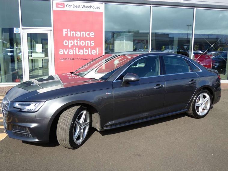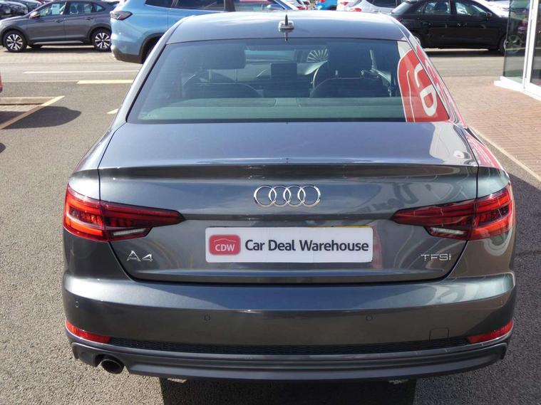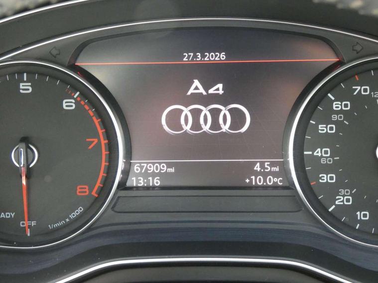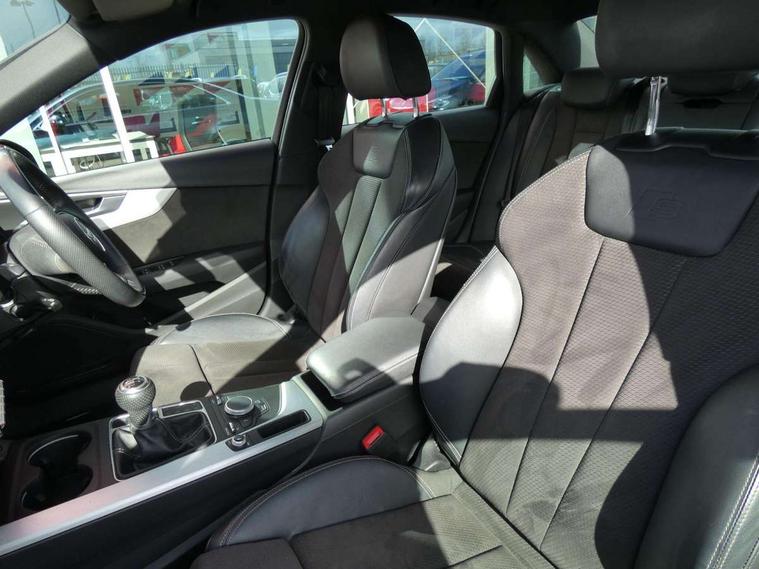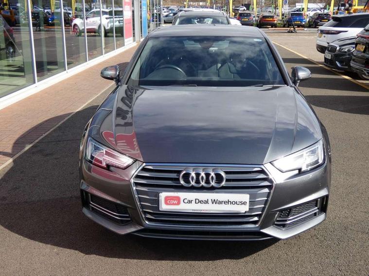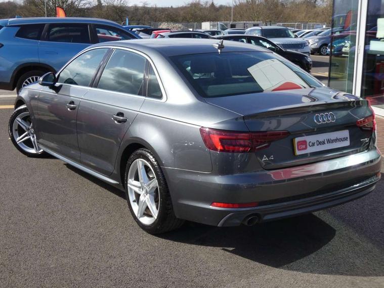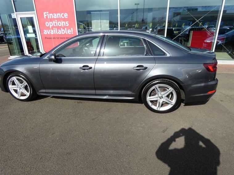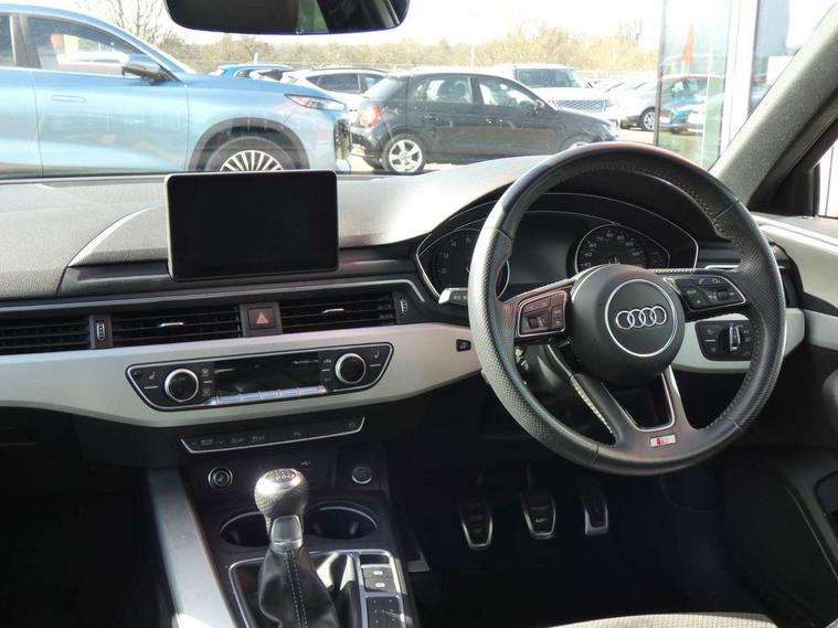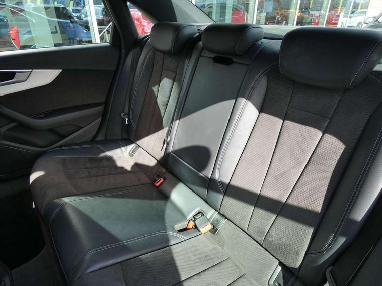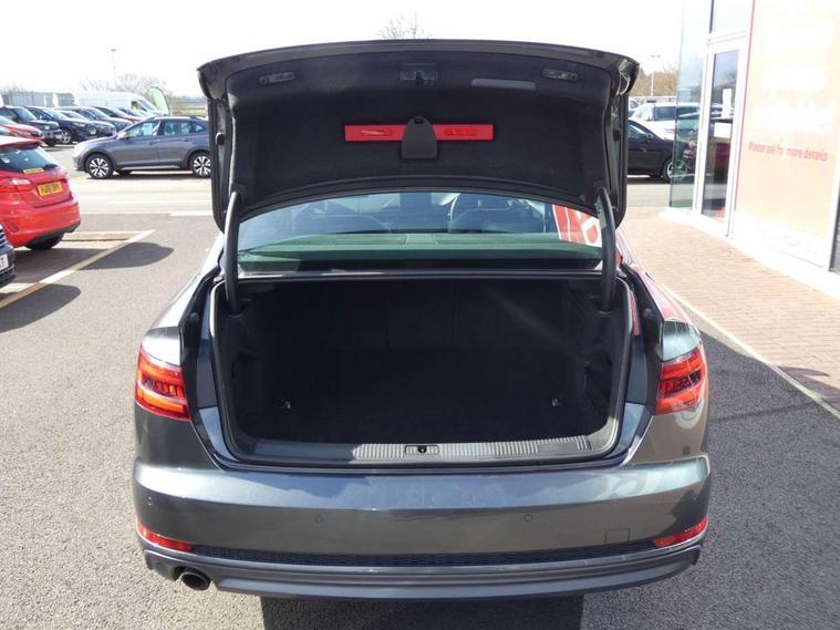 Audi drive select, Audi Pre sense collision avoidance, Audi smartphone interface, Auto boot lid opening, Colour driver's information system display, Electro-mechanical PAS, MMI SD card Navigation, Mobile telephone preparation - bluetooth interface, Service interval indicator, Stop/start button, Voice control system, 2 USB ports, Aux input, DAB digital radio module, MMI radio plus with CD player, Acoustic windscreen, Air inlets in titan black with two horizontal inlays in chrome, Aluminium window trim, Auto dimming rear view mirror, Automatic headlights + automatic windscreen wipers, Body colour bumpers, Body colour door handles, Body colour door mirrors, Chrome rolled exhaust, Electric adjustable heated door mirrors, Electric front windows, Electric rear windows, Headlight range control, High gloss black triangular aperture at rear door, LED daytime running lights, LED indicators in door mirrors, Rain and light sensors, Rear diffuser in Twilight grey matt, Twilight grey matt radiator grille with chrome inlay, 3 zone climate control, Black cloth headlining, Front centre armrest with 12v socket, Front headrests, Front/rear floor mats, Illuminated door sill finishers, Isofix child seat preparation for front passenger/outer rear seats inc passenger airbag deactivation, Jack and tool kit, Luggage compartment carpet, Perforated leather gearknob, Reach + rake adjustable steering column, Rear headrests, Split folding rear seats, Stainless steel foot rest, Stainless steel pedals, Sunvisors with vanity mirrors, Top tether anchor plate for isofix child seat, Non Smokers pack, S line exterior styling pack - A4 Saloon, 3 point seatbelts on all rear seats, ABS/EBD, Active bonnet, Adaptive driver and front passenger airbags, EDL + ASR, Electromechanical parking brake, ESP, First aid kit, Front head airbags, Front seatbelt pretensioners + load limiters, Front side airbags, Multi-Collision braking, Seatbelt warning, Traction control, Tyre pressure monitoring system, Warning triangle, Anti theft alarm, Keyless Start, Locking wheel bolts, Remote central locking, Thatcham category 1 alarm + immobiliser, Space saver spare wheel,