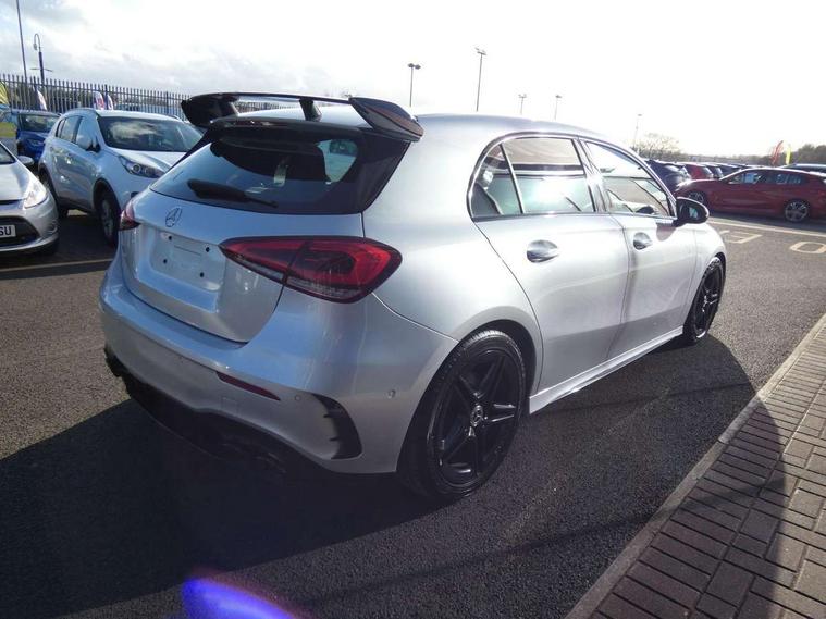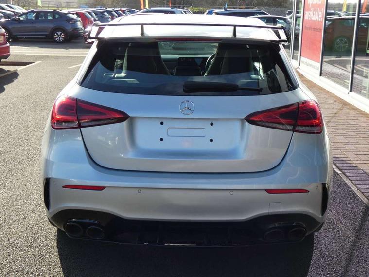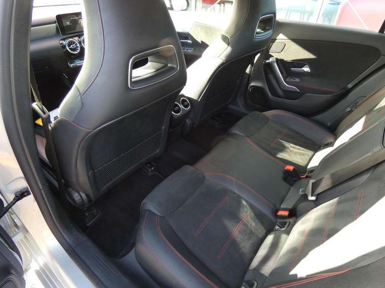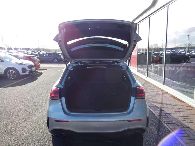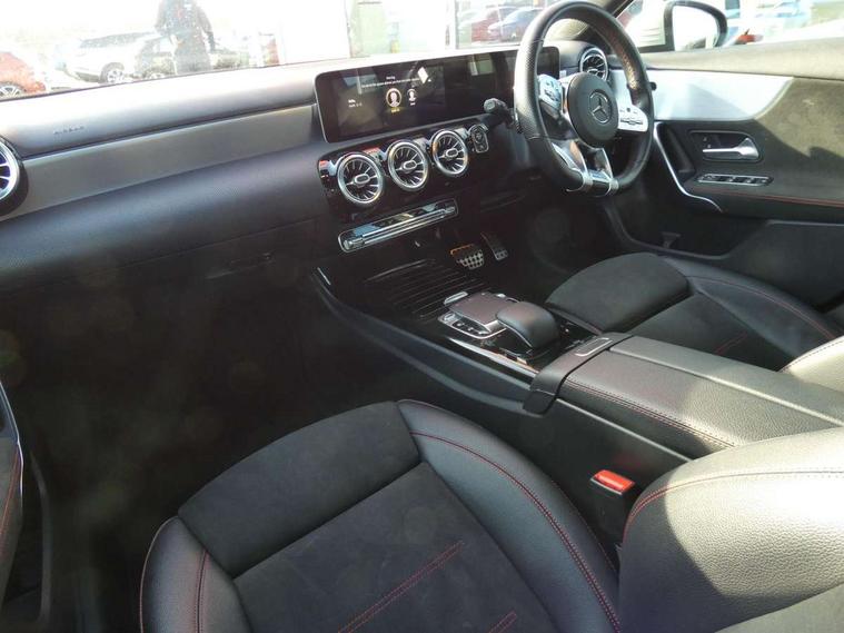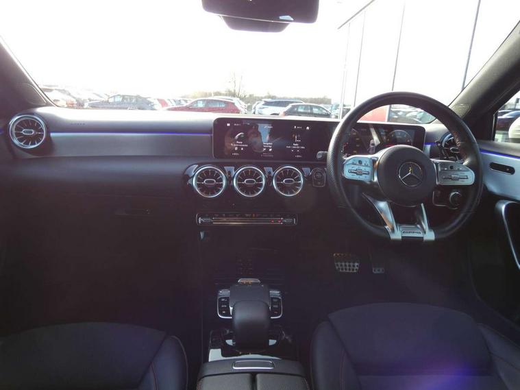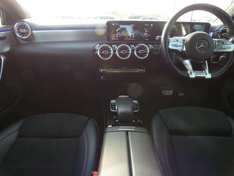 10.25" Digital instrument cluster display screen, 10.25" media display, 180 degree rear view camera with parking guidelines, Active lane keep assist, Active park assist with parktronic system including front and rear parking sensors, Attention assist, Brake pad wear indicator warning light, Direct steering, DYNAMIC SELECT with a choice of driving modes (ECO, Comfort, Sport and Individual), ECO start/stop function, Fluid level warning indicator for fuel, oil, coolant and washer fluid, Hard-disk navigation, Lamp failure indicator, Mercedes me connect including emergency call system, accident recovery, breakdown and maintenance management, Outside temperature gauge, Radio aerial integrated into roof spoiler, Service indicator (ASSYST), Speed sensitive power steering, Trip computer, Voice activation, Lowered comfort suspension, DAB Digital radio, Dual bluetooth interface, 2 USB ports (type C), MBUX multimedia system with DAB digital radio and touchpad including satellite navigation, Mid-range sound system, 4 Electric Front and Rear windows, Active aerodynamics with AIRPANEL in the front apron, Adaptive brake lights, AMG front, rear apron and side skirts, Blue tinted glass, Body colour bumpers, Body colour door handles, Body colour side skirt, Body coloured door mirrors, Chrome beltline trim, Diamond radiator grille with chrome pins and silver louvre + chrome insert, Electric adjustable and heated door mirrors with integrated LED side indicators, Exhaust system - Twin trapezoidal tailpipes in polished stainless steel, Headlamp assist automatic headlamp activation, Heated glass rear windscreen + timer control, LED high performance headlamps with integrated LED daytime running lights, LED tail lamp, LED third brake light, Rain sensor windscreen wipers, Rear fog lights, Rear wiper, 12V socket, 3 Spoke flat bottom leather multi function steering wheel with perforated leather in grip area, 40:20:40 split folding rear seats, Air vents surround and cruciform nozzle in silver chrome, AMG floor mats with red stitching, Artico man-made leather/Microfibre Dinamica upholstery with red contrast stitching, Auto Mercedes-Benz child seat recognition sensor, Black roof lining, Brushed stainless steel sports pedals with rubber studs, Controller on centre console with chrome surround, Cup holder and stowage compartment lighting, Freight packaging without tie-down hooks, Front centre armrest with storage compartment, Front door sills with Mercedes Benz lettering, Front footwell lights, Front reading lamps, Front seat backs luggage nets, Front seat cushion length adjustment, Front signal exit lamp, Front vanity lights, Gearshift paddles on steering wheel, Handle recess/closing light, Heated front seats, Height/reach adjustable steering column, Illuminated door sills, Illuminated glovebox, Interior lighting - 64 colour Ambient lighting, ISOFIX Child seat top tethers and anchor fixings, Luggage compartment cover, Manual height adjustable front seats, Oddments tray lighting, Rear armrest, Rear head restraints, Rear Reading Lamps, Seat occupancy sensor for front passenger seat, Spectacles compartment for driver, Sports seats with integrated headrests, Storage compartment under load area floor, Sunvisors with illuminated vanity mirrors, Touchpad, Touchpad illumination, Twin front cupholders, Two zone thermotronic luxury automatic climate control, Mirror package - A Class, Seat comfort pack - A Class, 3 rear 3 point seatbelts, ABS with Brake Assist, Active bonnet, Adaptive brake assist with hold function and hill start assist, Brake calipers with Mercedes-Benz lettering + perforated brake discs, Childproof locks manually operated for rear doors and electrically operated for rear power windows, Crash responsive emergency lighting, Driver and passenger head and side airbags, Drivers knee airbag, Dual stage driver/passenger airbags, Electronic parking brake, ESP curve dynamic assist, ESP with ASR, Front and rear seatbelt reminder, Tyre pressure monitoring system, Warning triangle and first aid kit, Window airbags, Alarm system/interior protection/immobiliser, Keyless Go Lock/Unlock function, Remote central locking and crash sensor with emergency opening function, Black seatbelts, 18" AMG 5 twin spoke light alloy wheels in titanium grey with highsheen finish, Summer tyres, Tirefit sealant kit,