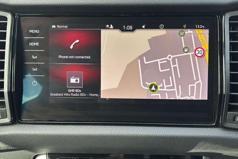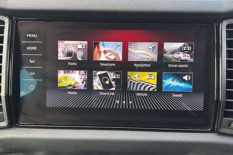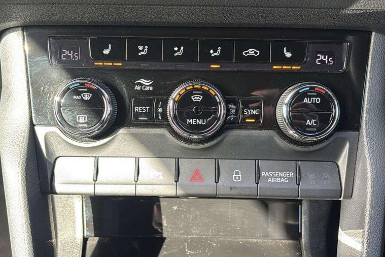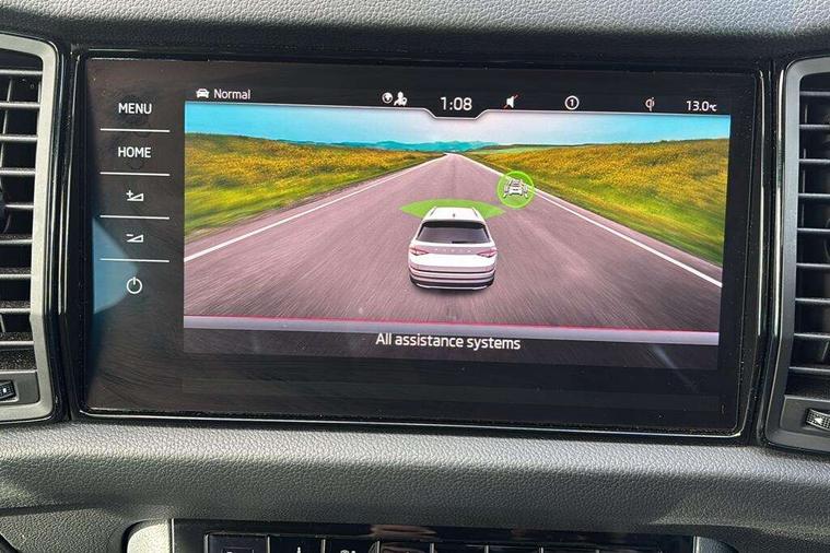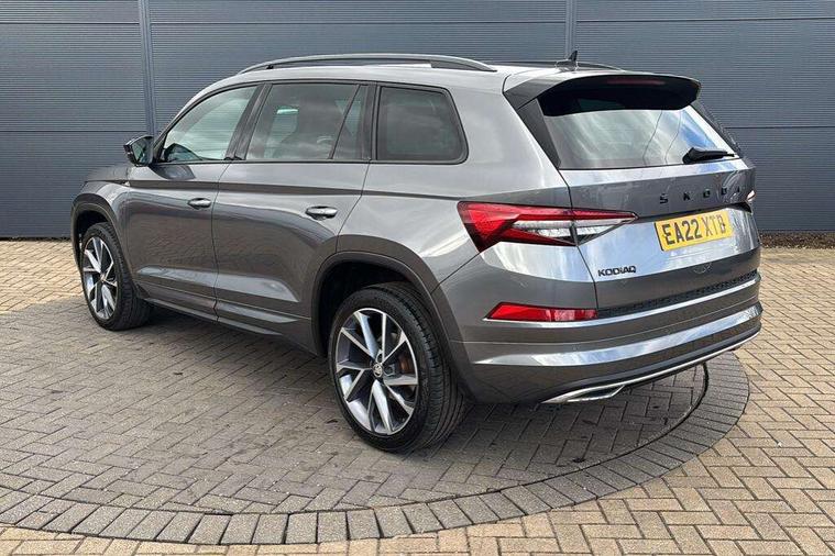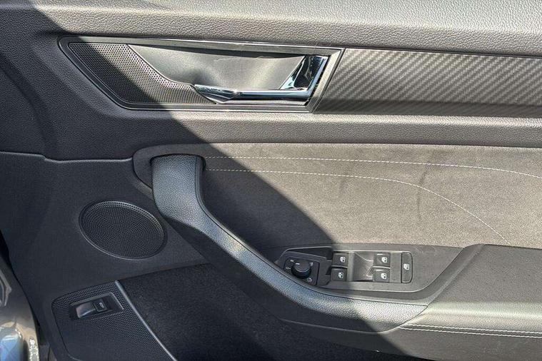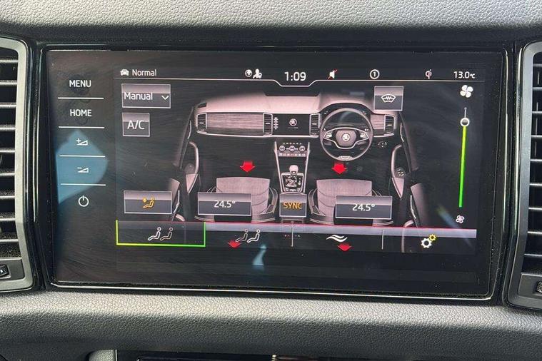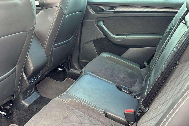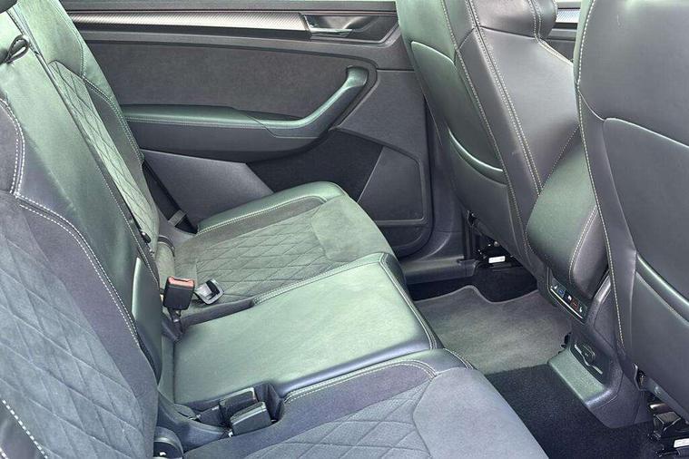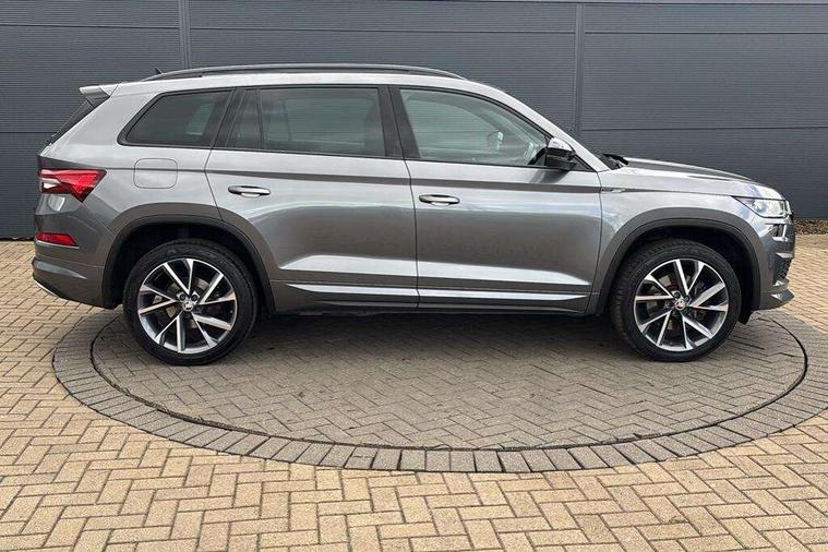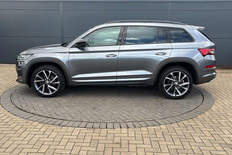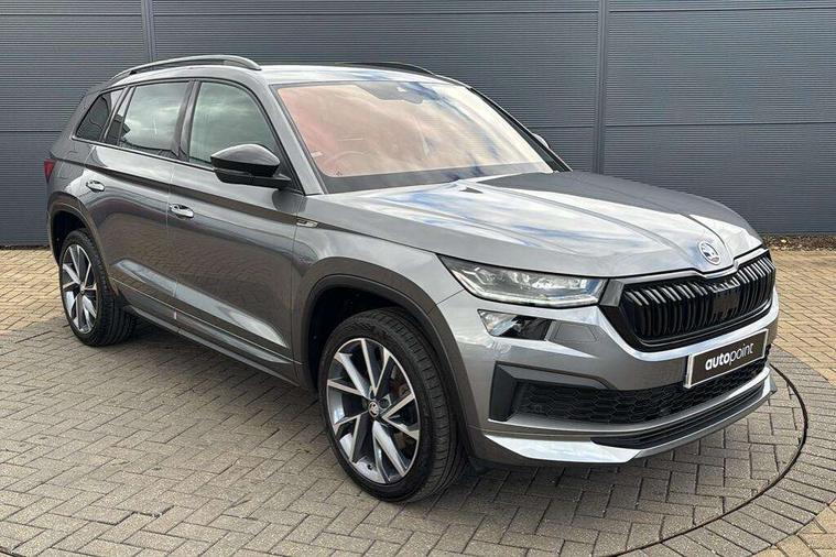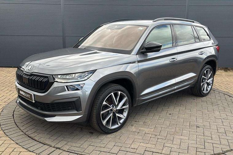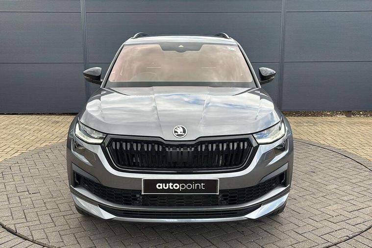 Bluetooth system, Columbus satellite navigation with 9.2" touchscreen, integrated Wi-Fi, web radio, Digital voice enhancement, E-call, ECO Stop/start function, Exterior temperature indicator, Progressive steering, Rear view camera, Smartlink wireless for apple carplay and wired for android auto, Speed limiter, Tailgate unlocking from outside, USB C Port x 2 in front centre console, Wireless charging, 8 Speakers, DAB Digital radio, Aero front windscreen wipers with intermittent function, Aero rear window wiper, Auto dimming rear view mirror, Black roof rails, Black sports styling including front grille and window surrounds, Black wheel arch surrounds, Body colour bumpers, Body colour door handles, Electric adjustable/heated/folding door mirrors, driver side auto dimming with boarding sports and memory function, Electric front and rear windows, Extended rear spoiler with finlets in gloss black, Front fog lights, Full LED matrix headlights with AFS (adaptive front light system), cornering function and AWL (all weather lighting system), Gloss black door mirrors, Headlight washers, Heated rear window, Invisible tailpipe, LED daytime running lights, LED rear fog light, LED third brake light in rear spoiler, Light assistant (coming/leaving home/tunnel light), Off-road style lower front bumper element, Privacy glass, Rain and light sensors, Rear diffuser, Rear LED lights (high functionality) with welcome effect and dynamic indicators, Rear side wing doors, Safety reflectors on front and rear doors, Sportline badge on front fender, Sports front and rear bumpers including lower rear chrome strip, Tailgate lettering in Black, Window control switches with black trim, Without engine designation, 12V socket in boot, 2 rails with 2 hooks, 2 seat bench in 3rd row, 3 seat bench in 2nd row, 4 foldable roof handles with rear coat hooks, 60:40 foldable rear seat with sliding adjustment and backrest angle adjustment, Aluminium pedals, Black roof headlining, Bottle holders in door panel in the 1.5 litre front and 1 litre rear, Cargo storage compartments, Chrome headlight control button, Chrome interior door handles, Coat hooks on B pillar, Covered storage compartment on driver side, Front centre armrest with storage compartment, cup holder and 12V socket, Front courtesy lights, Gear shift lever with chrome frame and black gloss insert, Grey stitching in front and rear armrests and door armrests + door inserts, Height adjustable front headrests, Illuminated and cooled glovebox, Illuminated luggage compartment, Isofix child seat fittings in outer rear seats with top tether, Manually adjustable steering column, Microsuede door panels, Net programme in boot (1x horizontal Net, 2x vertical Nets), Overhead glasses storage compartment, Pollen filter, Rear centre armrest with cupholders, Single front passenger seat, Sliding trunk cover, Small Bags on the inner sides of the front backrests, Sports seats, Sunvisors with illuminated vanity mirrors, Three rear height adjustable headrests, Ticket holder on A Pillar, Umbrella in door panel, Variable boot floor, LED Interior light pack - Kodiaq, Auto door release and activation of warning lights in the event of an accident, Child locks on rear doors, Driver and front passenger airbag with knee airbag and front passenger airbag deactivation, Electronic parking brake with hill start assist, Emergency rear braking signal, ESC (incl. ABS+MSR+ASR+EDS+HBA+DSR+RBS+MKB), Front assist with autonomous emergency braking, Front side airbags with curtain airbags, Fuel cut off safety device, Height adjustable front 3 point seatbelts + pretensioners, Hill hold control, Rear disc brakes, Safety vest holder in door, Seat belt reminder for all seats, Three point rear seat belts, Two tone horn, Tyre pressure monitor, Alarm with interior monitoring and tilt sensor with safe function, Anti-theft wheel bolts, Immobiliser, Keyless entry and start system (KESSY), Remote central locking with 2 keys, Black air vent surround, Carbon finish dashboard and door inserts, Grey stitching in dashboard, 20" Vega Anthracite alloy wheels, Temporary spare wheel (space saver),