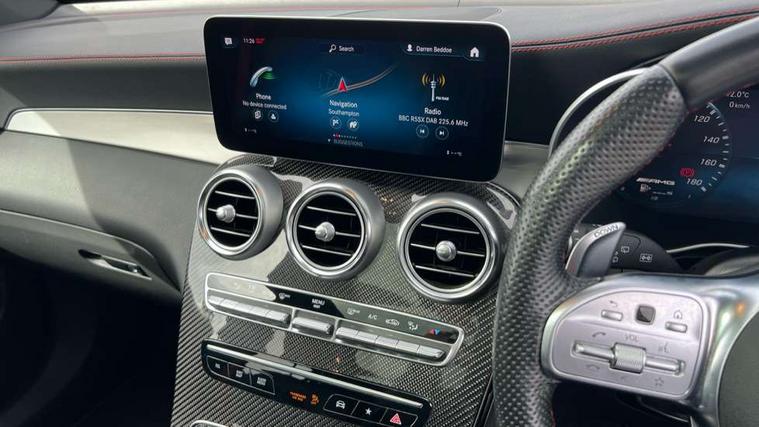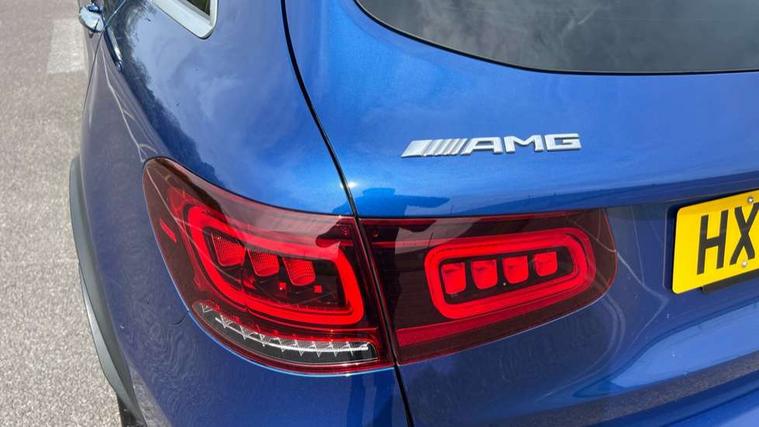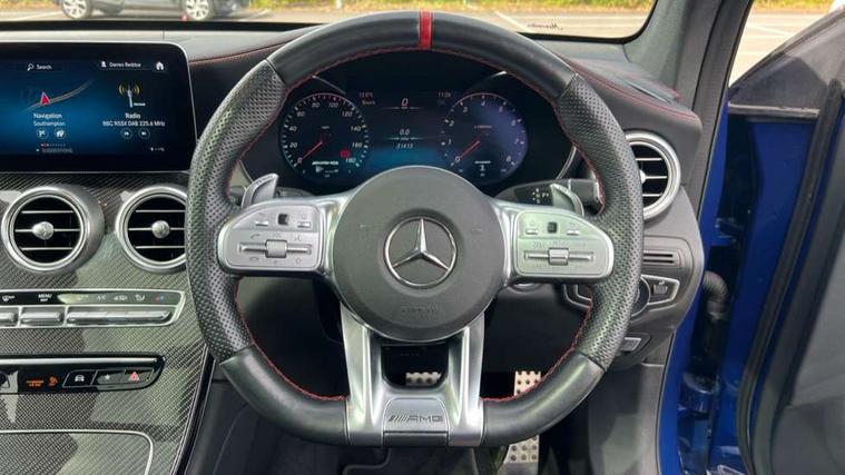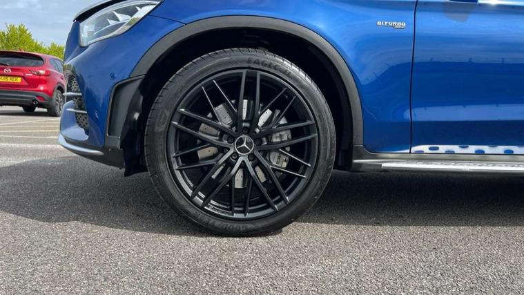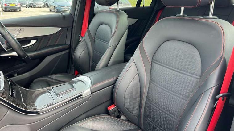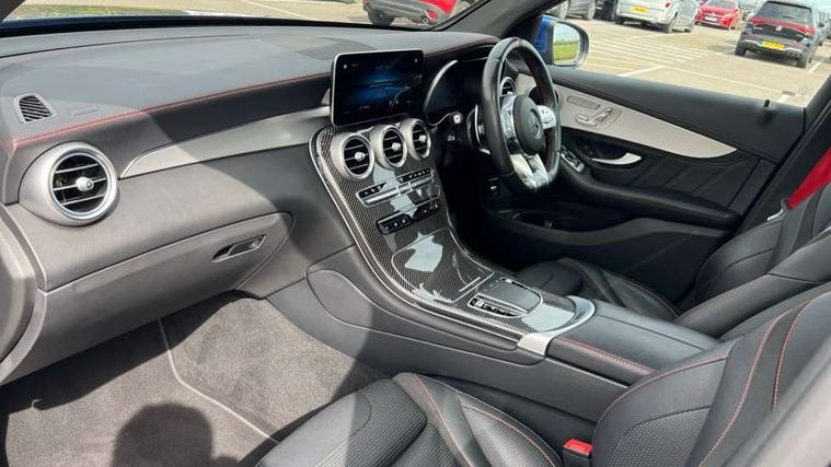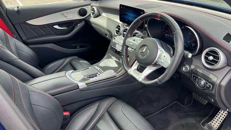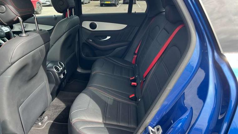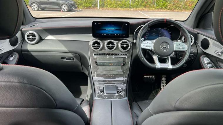 360 degree view camera, Active parking assist with parktronic system, Attention assist, Bluetooth interface for hands free telephone, Collision prevention assist plus, DYNAMIC SELECT with a choice of driving modes (ECO, Comfort, Sport, Sport+ and Individual), Easy pack automatic powered tailgate, eCall emergency call system, ECO start/stop function, Hard disk navigation, Hey Mercedes Voice activation, Instrument cluster with12.3-inch digital instrument cluster display. High resolution instrument cluster screen with choice of three display styles, MBUX Interior assistant, Mercedes connect me with remote online services, Multi function trip computer, Outside temperature display, rear seatbelt status indicator, Remote boot release, Service indicator (ASSYST), Smartphone integration with Apple CarPlay and Android auto, Traffic sign assist, 66 litre fuel tank, AMG electronic rear axle limited slip differential lock, AMG performance 4MATIC+, AMG ride control air suspension for front and rear axles with continuously adjustable damping, AMG SPEEDSHIFT TCT 9G 9-speed automatic transmission with steering column gear selector, DIRECT SELECT steering wheel gearshift paddles, Petrol Particulate Filter (PPF), 5 speakers, Frontbass loudspeakers, MBUX multimedia system with DAB digital radio and touchpad, Media display 10.25-inch touchscreen display, Pre installation for Mercedes Benz Link, USB ports x 2 in centre console, Adaptive brake lights, Aluminium roof rails, AMG bodystyling front apron in jet wing design with silver chrome front splitter, AMG bodystyling with 2 black louvres in outer air intakes, AMG bodystyling with rear apron and diffuser fins, AMG bodystyling with side sill panels, AMG Performance exhaust, AMG radiator grille with black vertical louvres and trim strip in high gloss chrome, Body colour door mirrors, Body coloured bumpers, Electric panoramic glass sunroof, Electric windows one touch open/close, Electrically adjustable and heated door mirrors, Front, side and rear exterior chrome trim, Headlamp assist automatic headlamp activation, High level LED brake light, LED high performance headlamps with integrated LED daytime running lights, LED tail lamp, Motor way mode function and locator lighting, Privacy glass with dark glass from B pillar backwards, Rain sensor windscreen wipers, Range adjustable headlights, Rear side wing doors, Rear wiper, Roof spoiler, Running boards, Tinted glass all round with single layer safety glass, Tinted rear windows, Two chrome plated tailpipe trim elements, Variable front intermittent wipers, 2 way rear head restraints, 40:20:40 split folding rear seats, Ambient lighting, AMG floor mats with edging and embroidered AMG lettering, AMG sports seats, Artico man-made leather upper dashboard with contrast topstitching, Automatic child seat recognition sensor, Black roof lining, Dividing net - rear, Double cup holder in centre console, Easy-pack removable load compartment cover, Flat bottomed multifunction sports steering wheel in black nappa leather, embossed in central grip, with silver chrome steering with red topstitching, Front armrest with storage box, Front door sills with Mercedes Benz lettering, Front head restraints, Front passenger seat, Heated front seats, Heated steering wheel, Illuminated and lockable glove compartment, Leather upholstery, Rear top tether child seat ISOFIX attachment, Sports pedals with stainless steel surfaces and rubber studs, Steering wheel with touch control buttons, THERMOTRONIC 3 zone automatic climate control, Interior lighting pack - GLC, Memory pack - GLC, Mirror pack - GLC, Storage pack - GLC, 3 rear 3 point seatbelts, Active bonnet, Adaptive brake system with HOLD function and brake drying in the wet, ASR, Black seat belts, Brake calipers with Mercedes-Benz lettering + perforated brake discs, Child proof door locks, Dual-stage airbags - driver and front passenger, driver knee bag and window bags for driver, front passenger and rear passengers, Electronic parking brake, Electronic stability programme (ESP) with curve dynamic assist and cross wind assist, Front and rear seatbelt reminder, Front passenger seat occupancy sensor, Hill hold function, Tyre pressure monitoring system, Warning triangle and first aid kit, Alarm system/interior protection/immobiliser, Automatic door locking, Keyless Go entry and starting function, Remote central locking, AMG carbon-fibre with light longitudinal grain aluminium trim, 21" AMG 5 twin spoke design alloy wheels painted in black with high sheen finish, Summer tyres, Tirefit tyre sealant kit,