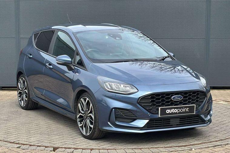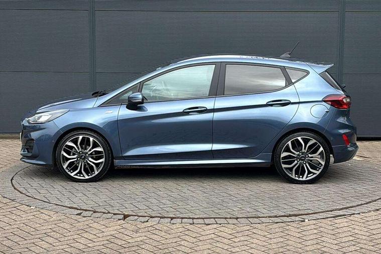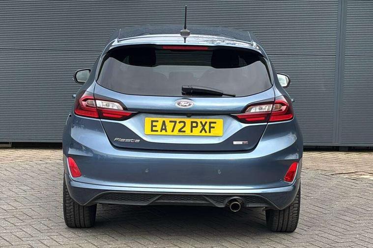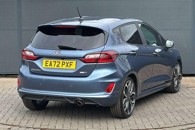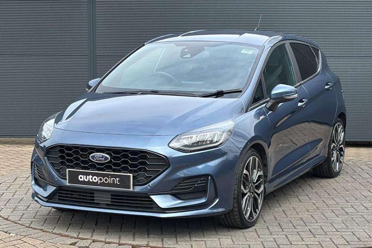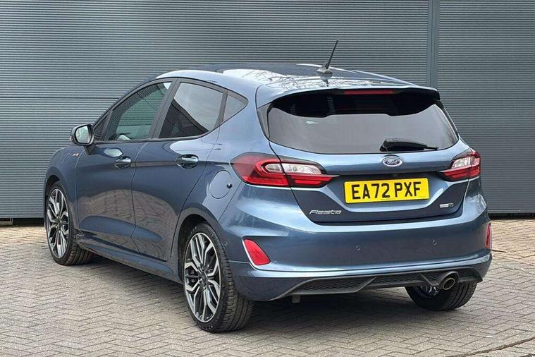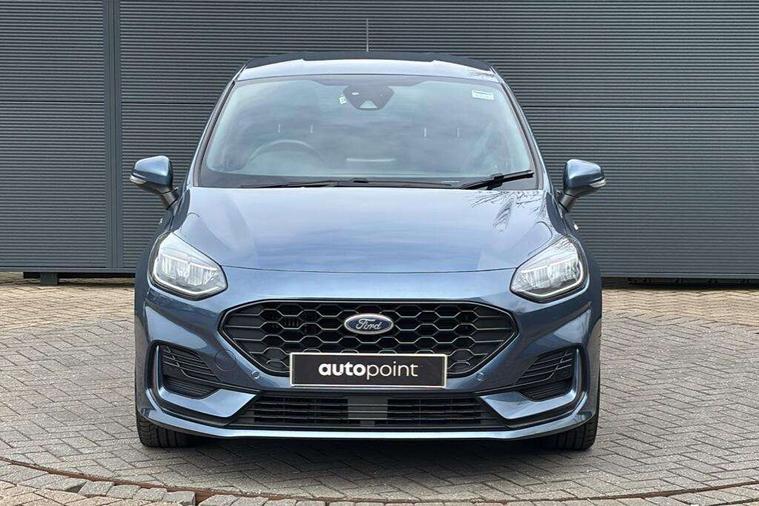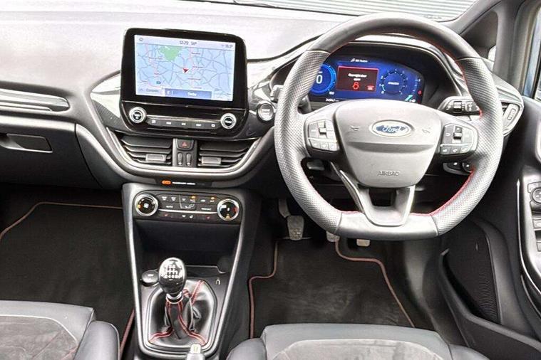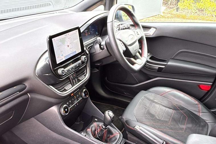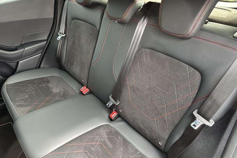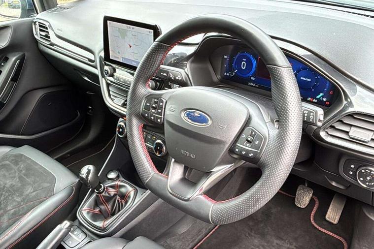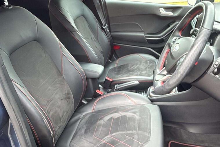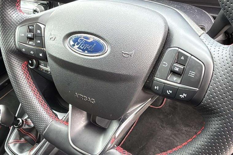 Driver alert system, Electric power steering, Ford easy fuel, Lane keep assist, Lane keeping aid, Rear parking distance sensors, Rear view camera, Selectable drive modes (Normal, Sport, Track), Trip computer, Sports suspension, 3rd brake light, Auto high beam, Automatic headlights, Body colour bumpers, Body colour large rear spoiler, Body coloured electrically operated with side indicators, Electric front windows/one touch facility, Electric rear windows, LED rear lights, Quickclear heated windscreen, Rain sensing wipers and auto dimming rear view mirror, Rear privacy glass, Rear side wing doors, Rear wiper, Unique ST-Line grille, full bodystyling kit and large body coloured rear spoiler, 3 rear headrests, 3 seat bench in 2nd row, 4 way manually adjustable passenger seat, Adjustable head restraints, Black headlining, Centre console with opening armrest, 2x cupholders, 12v and USB, EATC - Electronic Auto Temperature control, Leather gear knob, Manual 4-way driver seat adjust, Premium floor mats, Sensico partial premium leather upholstery with red stitching, Sensico wrapped steering wheel, Single front passenger seat, Winter pack [GTBAB]- Fiesta, 3 point seatbelts on all rear seats, Electronic stability control with hill start assist, Front and rear seat belt warning, Manual child lock in rear doors, Tyre pressure monitoring system, Ford keyfree system with Keyless entry and keyless start, MyKey system, Remote central locking, Thatcham alarm with power door dead locks, 18" 5x2 spoke alloys with pearl grey machined finish,