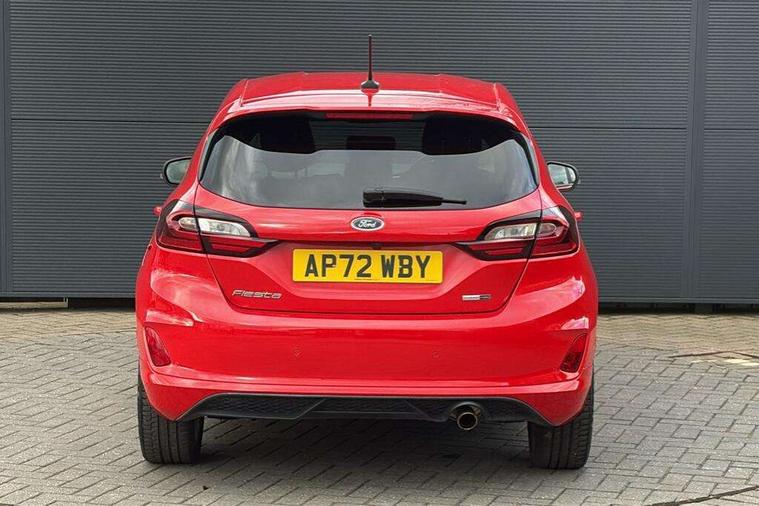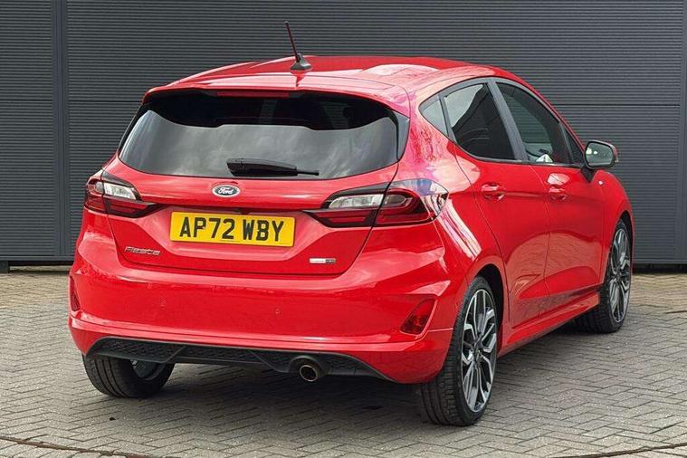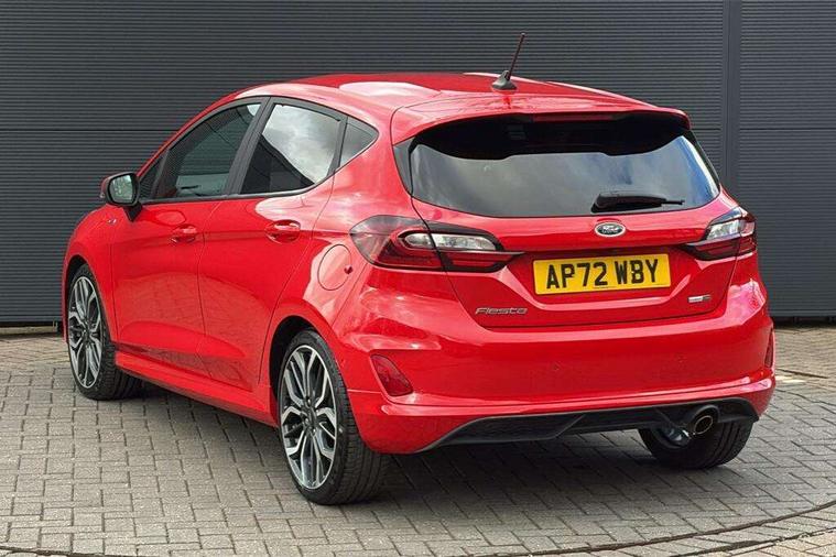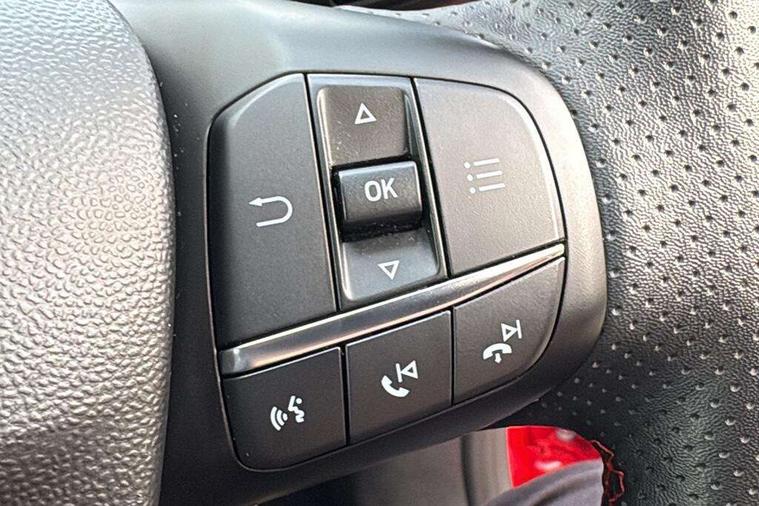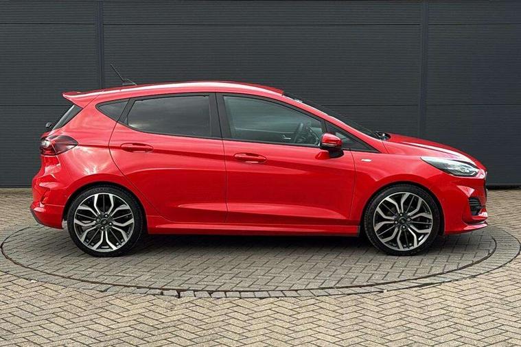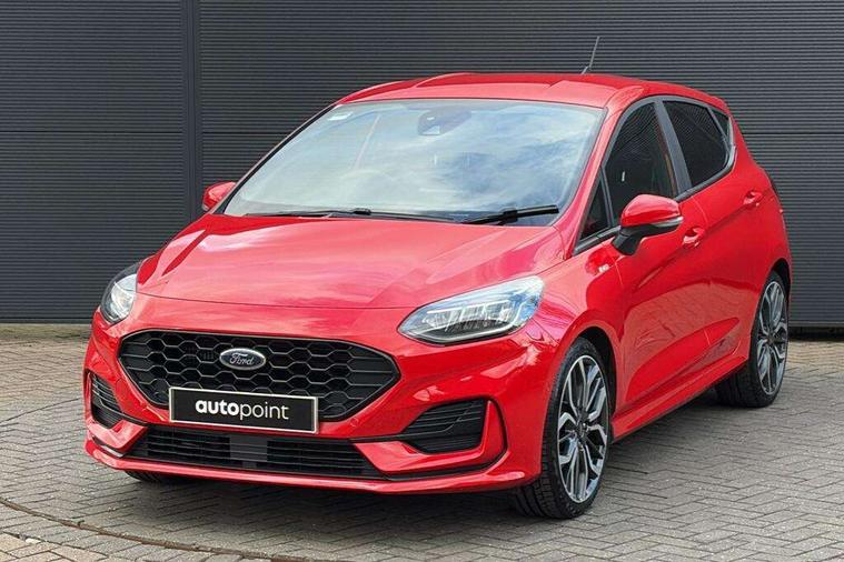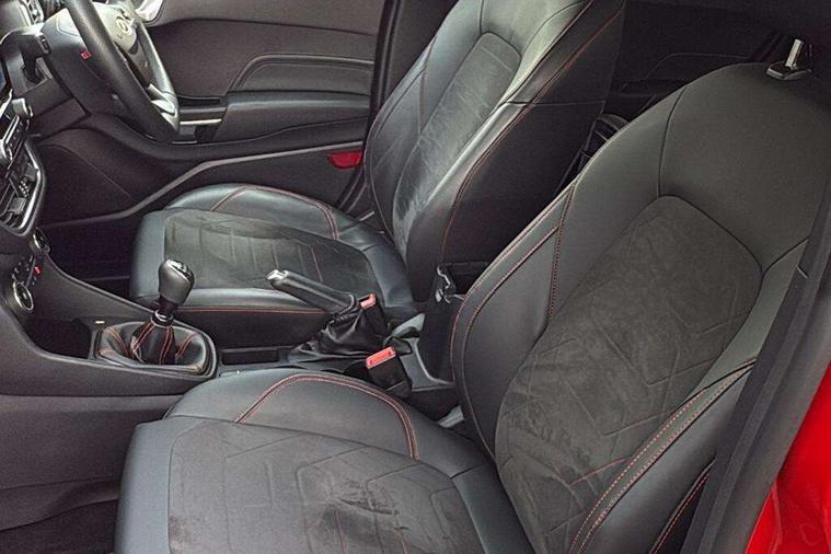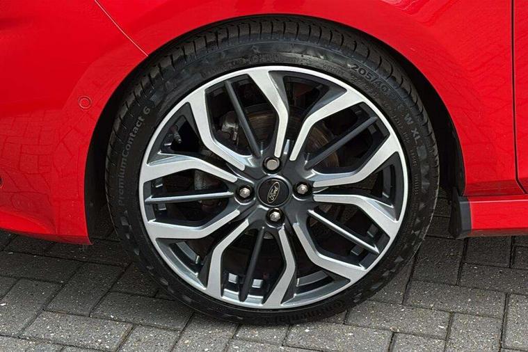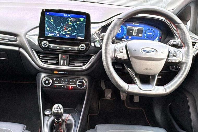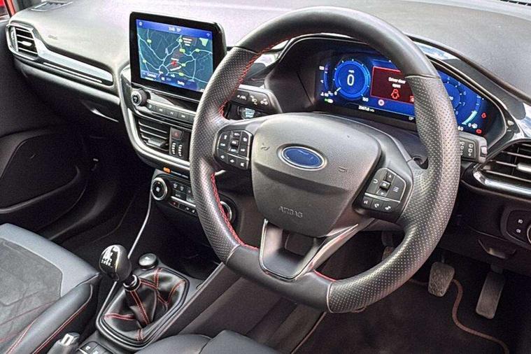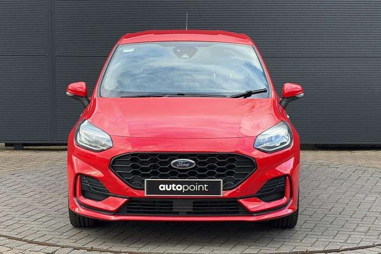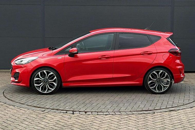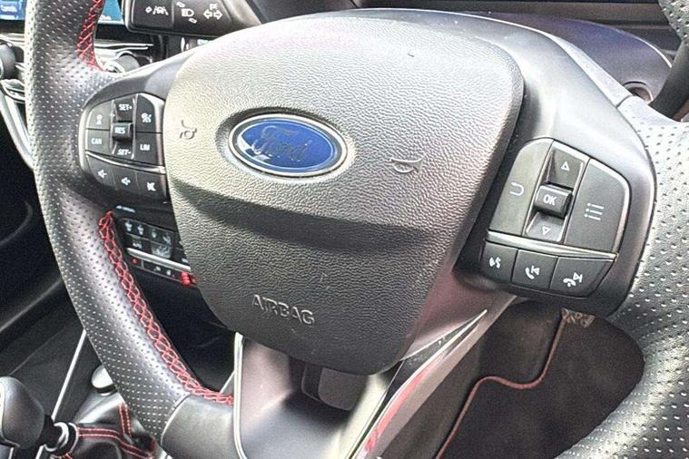 4.2" TFT instrument cluster screen, Bluetooth system, Electric power steering, Ford easy fuel, Rear parking distance sensors, Selectable drive modes (Normal, Sport, Track), Traffic sign recognition, Trip computer, Sports suspension, 2 USB ports, Auxiliary input socket, B&O Premium audio system with 8" touchscreen, 10 speakers, 360 degree sound system, Ford SYNC 3 navigation system and Ford pass connect, DAB Digital radio, Steering wheel mounted controls, Auto high beam, Body colour bumpers, Body colour door handles, Body colour large rear spoiler, Body coloured electrically operated and heated door mirrors with side indicators, Cornering front fog lights, Electric front windows/one touch facility, Electric rear windows, LED Night signature to rear lights, Power foldable door mirrors with puddle lights, Quickclear heated windscreen, Rain sensing wipers and auto dimming rear view mirror, Rear privacy glass, Rear wiper, Unique ST-Line upper grille & full bodystyling kit with ST-Line wing badges, 3 spoke flat bottomed leather steering wheel, 60/40 split folding rear seat, Adjustable head restraints, Black headlining, Boot carpet, Centre console with opening armrest, 2x cupholders, 12v and USB, Chrome inner door handles, Drivers and Passenger lumbar support, EATC - Electronic Auto Temperature control, Footwell illumination, Front floor mats in velour, Front map reading lights, Front seat and rear pockets, Height adjustable passenger seat, Illuminated glovebox, Leather gaiter, LED ambient lighting, Load area light, Manual 4-way driver seat adjust, Overhead console with sunglasses holder, Pollen filter, Rake/reach adjustable steering wheel, Sensico wrapped steering wheel, Sports front seats, NCAP Pack - Fiesta, ST-Line X Trim Pack - Fiesta, 3 point seatbelts on all rear seats, ABS+EBA, Curtain airbags, Driver and passenger airbags, Drivers knee airbag, Electronic stability control with hill start assist, Front passenger airbag deactivation, Front side airbags, Seatbelt warning, Two tone horn, Tyre pressure monitoring system, Ford keyfree system with Keyless entry and keyless start, MyKey system, Remote central locking & engine immobiliser, Thatcham Cat.1 alarm, 18" 5 spoke alloy wheels with rock metallic machined finish,