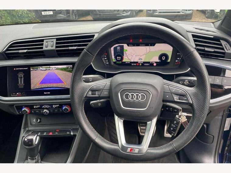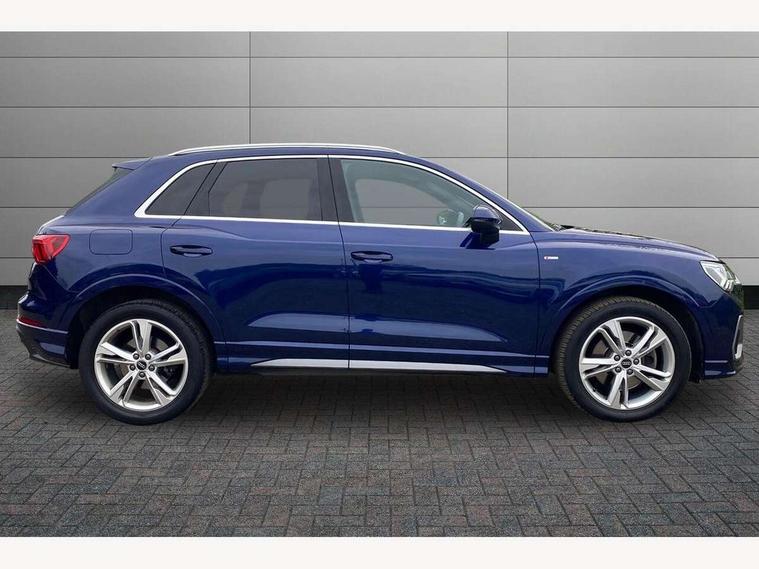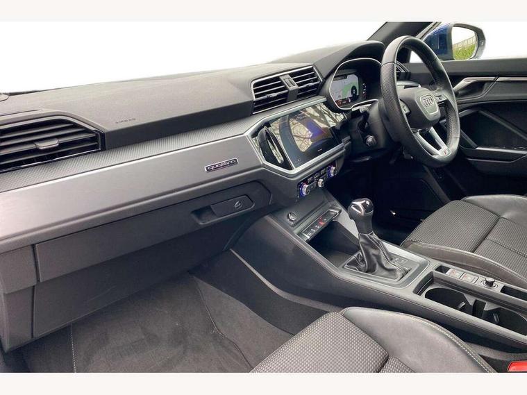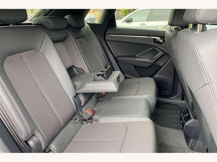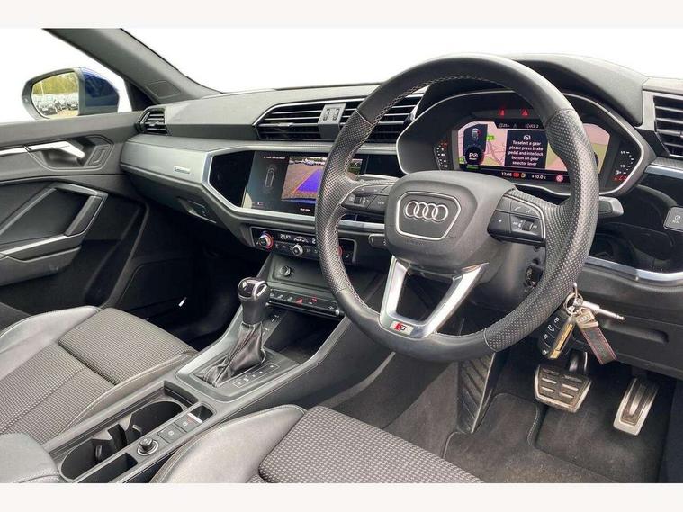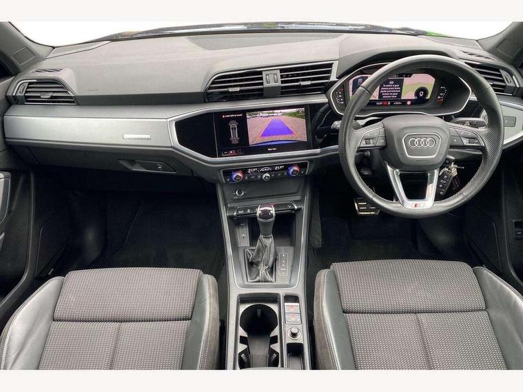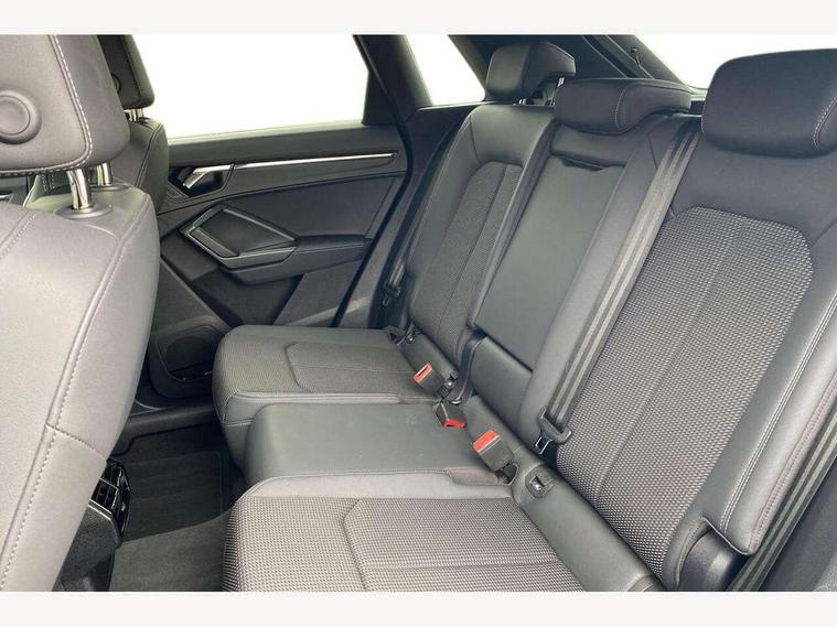 Amazon alexa Integration, Audi drive select, Audi lane departure warning, Audi Virtual Cockpit - 10.25" display, Bluetooth interface, Camera based traffic sign recognition, Legal emergency call, MMI Navigation Plus with high resolution 10.1 inch touchscreen colour display, Power operated tailgate, Progressive steering, Service interval indicator, Smartphone interface includes wireless Apple carplay/Android Auto, Start stop system with recuperation, Voice control system with natural language interaction, Sports suspension, 2 USB-C ports with charge and data functions, 6 passive loudspeakers, DAB digital radio module, Acoustic windscreen, Aluminium roof rails, Aluminium window trim, Auto dimming frameless rear view mirror, Body colour front spoiler blade, Body coloured bumpers, Electrically folding, adjustable and heated door mirrors with integrated LED side indicators and kerb view function for passenger side, Front and rear electric windows, Front fog lights, Front side air inlets in matt platinum grey, Grille vertical bars in aluminium silver/Matt, High gloss black finish B and C pillars, LED Dynamic rear indicators, LED headlights with LED daytime running lights, LED rear lights, LED third brake light, Privacy glass dark tinted rear and rear-side windows (from B-pillar backwards), Rain and light sensors, Rear diffuser grille in grained matt black, Rear diffuser strip in matt titanium black, Rear side wing doors, Rear wiper, S line badges on front wings, S Line front and rear bumpers, Side skirt insert in matt Platinium grey, Titanium black radiator grille, Variable front intermittent wipers, 12V socket in rear centre console, 3 seat bench in 2nd row, 40:20:40 folding with manual adjustment for 60:40 forwards/backwards position and backrest angle, Adjustable rear seat bench/backrest with centre armrest and cupholder, Black cloth headlining, Dual zone electronic climate control, Front and rear black floor mats with contrast stitching in rock grey, Front and rear headrests, Front and rear roof module including reading lights, Front centre armrest, Glove compartment lighting, Height and reach adjustable steering wheel, Illuminated door sill trims with S logo, ISOFIX child seat mounting for front passenger with airbag deactivation and outer rear seat including top tether attachment point for outer rear seats, Luggage compartment light, Manual front seats with height adjustment, Perforated leather gearknob, Single front passenger seat, Stainless steel luggage compartment sill finisher, Stainless steel pedals, Ambient lighting pack - Q3, Non smoking pack - Q3, 3x3 point rear seatbelts, 6 airbags - Driver, front passenger, curtain and side windows, Audi pre-sense front with pedestrain and cyclist recognition, Electrically operated child locks on rear doors, Electromechanical parking brake, Electronic stabilisation control including ABS, ASR and EDL, Front seatbelt reminder, Hill descent control, Hill hold assist, Pre sense basic, Seatbelt monitoring, Tyre pressure warning, Warning triangle and first aid kit, Anti theft alarm, Anti theft wheel bolts, Immobiliser, Remote central locking, Dark matt brushed aluminium inlay, Detail dashboard around MMI touch colour display in glass look, black with surround in aluminium look, Leatherette door armrest,