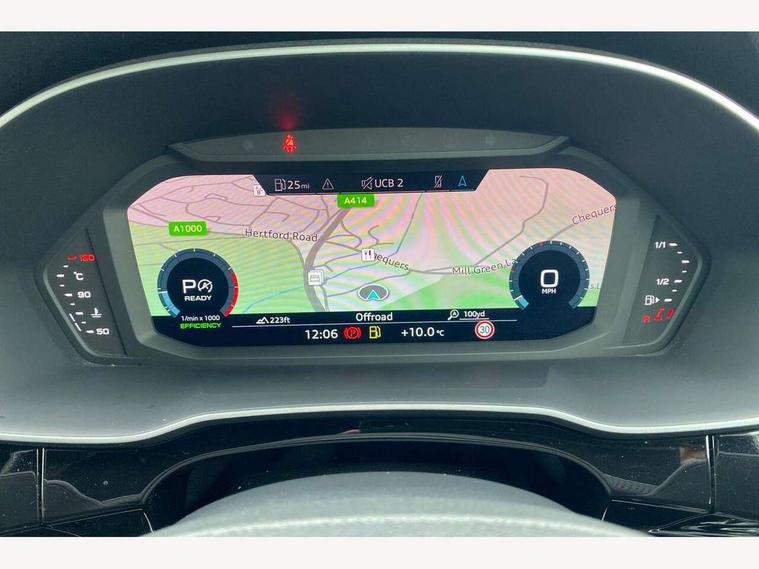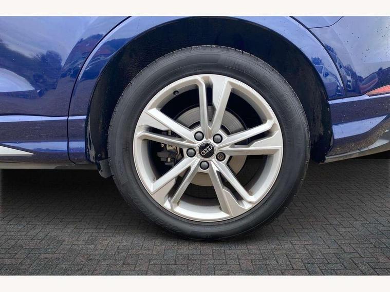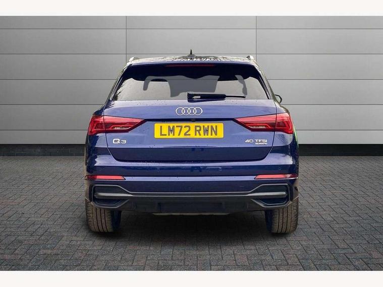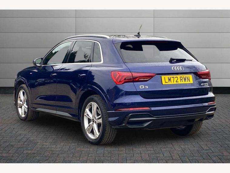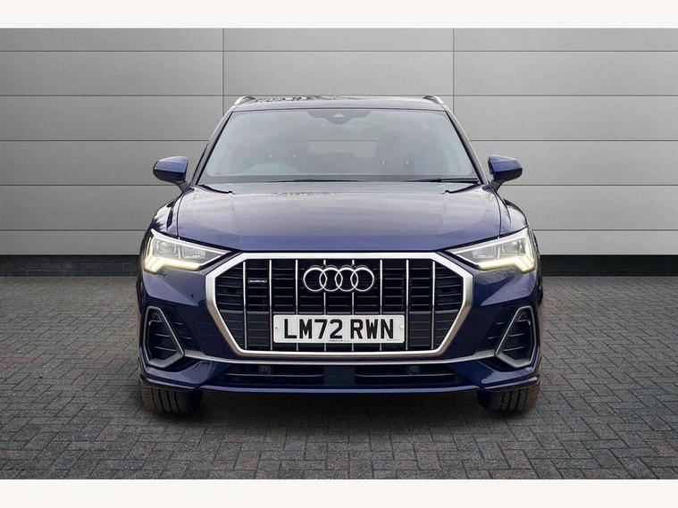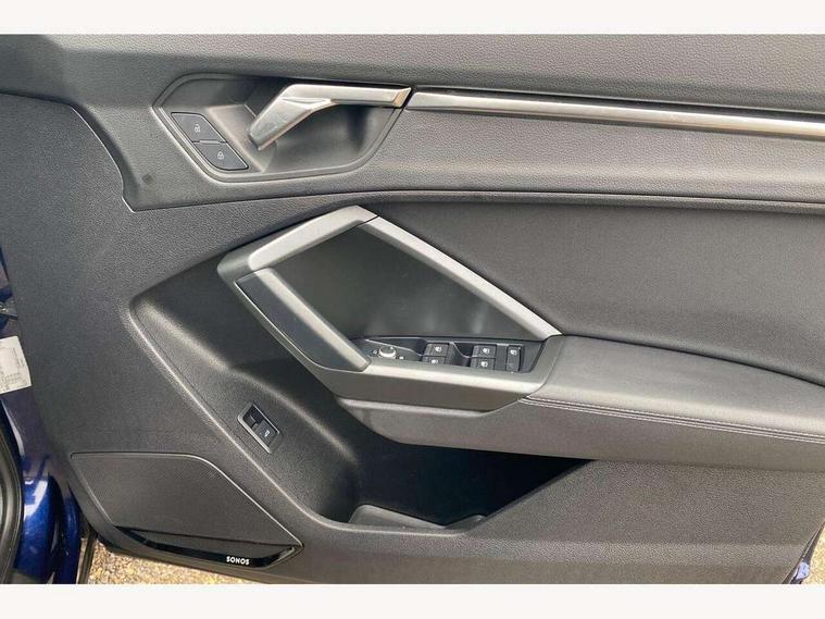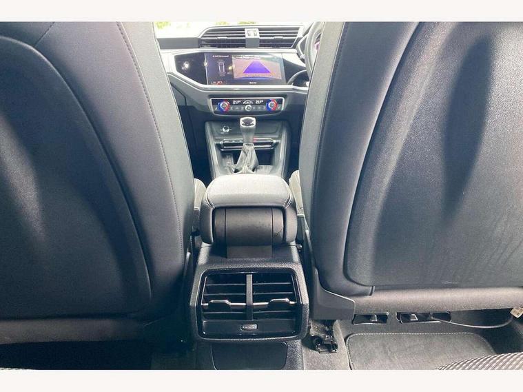 Amazon alexa Integration, Audi drive select, Audi lane departure warning, Audi Virtual Cockpit - 10.25" display, Bluetooth interface, Camera based traffic sign recognition, Legal emergency call, MMI Navigation Plus with high resolution 10.1 inch touchscreen colour display, Power operated tailgate, Progressive steering, Service interval indicator, Smartphone interface includes wireless Apple carplay/Android Auto, Start stop system with recuperation, Voice control system with natural language interaction, Sports suspension, 2 USB-C ports with charge and data functions, 6 passive loudspeakers, DAB digital radio module, Acoustic windscreen, Aluminium roof rails, Aluminium window trim, Auto dimming frameless rear view mirror, Body colour front spoiler blade, Body coloured bumpers, Electrically folding, adjustable and heated door mirrors with integrated LED side indicators and kerb view function for passenger side, Front and rear electric windows, Front fog lights, Front side air inlets in matt platinum grey, Grille vertical bars in aluminium silver/Matt, High gloss black finish B and C pillars, LED Dynamic rear indicators, LED headlights with LED daytime running lights, LED rear lights, LED third brake light, Privacy glass dark tinted rear and rear-side windows (from B-pillar backwards), Rain and light sensors, Rear diffuser grille in grained matt black, Rear diffuser strip in matt titanium black, Rear side wing doors, Rear wiper, S line badges on front wings, S Line front and rear bumpers, Side skirt insert in matt Platinium grey, Titanium black radiator grille, Variable front intermittent wipers, 12V socket in rear centre console, 3 seat bench in 2nd row, 40:20:40 folding with manual adjustment for 60:40 forwards/backwards position and backrest angle, Adjustable rear seat bench/backrest with centre armrest and cupholder, Black cloth headlining, Dual zone electronic climate control, Front and rear black floor mats with contrast stitching in rock grey, Front and rear headrests, Front and rear roof module including reading lights, Front centre armrest, Glove compartment lighting, Height and reach adjustable steering wheel, Illuminated door sill trims with S logo, ISOFIX child seat mounting for front passenger with airbag deactivation and outer rear seat including top tether attachment point for outer rear seats, Luggage compartment light, Manual front seats with height adjustment, Perforated leather gearknob, Single front passenger seat, Stainless steel luggage compartment sill finisher, Stainless steel pedals, Ambient lighting pack - Q3, Non smoking pack - Q3, 3x3 point rear seatbelts, 6 airbags - Driver, front passenger, curtain and side windows, Audi pre-sense front with pedestrain and cyclist recognition, Electrically operated child locks on rear doors, Electromechanical parking brake, Electronic stabilisation control including ABS, ASR and EDL, Front seatbelt reminder, Hill descent control, Hill hold assist, Pre sense basic, Seatbelt monitoring, Tyre pressure warning, Warning triangle and first aid kit, Anti theft alarm, Anti theft wheel bolts, Immobiliser, Remote central locking, Dark matt brushed aluminium inlay, Detail dashboard around MMI touch colour display in glass look, black with surround in aluminium look, Leatherette door armrest,