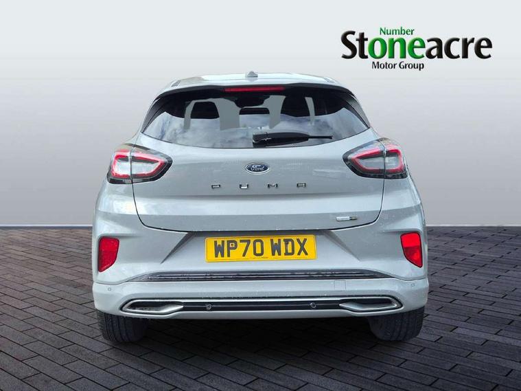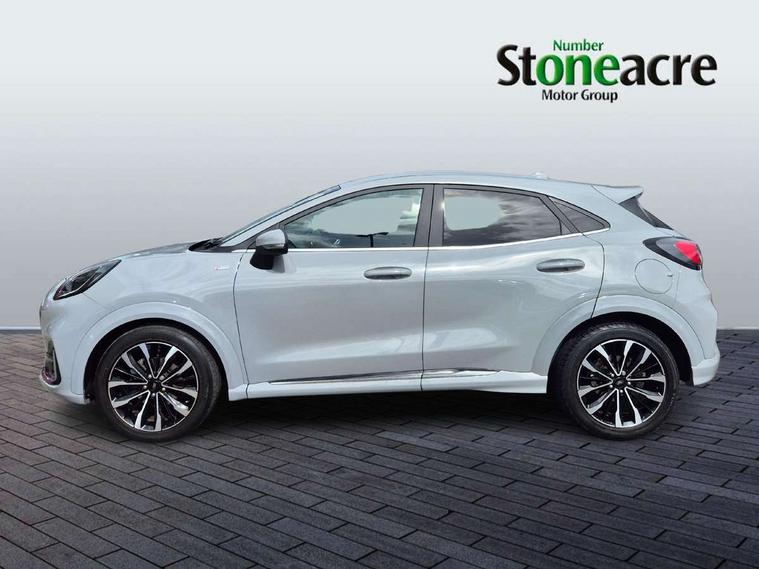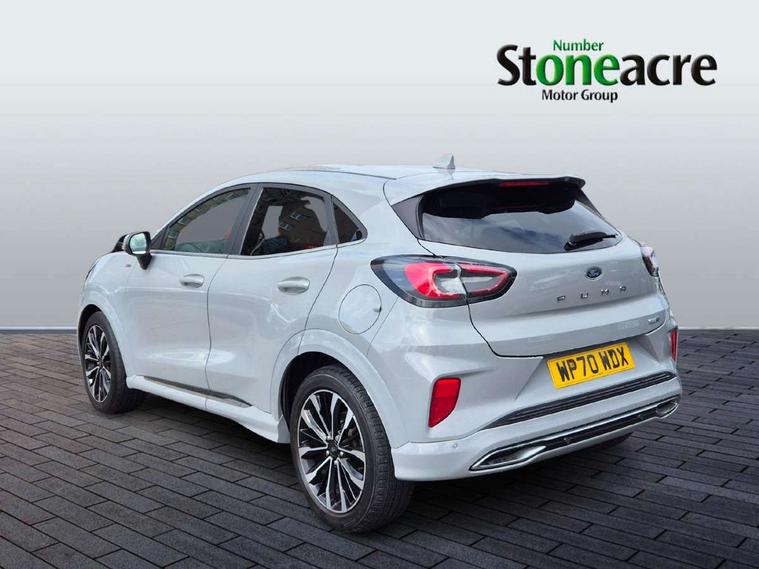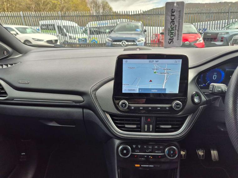 Ford easy fuel, Full digital 12.3" instrument cluster, Lane keeping aid with lane departure warning, Power assist steering, Rear parking sensor, Selectable drive modes(Normal, Eco, Sport, Slippery and Trail), Wireless charging pad, Automatic headlights with rain sensing wipers and auto high beam, Body coloured door mirrors, Bodyside chrome styling, Fixed LED headlamps, Front fog lights with cornering lights and LED rear lamps, Gloss black with chrome elements on front and rear bumpers, High chrome waistline, LED daytime running lights, Power foldable heated door mirrors with puddle lamps, Privacy glass to side rear windows and tailgate glass, Quickclear heated windscreen, Rear wiper, Satin aluminium accents to front grille, waistline and bodyside, ST-Line body kit with large rear spoiler wth sports suspension, Unique Vignale style upper grille and surround, Alloy sports pedals, Centre console with armrest and stowage, Driver and passenger seat lumbar and height adjust, Ford megabox extended bootspace, Front and rear floor mats, Front and rear head restraints, Manual air conditioning, Perforated leather flat bottomed steering wheel, handbrake and alumnium gearknob with metal grey stitching, Premium sensico wrapped instrument cluster, Windsor premium leather upholstery, B&O Premium Audio system + Ford SYNC 3 navigation pack - Puma, Comfort pack - Puma, 3 rear seatbelts, Electronic stability control (ESC) and hill start assist, Pre-collision assist with autonomous emergency braking, pedestrian/cyclist detection & post-collision braking, Tyre pressure monitoring system (TPMS), Thatcham alarm, Carbon look interior deco spears, Tyre inflation kit,