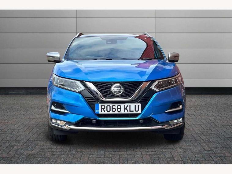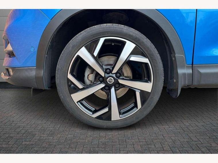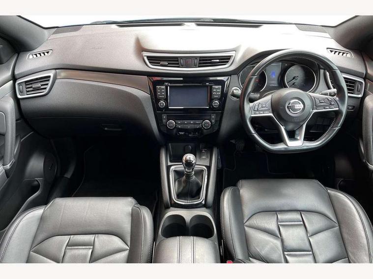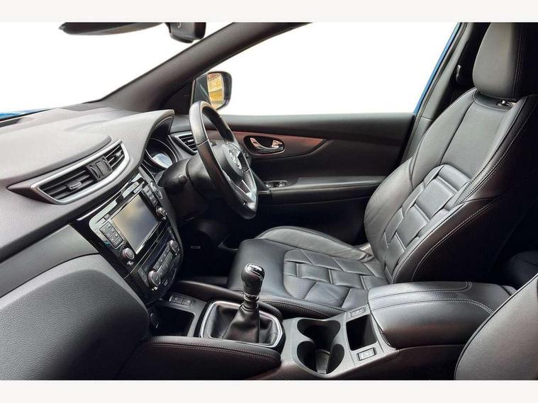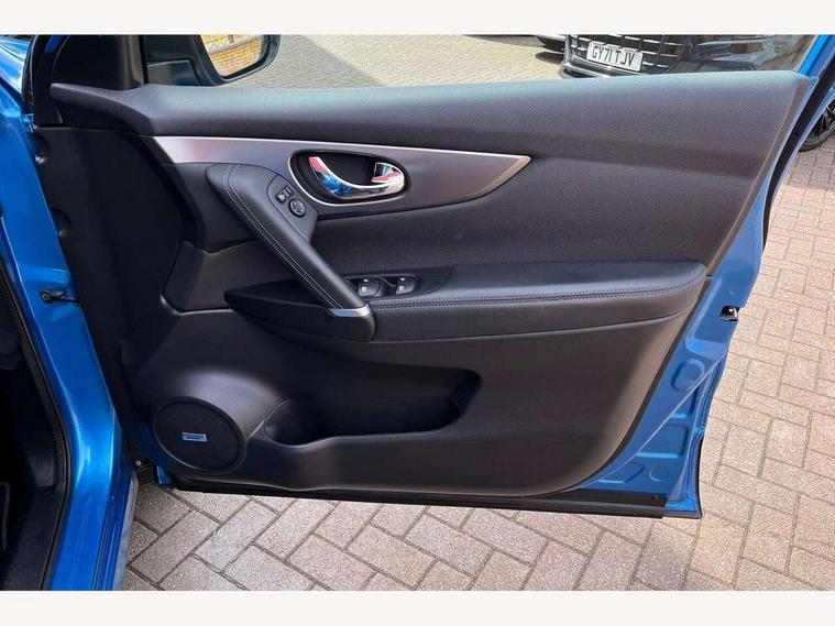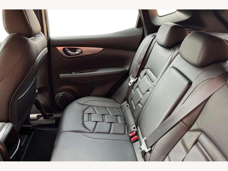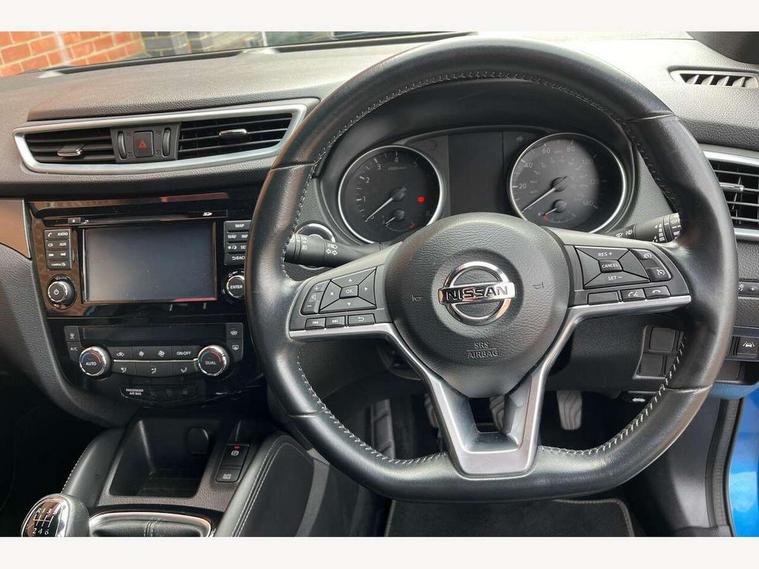 Advanced drive assist display 5'' TFT coloured screen, Bluetooth phone integration system, Cruise control + speed limiter, Electric speed sensitive power steering, Front parking sensors, Intelligent around view monitor, Intelligent parking assist, Lane departure warning system, Nissan connect evo 7" touchscreen navigation and entertainment system, Outside temperature sensor, Push button starter, Rear parking sensors, Rear view camera, Selectable steering, Service interval indicator, Smartphone integration, Stop/start system, Traffic sign recognition, Trip computer, Nissan chassis control (intelligent ride control, intelligent trace control, intelligent engine brake), Aux-in socket, Bose premium 8 speaker system, DAB Digital radio, Radio/CD, Steering wheel mounted audio controls, USB port, Anti dazzle rear view mirror, Auto wipers, Body colour bumpers, Body colour door handles, Body colour door mirrors, Chrome window surround, Daytime running lights dip function when turn signal applied, Electric folding door mirrors, Electric front and rear windows with one touch illuminated window controls, Electric front/rear windows, Electrically adjustable door mirrors, Front fog lights, Heated door mirrors, High beam assist, Intelligent auto headlights, LED indicators in door mirrors, Matt silver roof rails, Panoramic sunroof with one touch shade, Privacy glass, Rear roof spoiler, Rear wiper, Shark fin antenna, Silver door mirrors, Underbody vortex generators, 2 X front 12v power sockets, 3 height adjustable rear headrests, 60/40 split folding rear seat, Ambient interior lighting, Boot light, Centre console storage box/armrest, Chrome interior door handles, Configurable luggage board system, Dark headlining, Dual zone climate control, Electric 4-way lumbar support for drivers seat, Electric adjust driver's seat, Electrically adjustable passenger seat, Front and rear door pockets with bottle holders, Front and rear seat belt pre-tensioners with load limiters, Front headrests, Height adjustable front headrests, Individual rear seat reading lights, Leather D shaped steering wheel, Leather gear lever, Leather knee pad, Manual lumbar support on passenger seat, Map reading lamp, Memory for drivers seat/door mirrors, Monoform front seats with plastic backboard, One touch electric shade, Parcel shelf stow function under luggage board, Pollen filter, Rear armrest with 2 cupholders, Rear headrests, Synthetic leather wrapped door handle with contrasting stitching, Tilt/telescopic adjustable steering wheel, Heat package - Qashqai, LED pack - Qashqai, Safety shield plus pack - Qashqai, 6 airbags - Driver, front passenger, curtain and side airbags, ABS, ESP, EBD and brake assist, Auto hold function, Child locks on rear doors, Electronic parking brake, Front and rear seat belt warning, Front passenger airbag deactivation, Height adjustable front seatbelts, Hill start assist, Intelligent emergency braking with pedestrian recognition, Three 3 point rear seatbelts, Tyre pressure monitoring system, Anti-theft immobiliser, Intelligent Key, Remote central locking, Thatcham Cat.1 alarm, Carbon graphite dash trim, Tyre puncture repair kit,