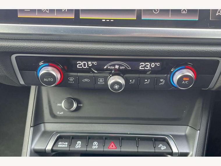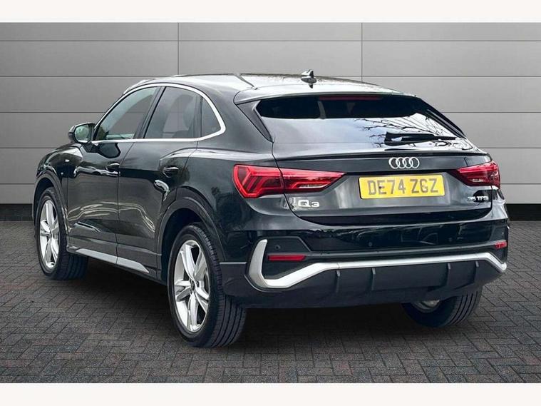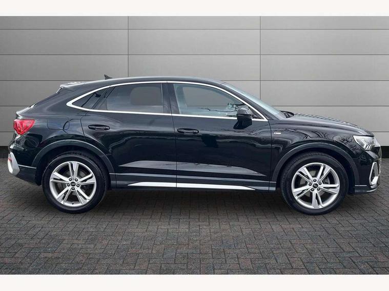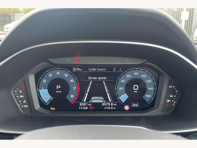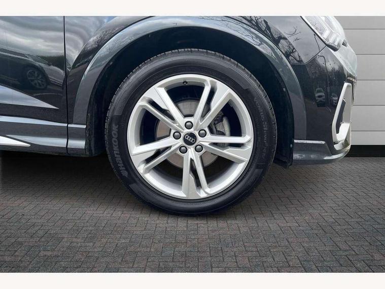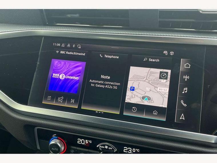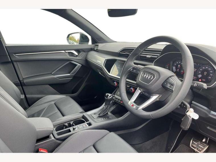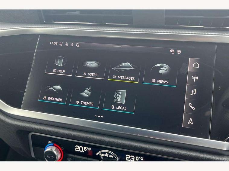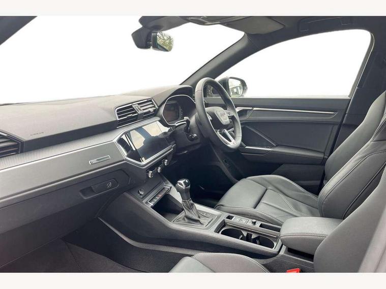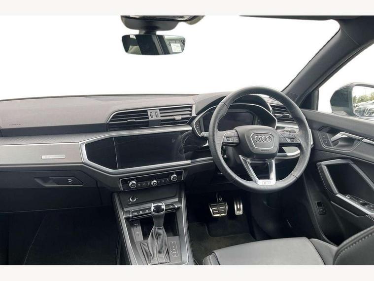Audi connect safety and service, Audi drive select, Audi lane departure warning, Audi Virtual Cockpit - 10.25" display, Bluetooth interface, Camera based traffic sign recognition, Distraction and Fatigue warning, Legal emergency call, MMI Navigation Plus with high resolution 10.1 inch touchscreen colour display, Power operated tailgate, Progressive steering, Service interval indicator, Smartphone interface includes wireless Apple carplay/Android Auto, Start stop system with recuperation, Voice control system with natural language interaction, Sports suspension, 2 USB-C ports with charge and data functions, 6 passive loudspeakers, DAB digital radio module, Acoustic windscreen, Aluminium window trim, Auto dimming door mirrors, Auto dimming frameless rear view mirror, Diffuser grille in grained matt black, Diffuser trim in selenite silver, Electrically folding, adjustable and heated door mirrors with integrated LED side indicators and kerb view function for passenger side, Front and rear electric windows, Front fog lights, Front side air inlets in selenite silver, Front underbody protection in manhattan grey paint finish, Grille surround in aluminium silver matt, High gloss black finish B and C pillars, LED Dynamic rear indicators, LED headlights with LED daytime running lights, LED rear lights, LED third brake light, Privacy glass dark tinted rear and rear-side windows (from B-pillar backwards), Radiator grille in anthracite black with inlay in matt aluminium silver, Rain and light sensors, Rear side wing doors, Rear underbody protection in matt black, Rear wiper, S line badges on front wings, S line front and rear bumpers and side skirts in contrasting Manhattan grey paint finish, Side skirt insert in matt Platinium grey, Variable front intermittent wipers, 12V socket in rear centre console, 3 seat bench in 2nd row, 3 spoke leather multifunction steering wheel features S badging and grips in perforated leather with contrast stitching, 40:20:40 folding with manual adjustment for 60:40 forwards/backwards position and backrest angle, Adjustable rear seat bench/backrest with centre armrest and cupholder, Black cloth headlining, Dual zone electronic climate control, Electric lumbar support, Front and rear black floor mats with contrast stitching, Front and rear headrests, Front centre armrest, Height and reach adjustable steering wheel, Illuminated door sill trims with S logo, ISOFIX child seat mounting for front passenger with airbag deactivation and outer rear seat including top tether attachment point for outer rear seats, Luggage compartment sill protection in stainless steel, Manual front seats with height adjustment, Perforated leather gearknob, Single front passenger seat, Stainless steel pedals, Twin leather upholstery with front sport seats + S embossing, Non smoking pack - Q3, 3x3 point rear seatbelts, 6 airbags - Driver, front passenger, curtain and side windows, Audi pre-sense front with pedestrain and cyclist recognition, Electrically operated child locks on rear doors, Electromechanical parking brake, Electronic stabilisation control including ABS, ASR and EDL, Front seatbelt reminder, Hill descent control, Hill hold assist, Pre sense basic, Seatbelt monitoring, Tyre pressure warning, Warning triangle and first aid kit, Anti theft alarm, Anti theft wheel bolts, Immobiliser, Remote central locking, Aluminium look interior elements, Dark matt brushed aluminium inlay, Detail dashboard around MMI touch colour display in glass look, black with surround in aluminium look, Leatherette door armrest,