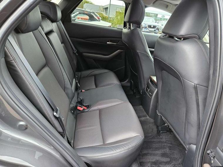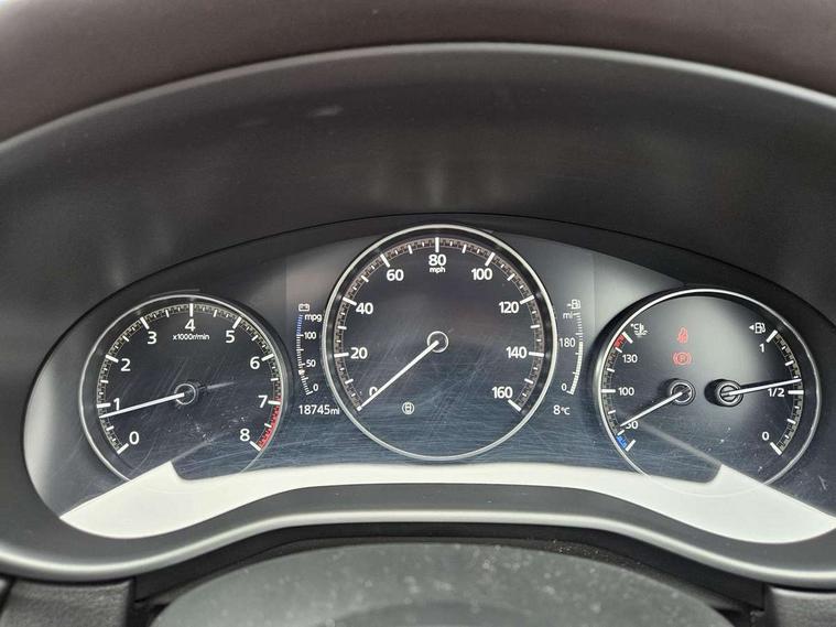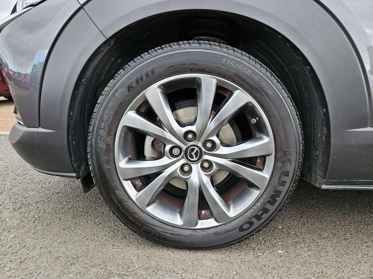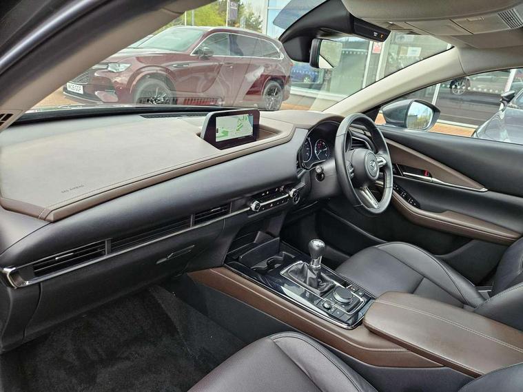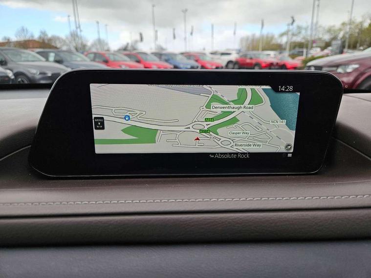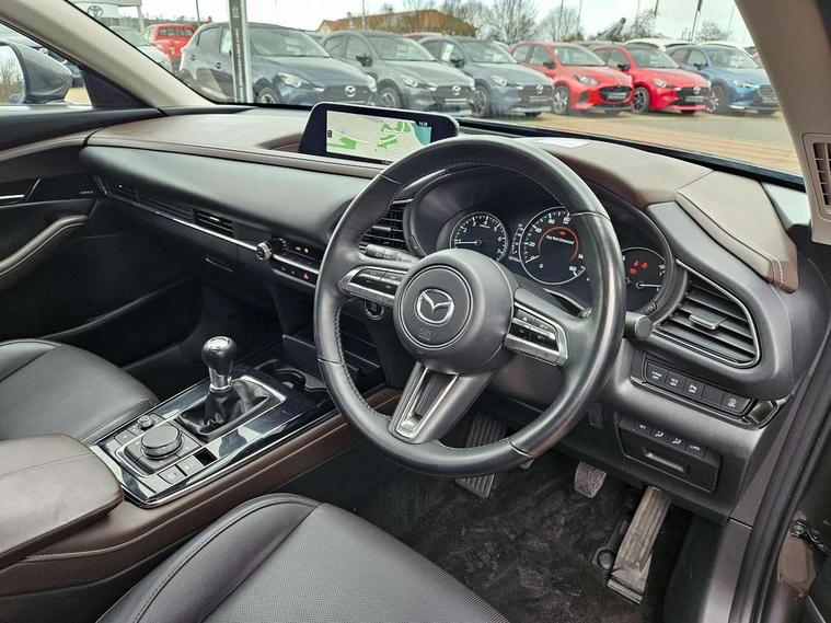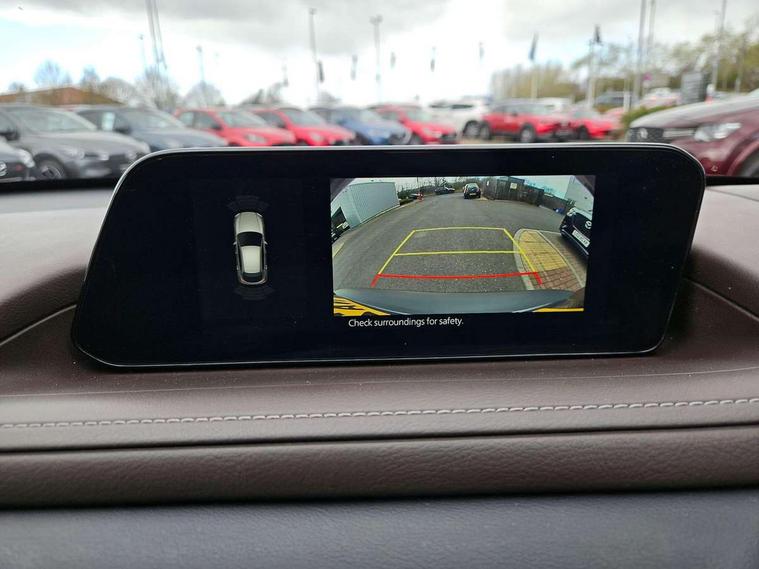 7" TFT Colour driver instrument panel display, 8.8" Colour centre touch screen display with Mazda Connect infotainment, Adaptive cruise control (Mazda radar cruise control), Apple car play/Android Auto, Blind spot monitoring with rear cross traffic alert, Driver attention alert system, E-call with GPS, Emergency stop signalling system, Engine start/stop button, Front and rear parking sensors, Integrated bluetooth, Integrated Mazda navigation system, Intelligent speed assist, Lane keep assist system (LAS) with Lane departure warning system (LDWS), Mazda connected services, PAS, Power lift gate, Reversing camera, Service indicator, Tailgate, Traffic sign recognition, Trip computer, Windscreen projected colour active driving display (HUD), i-stop, 2 USB charging ports in front inner central armrest, AM/FM and DAB radio, Bose surround sound system with 12 Speaker, Bose center point, Bass match and audio pilot technology, Multimedia Commander including separate volume dial, Steering wheel mounted audio/bluetooth controls, Adaptive LED Headlights, Auto dimming driver's door mirror, Auto headlight levelling, B-pillar and C-pillar garnishes in piano black finish, Body coloured, electrically adjustable, heated auto power folding door mirrors with integrated indicators, Chrome finish signature wing in front grille, Coming/leaving home lighting function, Door mirrors with adjustable memory and tilt-down function when reversing, Dual chrome exhaust, Dusk sensing headlights, Electric front/rear windows with one touch auto up/down, Frameless auto dimming interior rear view mirror, Front kodo turn signal, Gloss black front grille, Gloss black rear roof spoiler, High beam assist, LED signature daytime running lights, Privacy glass (rear side windows and rear screen), Rain sensing front wipers with adjustable speed and intermittent wipe, Rear fog lights, Rear side wing doors, Rear wiper, Signature LED rear combination lights, Third brake light, 12V power outlet in centre console, 3 seat bench in 2nd row, 60/40 split fold down rear seats, Chrome horn pad ring, Chrome interior trim accents with steering wheel centre bezel, surround of engine start / stop button and glove box handle, Dashboard, door cards and front centre armrest in rich brown leather, Driver and front passenger visors with covered vanity mirror and driver ticket holder, Driver's seat, power tilt, slide, recline, height and lumbar adjustment, Driver, front passenger and two rear door storage, Driver, Front passenger and two rear grab handles with coathooks, Dual zone climate control air conditioning with rear air vents, Folding rear centre armrest with two cup holders, Front and rear (x3) head restraints, Front and rear LED lighting, Front armrest, Front centre storage with two cupholders with lid, Front passenger seatback pockets, Front passengers seat manual slide, recline and height adjustment, Gear shift indicator, Glovebox illumination, Heated front seats with 3 stage setting, Heated steering wheel, ISOFIX child seat anchorage points attached on outer rear seats, Leather upholstery with interior accents, Leather wrapped gear shift knob, Leather wrapped steering wheel with telescopic and tilt adjustment, LED luggage compartment lighting, Light roof headlining and pillars, Rear armrest inner material in cloth, Roof mounted sunglasses holder, Single front passenger seat, 3 point ELR front seat belts x2 with pretensioners, 3 point ELR rear seat belts, Anti-lock braking system (ABS), Drivers knee airbag, DSC - Dynamic Stability Control, Electronic parking brake with auto disengage function and auto hold function, Front and rear curtain airbags, Front dual stage driver and single stage front passenger airbags, Front passenger airbag cut-off switch, Front side airbags, Front smart city brake support, G-Vectoring control plus, Hill launch assist, Manual child lock in rear doors, Mild Hybrid system with regenerative braking, Seatbelt reminder for driver/front passenger and rear seats, Traction control system (TCS), Tyre pressure monitoring system (TPMS), Remote central locking with deadlocking and automatic door lock when driving, Smart keyless entry, Thatcham accredited alarm and immobiliser, Dark vinyl door panel inserts, 18" Bright alloy wheels, Emergency tyre repair kit,