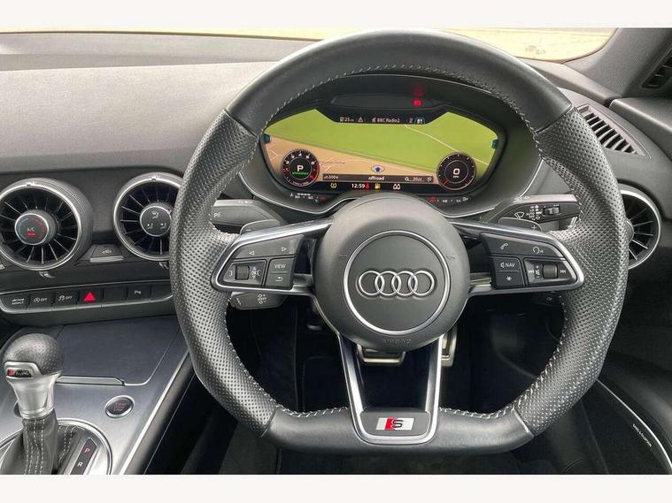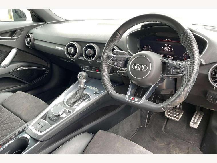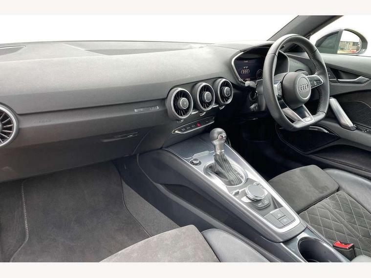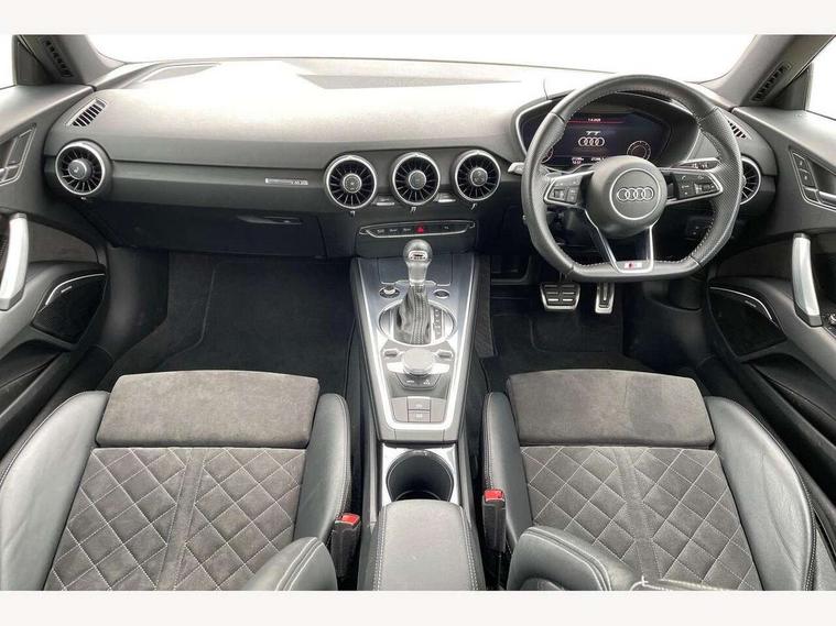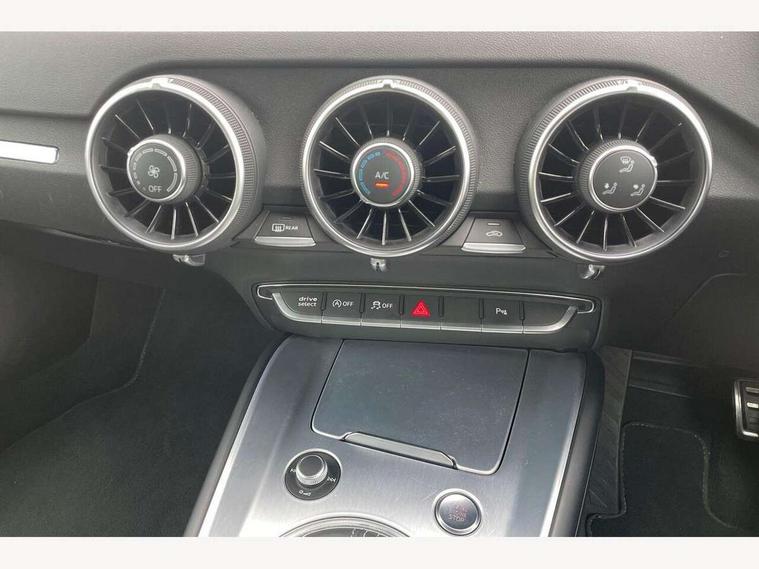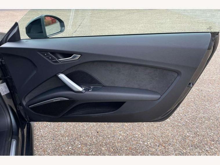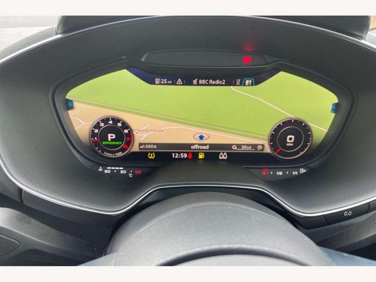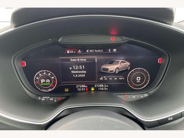 Audi drive select with 4 Pre configured modes, Audi smartphone interface, Audi virtual cockpit - 12.3" high-resolution LCD display with fully customisable instrument cluster, Cruise control + speed limiter, Emergency call service, MMI touch panel, Mobile phone preparation with bluetooth interface, Progressive power assisted steering, Service interval indicator, Start/Stop system with energy recuperation, TP memo, Sports suspension, AM/FM radio, Bluetooth audio streaming, DAB Digital radio, MMI Radio with CD player and SD/XC card slot, Auto dimming rear view mirror, Auto headlight range control, Black chrome tailpipe, Dark privacy glass from B-pillar backwards, Electric folding door mirrors, Electric front windows, Electrically adjustable and heated door mirrors with integrated LED side indicators, Front fog lights, Green tinted heat insulating glass, LED 3rd brake light, LED daytime running lights, LED headlights with LED rear lights + dynamic rear indicators, Light and rain sensors, Rear boot, Sunband for windscreen, 12V socket, 2 rear seats, 3 spoke flat bottomed high multi-function leather sport steering wheel with gearshift paddles, 4 way electric lumbar support for driver and front passenger, Black headlining, Contrasting silver stitching in steering wheel, Door sill trims, Extended aluminium look with stainless steel pedals, Front centre armrest, Front passenger seat, Front super sports seats, Heated front seats, Height/reach adjust steering wheel, Integrated head restraints, ISOFIX child seat mounting for front passenger seat with airbag deactivation, Manual adjustment of seat height, fore/aft position, seat angle, seat depth and backrest angle, Perforated leather gearknob in black, Rear head restraints, Rear top tether child seat ISOFIX attachment, Split folding rear seat, Black styling pack - TT, Non smoking pack - TT/TT RS, 3 point front seat belts, ABS, ASR traction control, Curtain airbags, Driver and front passenger airbag with front passenger airbag deactivation, EDL traction control, Electromechanical parking brake, ESP, First aid kit, Front side airbags, Head airbags, Hill hold assist, Seatbelt warning, Tyre pressure loss indicator, Warning triangle, Anti theft alarm, Anti theft wheel bolts, Immobiliser, Keyless Go, Remote central locking, Matt brushed aluminium inlays, Tool kit, Tyre repair kit,