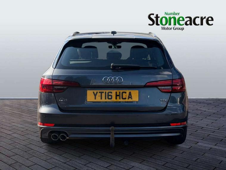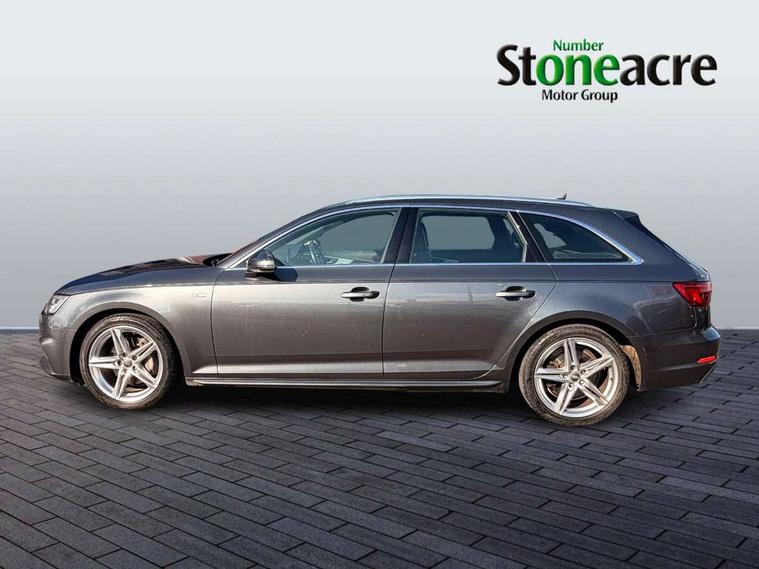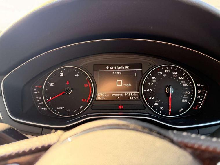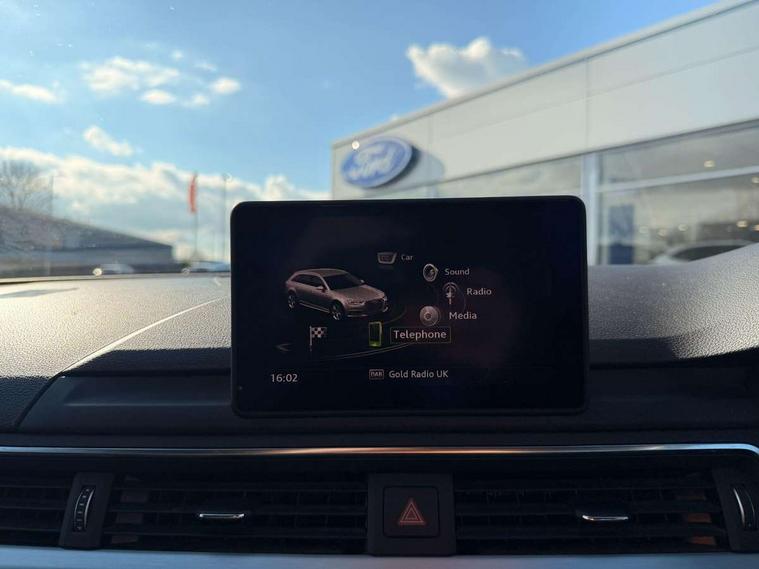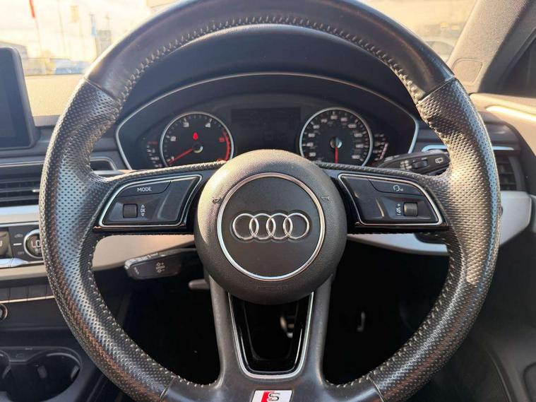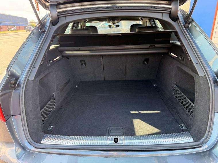 Audi drive select, Audi Pre sense collision avoidance, Electro-mechanical PAS, Power boot opening and closing, Service interval indicator, Stop/start button, Voice control system, 2 USB ports, Aux input, DAB digital radio module, MMI radio plus with CD player, Acoustic windscreen, Aluminium roof rails, Auto dimming rear view mirror, Automatic headlights + automatic windscreen wipers, Body colour bumpers, Body colour door mirrors, Chrome rolled exhaust, Electric adjustable heated door mirrors, Electric front windows, Electric rear windows, Headlight range control, LED daytime running lights, Rear diffuser in Twilight grey matt, Rear wiper, Twilight grey matt radiator grille with chrome inlay, 3 zone climate control, 4 way electric lumbar support for driver and front passenger, Black cloth headlining, Front centre armrest with 12v socket, Front sport seats, Front/rear floor mats, Gearshift paddles, Illuminated door sill finishers, Isofix child seat preparation for front passenger/outer rear seats inc passenger airbag deactivation, Jack and tool kit, Perforated leather gearknob, Reach + rake adjustable steering column, Rear headrests, Retractable load area cover, Split folding rear seats, Stainless steel pedals, Top tether anchor plate for isofix child seat, Exterior aluminium pack - A4, S line exterior styling pack - A4 Avant, 3 point seatbelts on all rear seats, ABS/EBD, Adaptive driver and front passenger airbags, Electromechanical parking brake, ESP, First aid kit, Front head airbags, Front seatbelt pretensioners + load limiters, Front side airbags, Seatbelt warning, Traction control, Tyre pressure monitoring system, Warning triangle, Locking wheel bolts, Remote central locking, Thatcham category 1 alarm + immobiliser, Space saver spare wheel,