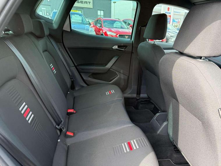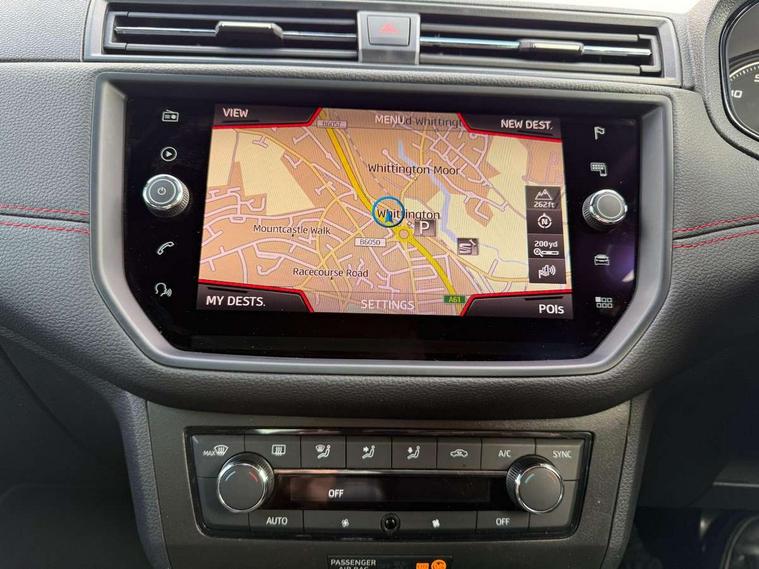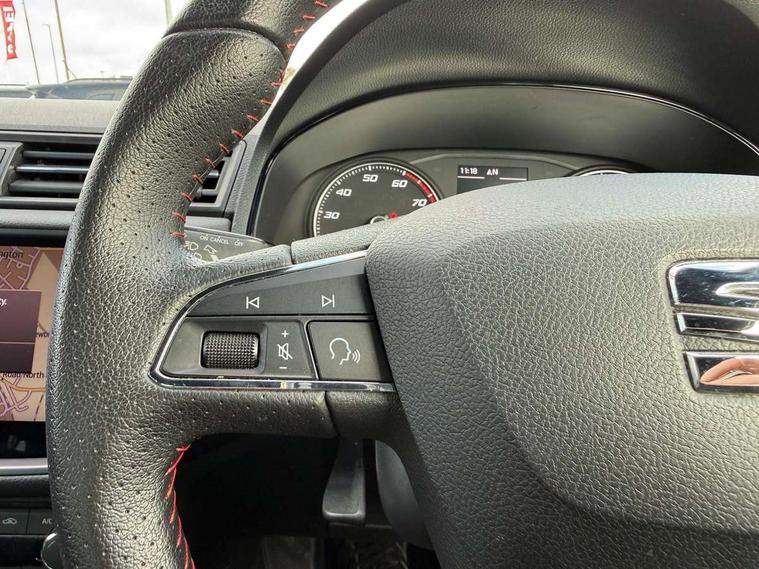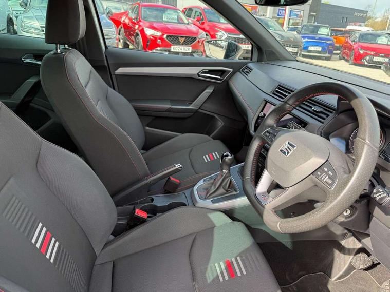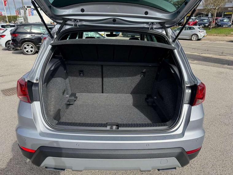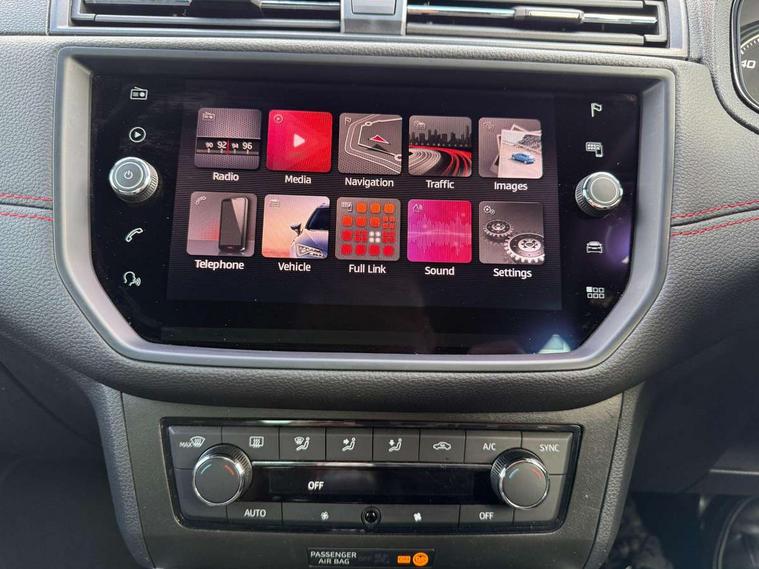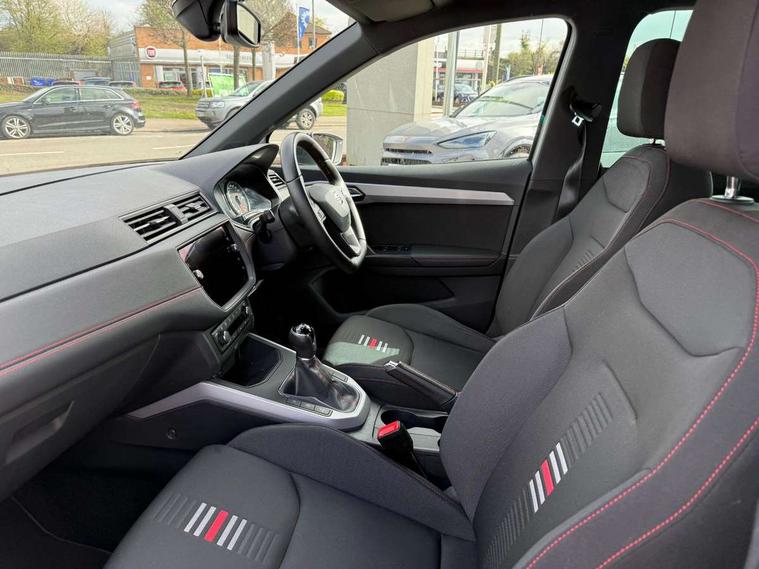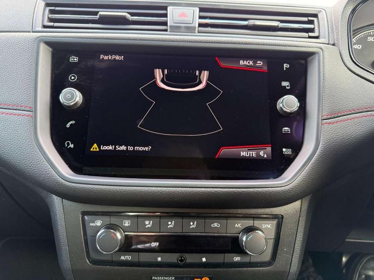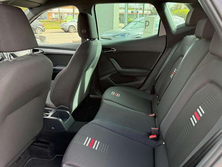 'Lights On' Reminder warning buzzer, Cruise control, Digital clock, Electric speed sensitive power steering, Full Link Smartphone Integration with Mirror Link, Apple Car Play, Google Android Auto with USB Type C cable for Apple and Android compatibility, Low fuel warning light, Outside temperature display, Rear parking sensor, RPM counter, SEAT Drive profile - Four different models normal-sport-eco-individual, steering response, throttle response, Trip computer, Sports suspension, 6 speakers, Bluetooth interface for hands free and audio streaming, DAB digital radio and AM/FM radio, Steering wheel mounted audio controls, Anti theft roof antenna, Auto dimming interior rear view mirror, Automatic activation of hazard warning lights, Automatic headlights, Body coloured bumpers, Body coloured door handle inserts, Chrome front grille frame, Chrome roof rails, Chrome window trim, Coming/leaving home lighting function, Dark tinted rear windows, Electric front/rear windows with one touch/auto up/down, Electrically adjustable, heated and folding door mirrors, Full LED headlights dipped and mainbeam + front and rear fog lights, LED daytime running lights, LED rear tail lights and licence plate lights, Rain sensing wipers, Rear window wash/wipe, Roof colour door mirrors, Twin exhaust pipe styling hidden exhaust pipe, Visible VIN plate, Windshield wiper with intermittent control and potentiometer, 2 cupholders, 60/40 split folding rear seat, Black interior roof, Double boot floor, Driver sunvisor with covered mirror + card holder, Dual zone climate control, Dust/pollen filter, Front courtesy light with front reading lights, Front sport seats, Gear shift indicator, Height adjustable front seats, Height/reach adjustable steering column, Illuminated boot, Instrument lighting with brightness control, Interior footwell lighting, ISOFIX points in outer rear seats with top tether anchorage points, Multi-colour ambient interior lighting, Nora cloth upholstery, Passenger sunvisor with vanity mirror, Perforated flat bottomed leather steering wheel/gear knob/handbrake with red stitching and FR logo, Two front and three rear height adjustable headrests, Connectivity pack plus - Arona, Interior chrome pack - Arona, 3 point seatbelts on all rear seats, ABS, Active front headrests, Child locks on rear doors, Driver and front passenger airbags with front passenger airbag de activation, front side and curtain airbags, Electronic stability control, Emergency Brake Assist (EBA) and front assist, Front and rear seatbelt reminder, Hill hold control, Multi-Collision braking, Tiredness recognition system, Traction control, Tyre pressure monitoring system, 2 folding remote keys with window open/close function, Alarm with back-up horn, Electronic engine immobiliser, Locking wheel bolts, Remote central locking + deadlocks, Tow away protection, Interior chrome line trim, Leatherette dashboard, 17" Dynamic alloy wheels,