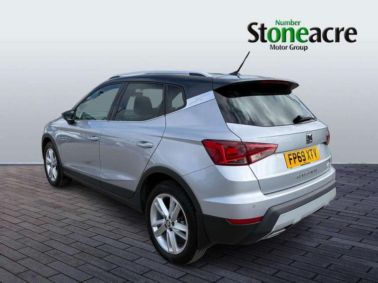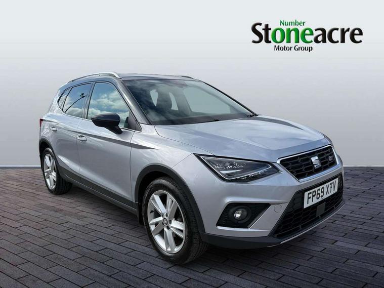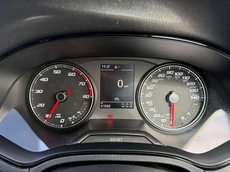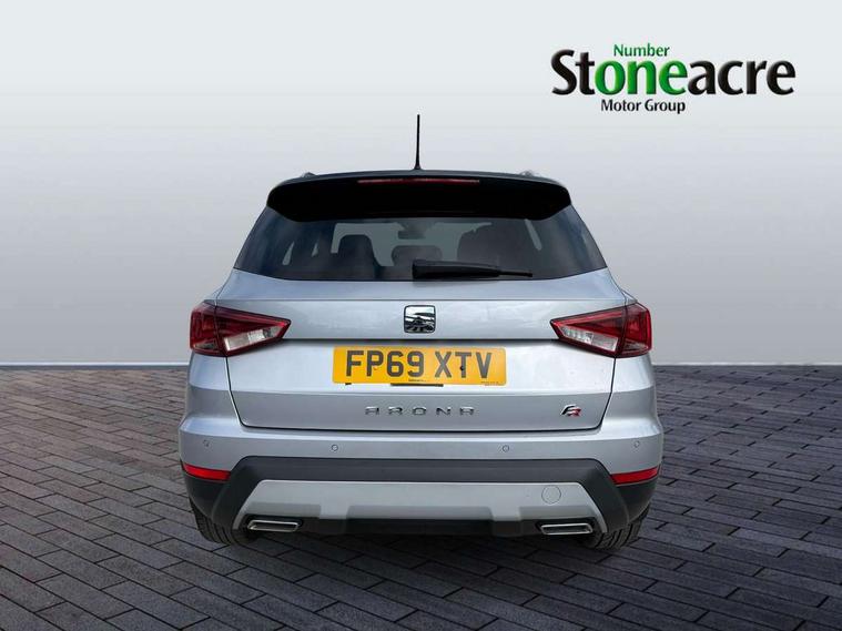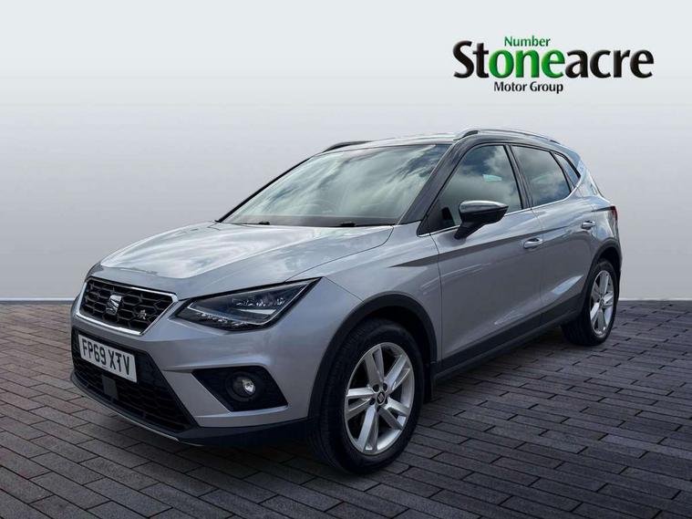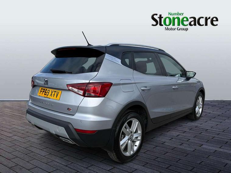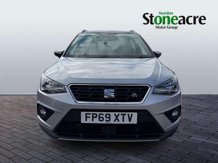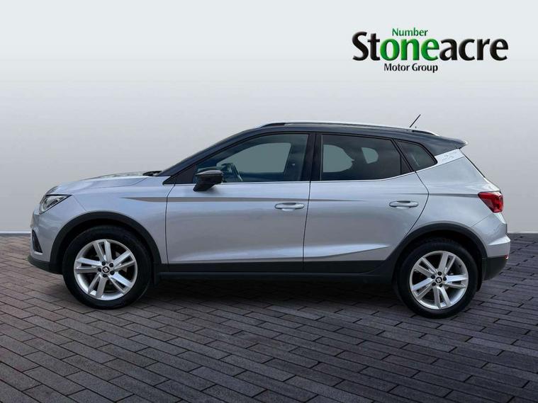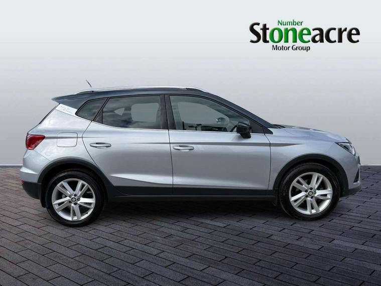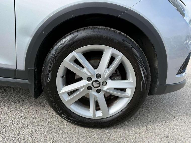 'Lights On' Reminder warning buzzer, Cruise control, Digital clock, Electric speed sensitive power steering, Full Link Smartphone Integration with Mirror Link, Apple Car Play, Google Android Auto with USB Type C cable for Apple and Android compatibility, Low fuel warning light, Outside temperature display, Rear parking sensor, RPM counter, SEAT Drive profile - Four different models normal-sport-eco-individual, steering response, throttle response, Trip computer, Sports suspension, 6 speakers, Bluetooth interface for hands free and audio streaming, DAB digital radio and AM/FM radio, Steering wheel mounted audio controls, Anti theft roof antenna, Auto dimming interior rear view mirror, Automatic activation of hazard warning lights, Automatic headlights, Body coloured bumpers, Body coloured door handle inserts, Chrome front grille frame, Chrome roof rails, Chrome window trim, Coming/leaving home lighting function, Dark tinted rear windows, Electric front/rear windows with one touch/auto up/down, Electrically adjustable, heated and folding door mirrors, Full LED headlights dipped and mainbeam + front and rear fog lights, LED daytime running lights, LED rear tail lights and licence plate lights, Rain sensing wipers, Rear window wash/wipe, Roof colour door mirrors, Twin exhaust pipe styling hidden exhaust pipe, Visible VIN plate, Windshield wiper with intermittent control and potentiometer, 2 cupholders, 60/40 split folding rear seat, Black interior roof, Double boot floor, Driver sunvisor with covered mirror + card holder, Dual zone climate control, Dust/pollen filter, Front courtesy light with front reading lights, Front sport seats, Gear shift indicator, Height adjustable front seats, Height/reach adjustable steering column, Illuminated boot, Instrument lighting with brightness control, Interior footwell lighting, ISOFIX points in outer rear seats with top tether anchorage points, Multi-colour ambient interior lighting, Nora cloth upholstery, Passenger sunvisor with vanity mirror, Perforated flat bottomed leather steering wheel/gear knob/handbrake with red stitching and FR logo, Two front and three rear height adjustable headrests, Connectivity pack plus - Arona, Interior chrome pack - Arona, 3 point seatbelts on all rear seats, ABS, Active front headrests, Child locks on rear doors, Driver and front passenger airbags with front passenger airbag de activation, front side and curtain airbags, Electronic stability control, Emergency Brake Assist (EBA) and front assist, Front and rear seatbelt reminder, Hill hold control, Multi-Collision braking, Tiredness recognition system, Traction control, Tyre pressure monitoring system, 2 folding remote keys with window open/close function, Alarm with back-up horn, Electronic engine immobiliser, Locking wheel bolts, Remote central locking + deadlocks, Tow away protection, Interior chrome line trim, Leatherette dashboard, 17" Dynamic alloy wheels,