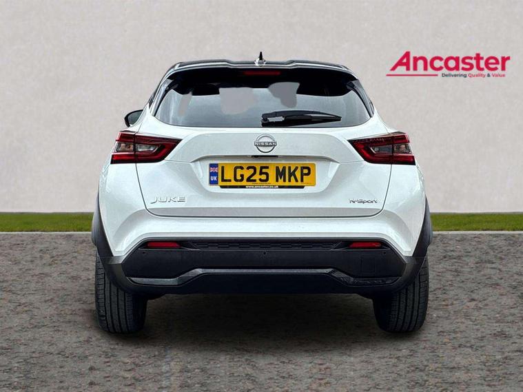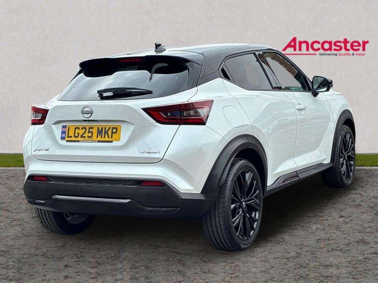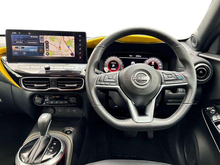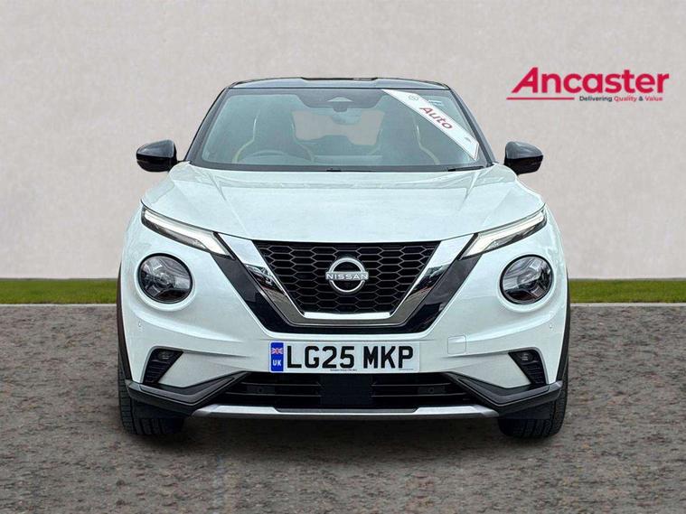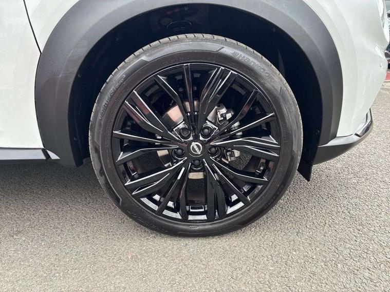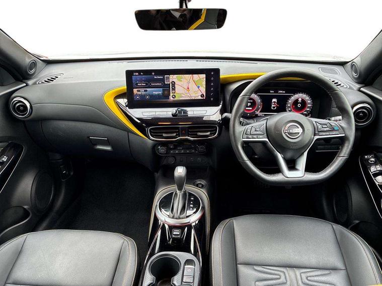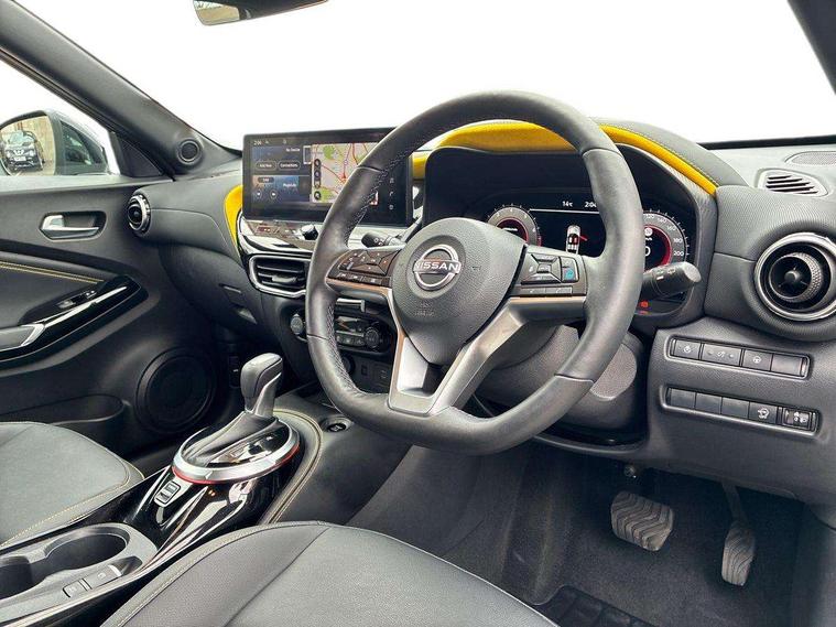 12.3" full colour TFT screen combimeter, Drive modes select (Eco, normal and sport), Emergency and breakdown call, Front parking sensor, Idle start/stop system, Intelligent driver alert system, Intelligent lane intervention, Lane departure warning system, Nissan connect 12.3" touch screen entertainment system, Nissan connect nav with TomTom traffic, Nissan connect services, Outside temperature sensor, Power Steering, Rear parking sensor, Stop/start button, Traffic sign recognition, Trip computer, Voice recognition, WiFi connectivity, Wireless Apple CarPlay and Google Android auto, Wireless Smartphone charger, 10 Bose speakers 6 speakers and 2 headrest speakers for driver/passenger seats, 2 X Rear console USB port, Bluetooth system, USB, Aux-in and 12V socket, Bose personal sound stage control, DAB Digital radio, Auto dimming frameless rear view mirror, Automatic hazard signal with emergency stop signal, Body colour door handles, Electrically adjustable door mirrors with integrated indicators, Follow me home headlights, Front and rear electric window with one touch driver window, Heated and auto folding door mirrors, High beam assist, LED 3rd brake light, LED daytime running lights, LED front fog lights, LED headlamps, LED rear fog lamp, LED rear lamps, One touch passenger window, Rain sensor windscreen wipers, Rear privacy glass, Rear side wing doors, Rear wiper, Roof spoiler, Shark fin roof antenna in solid Black, Three blink turn signal, 3 height adjustable rear headrests, 3 seat bench in 2nd row, 60/40 split folding rear seat, Automatic climate control, Card holder on driver sunvisor, Door ambient lighting, Driver seat back pocket, Driver side rear coat hanger, Driver/passenger sunvisors and vanity mirrors, Front and rear cabin lights, Front armrest, Front door pockets with bottle holders, Front head restraints, Front/rear passenger grab handles, Gear console ambient circle lighting, Height adjustable driver's seat, Internal chrome door handles, Leather gearshift knob, Luggage board, Luggage space lighting, Monoform sporty seats, Multifunction steering wheel, Passenger seat back pocket, Rear door bottle holders, Single front passenger seat, Smooth synthetic leather steering wheel, Steering wheel mounted gearshift paddles, Synthetic leather kneepad, Telescopic steering wheel adjustment, Two cupholders in front centre console, Two rear isofix child seat anchorage points with top tether, Welcome light and console tray ambient lighting, Gloss black exterior personalisation pack - Juke, Heat pack with height adjustable passenger seats - Juke, Interior personalisation pack - Juke, ProPilot pack - Juke Auto, ABS with EBD and brake assist, Active ride control, Active Trace Control, Driver and passenger airbags, Driver and passenger side airbags, Electric handbrake with auto hold function, Electronic Stability Programme (ESP), Front and rear curtain airbags, Height adjustable seatbelts, Hill start assist, Intelligent emergency braking with pedestrian and cyclist recognition, Rear door child safety locks, Seatbelt reminder for driver/front passenger and rear seats, Three 3 point rear seatbelts, Traction control, Tyre pressure monitoring system, VDC Dynamic Vehicle Control, Alarm, Immobiliser, Intelligent key and start push button with walk away lock and approach unlock functions, Remote central locking, 19" Akari Black alloy wheels, Tyre puncture repair kit,