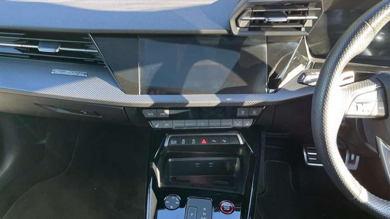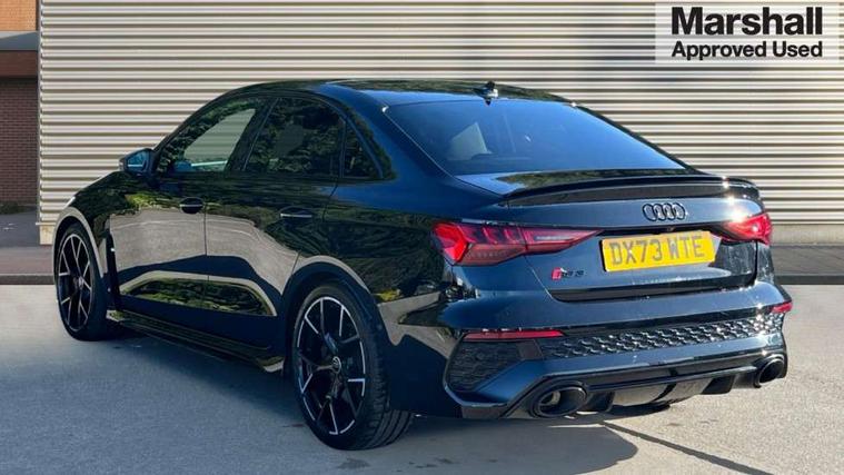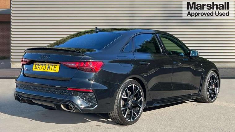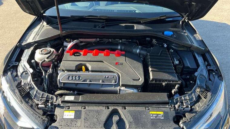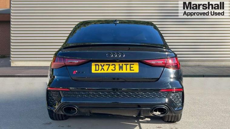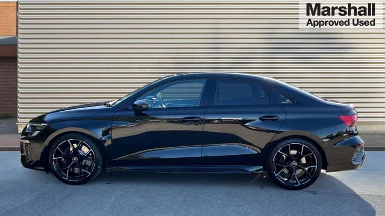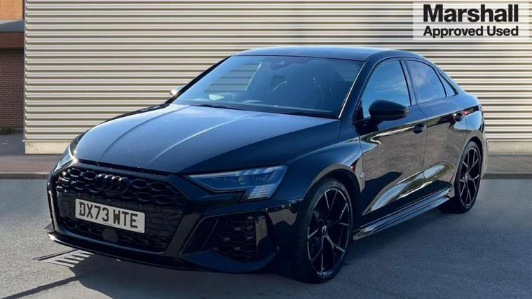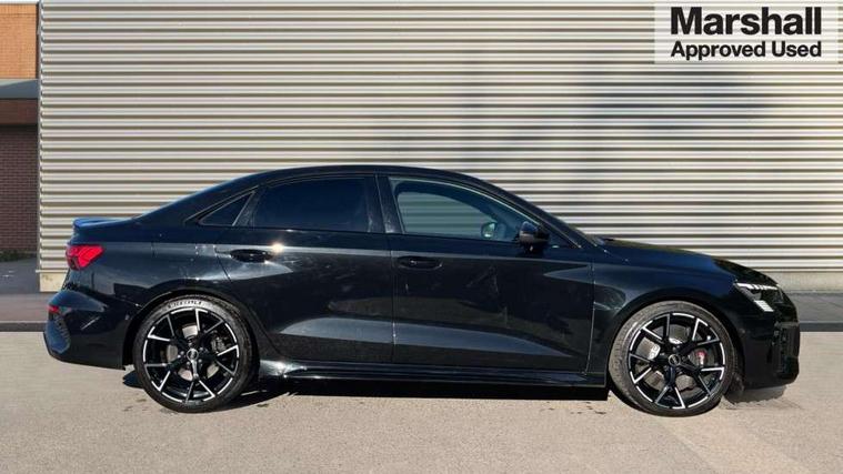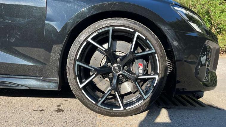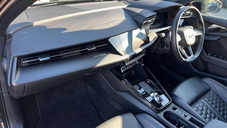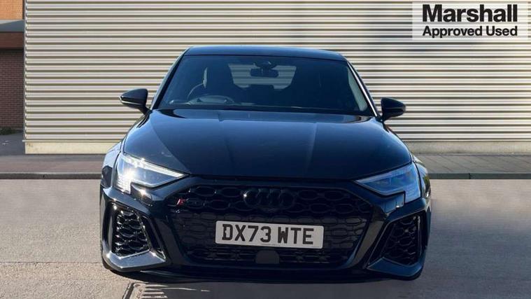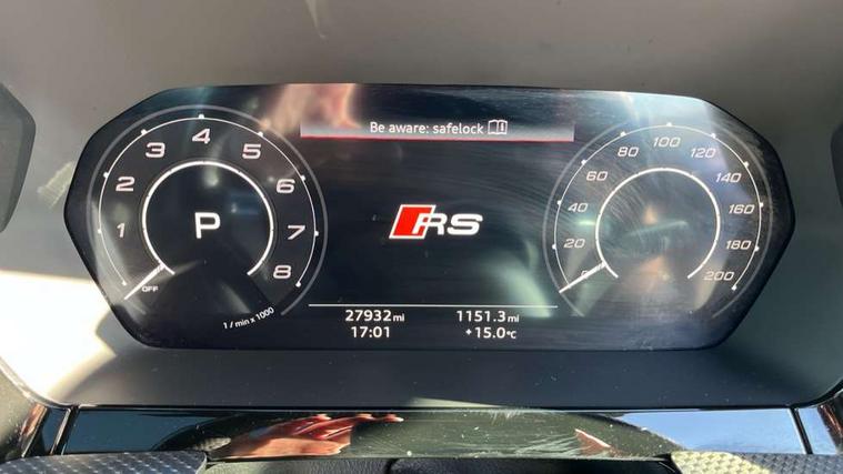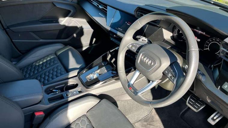 Audi smartphone interface, Audi virtual cockpit with RS specific display 12.3" full colour digital instrument cluster, Automatic start/stop system with recuperation, Bluetooth interface, Collision avoidance assistant, Emergency e-call, Head up Display, Lane departure warning system, Legal emergency call, Parking assist with parking system plus, Power operated tailgate - Luggage compartment lid opens electrically, Progressive power assisted steering, Reversing camera, Quattro permanent four wheel drive, Rear suspension, DAB Digital radio, 3rd brake light, Acoustic glass windscreen, Audi beam uses LEDs to project the Audi sport logo onto the ground as you exit your RS 3, Audi matrix LED headlights, LED rear lights, dynamic front and rear indicators and headlight cleaning system, Auto dimming rear view mirror, Black side skirts, Body colour roof, Carbon fibre engine cover, Electric adj heated/folding + auto dimming exterior mirrors with memory + LED indicator + auto kerb side function for passenger side exterior mirror, Front spoiler in high gloss black, Heat insulating glass windscreen, LED daytime running lights, Light and rain sensors, Panoramic glass sunroof, Privacy glass - dark tinted rear and rear side windows from B-pillar backwards, Rear boot, Rear side wing doors, RS exterior features in gloss black, RS sports exhaust system, 3 seat bench in 2nd row, 3 spoke leather multifunction steering wheel with gear shift paddles, 4 way lumbar support for front seats, 40/20/40 split folding rear seat bench, Black cloth headlining, Dual zone electronic climate control, Electrically adjustable front seats with memory function for driver's side, Front and rear headrests, Front centre armrest, Front sports seats RS embossed logo, Front/rear floor mats, Heated front seats, Honeycomb stitching and RS embossing, Illuminated door sill trims inlays in aluminium with RS 3 logo, RS emblems, Single front passenger seat, Stainless steel pedals and front footrest in black, Aluminium interior elements pack - RS3, Ambient lighting pack - RS3, Comfort and sound pack - RS3, Driver assistance pack with 3 spoke leather multi function steering wheel - RS3, MMI navigation plus with MMI touch - RS3, RS bodystyling - RS3, Storage Pack - RS3, 3x3 point rear seat belts, ABS/EBD, ASR, Audi pre sense front, Driver/Front Passenger airbags, EDL, ESC - Electronic Stability Control + traction control, Front passenger airbag deactivation, Front side airbags with head airbags and interaction airbag, Hill hold assist, Seat belt reminder with passenger presence detection in rear, Tyre pressure loss indicator, Warning triangle and first aid kit, Anti theft alarm, Anti-theft wheel bolts, Electronically operated child lock, Remote control central locking, Full decorative carbon trim, 19" 5 Y spoke black with graphic print alloy wheels, Tool kit, Tyre repair kit,