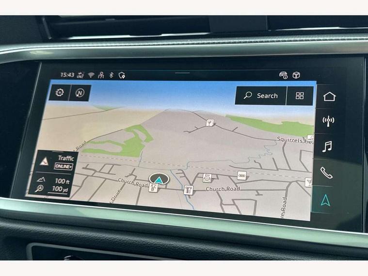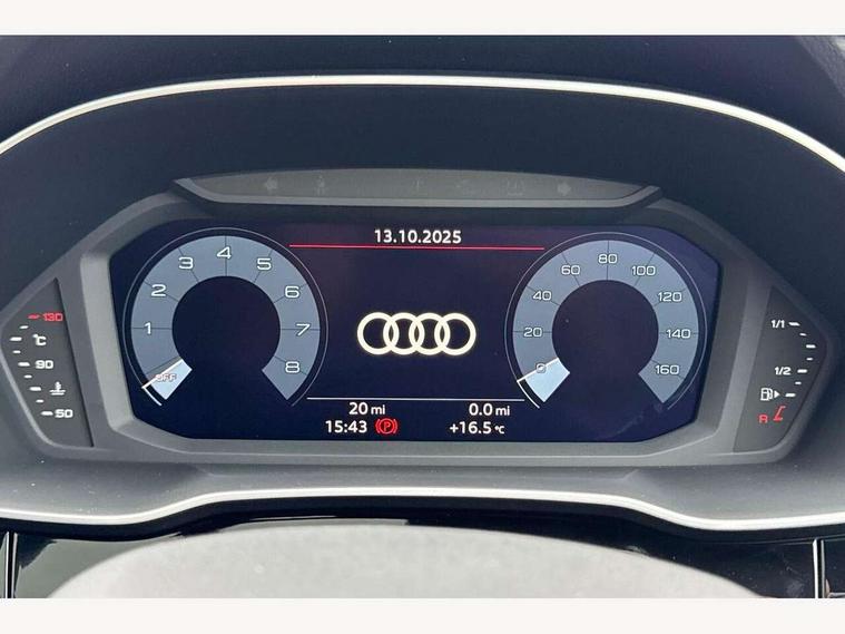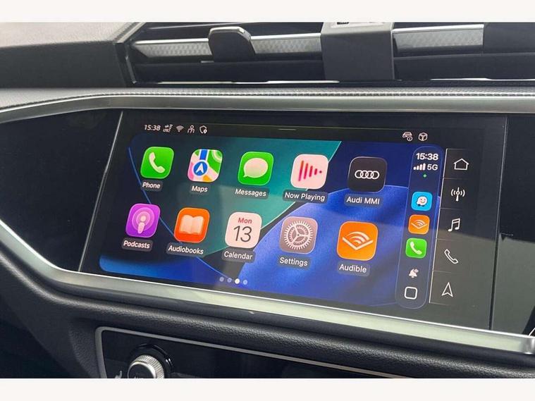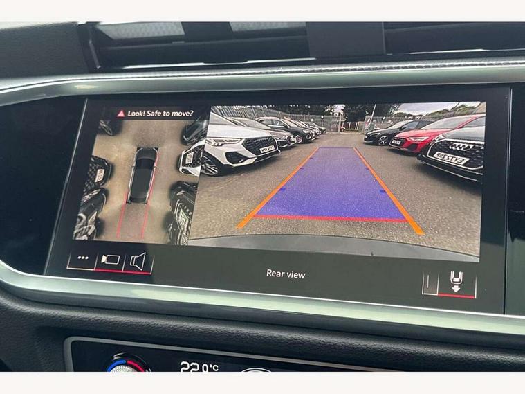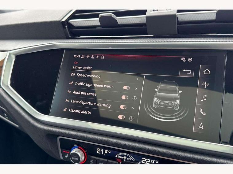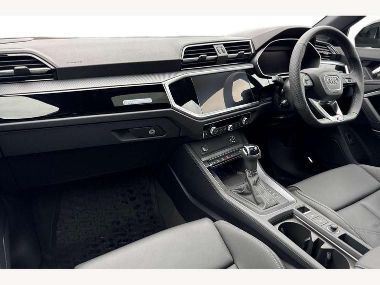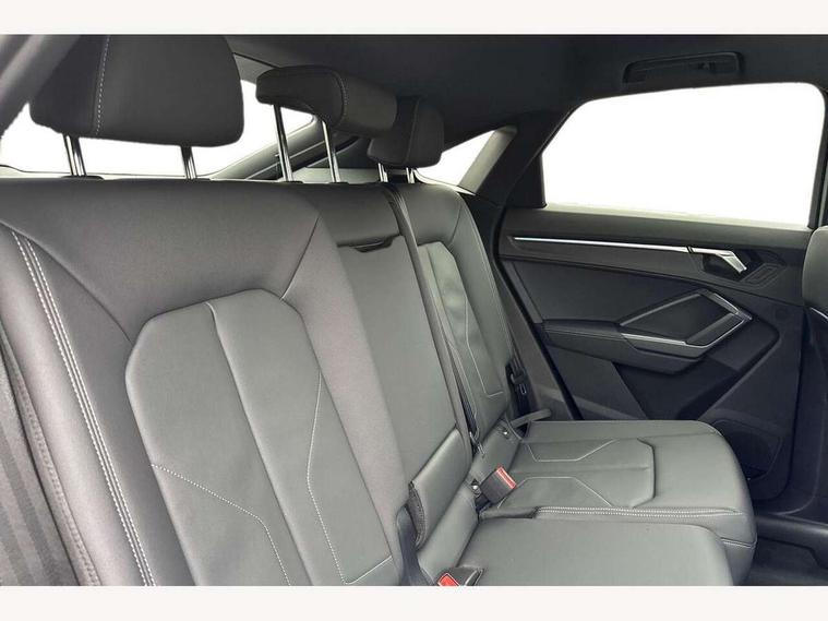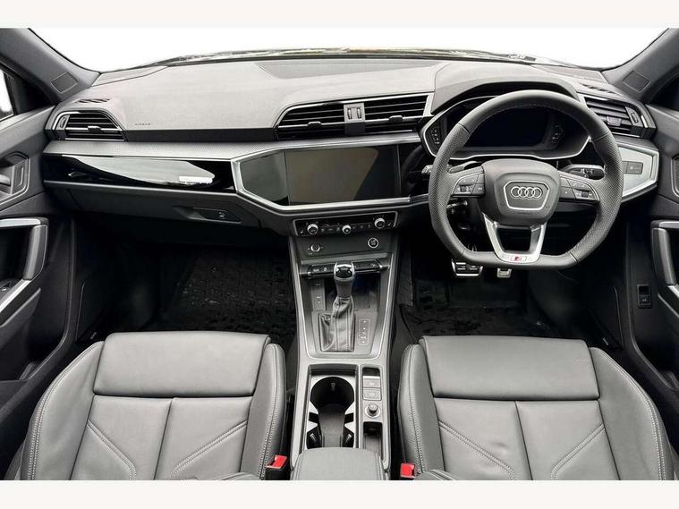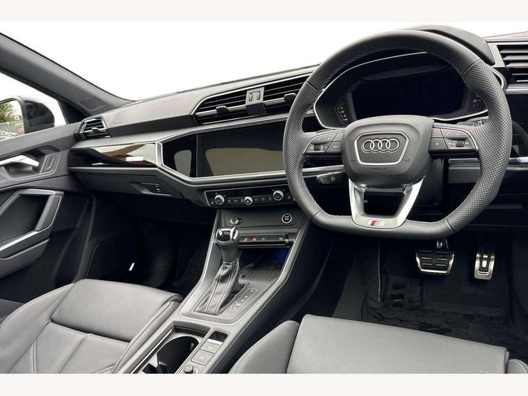 Audi connect safety and service, Audi drive select, Audi lane departure warning, Audi Virtual Cockpit - 10.25" display, Bluetooth interface, Camera based traffic sign recognition, Distraction and Fatigue warning, Legal emergency call, MMI Navigation Plus with high resolution 10.1 inch touchscreen colour display, Power operated tailgate, Progressive steering, Service interval indicator, Smartphone interface includes wireless Apple carplay/Android Auto, Start stop system with recuperation, Voice control system with natural language interaction, Sports suspension, 2 USB-C ports with charge and data functions, 6 passive loudspeakers, DAB digital radio module, Acoustic windscreen, Audi Beam uses LEDs to project the Audi logo onto the ground as you exit your Q3, Auto dimming door mirrors, Auto dimming frameless rear view mirror, Electrically folding, adjustable and heated door mirrors with integrated LED side indicators and kerb view function for passenger side, Front and rear electric windows, Front fog lights, Front underbody protection in manhattan grey paint finish, High gloss black finish B and C pillars, Honeycomb design radiator grille in matt anthracite black, LED Dynamic rear indicators, LED headlights with LED daytime running lights, LED rear lights, LED third brake light, Privacy glass dark tinted rear and rear-side windows (from B-pillar backwards), Rain and light sensors, Rear diffuser grille in grained matt black, Rear diffuser strip in matt anthracite black, Rear side wing doors, Rear underbody protection in matt black, Rear wiper, S line front and rear bumpers and side skirts in contrasting Manhattan grey paint finish, Variable front intermittent wipers, 12V socket in rear centre console, 3 seat bench in 2nd row, 40:20:40 folding with manual adjustment for 60:40 forwards/backwards position and backrest angle, Adjustable rear seat bench/backrest with centre armrest and cupholder, Black carpet mats, Black cloth headlining, Dual zone electronic climate control, Electric lumbar support, Front and rear black floor mats with contrast stitching in rock grey, Front and rear headrests, Front centre armrest, Height and reach adjustable steering wheel, Illuminated door sill trims with S logo, ISOFIX child seat mounting for front passenger with airbag deactivation and outer rear seat including top tether attachment point for outer rear seats, Luggage compartment sill protection in stainless steel, Manual front seats with height adjustment, Perforated leather gearknob, Single front passenger seat, Stainless steel pedals, Twin leather upholstery with front sport seats + S embossing, Black styling pack - Q3, Non smoking pack - Q3, 3x3 point rear seatbelts, 6 airbags - Driver, front passenger, curtain and side windows, Audi pre-sense front with pedestrain and cyclist recognition, Electrically operated child locks on rear doors, Electromechanical parking brake, Electronic stabilisation control including ABS, ASR and EDL, Front seatbelt reminder, Hill descent control, Hill hold assist, Pre sense basic, Seatbelt monitoring, Tyre pressure warning, Warning triangle and first aid kit, Anti theft wheel bolts, Immobiliser, Remote central locking, Thatcham approved category 1 anti theft alarm, Aluminium look interior elements, Detail dashboard around MMI touch colour display in glass look, black with surround in aluminium look, Leatherette door armrest, Piano black inlay,