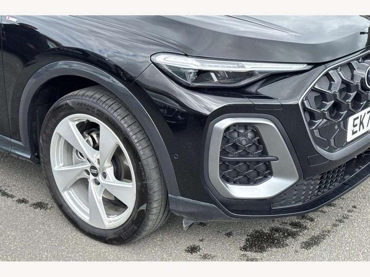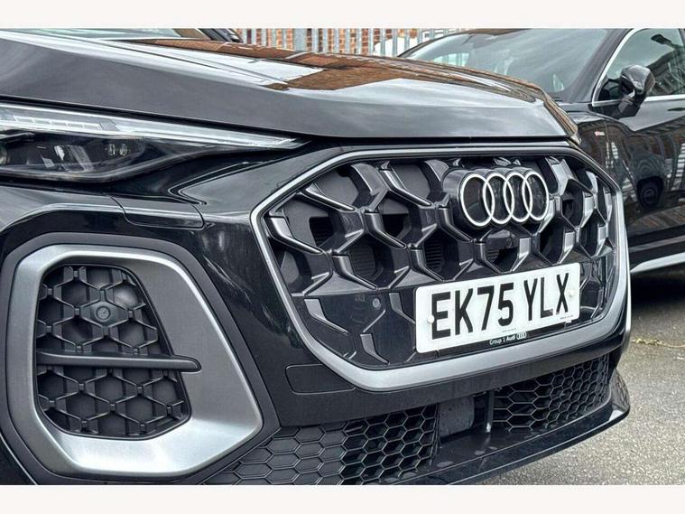 Adaptive cruise control, Advanced driver attention alert, Audi application store, Audi connect emergency call and service, Audi drive select, Audi smartphone interface, Audi virtual cockpit plus with 11.9" OLED colour display, Camera based traffic sign recognition, Fatigue monitor, Front cross traffic intersection assist, Lane departure warning system, MMI navigation plus with high resolution 14.5" OLED touchscreen colour display, Park assist plus, Parking system plus with 360 display, PAS, Reversing camera, Traffic sign based speed limiter, 2 USB-C ports in both the front and rear, Audi sound system impressive sound with 8 loudspeakers including centre speaker and subwoofer, 6-channel amplifier with a total output of 180 watts, DAB Digital radio, Smartphone compartment with wireless charging, Auto dimming rear view mirror, Body coloured door mirrors, Coming/leaving home lighting function, Electrically adjustable heated and folding + automatically dimming exterior mirrors, Front and rear electric windows, Front door sill trims with aluminium inlays, illuminated with 'S' logo, Grill frame, inlay and front air inlets in matt anthracite chrome, Headlight cleaning system, Heated rear window, High beam assist, High gloss window surrounds, LED headlights plus incl. digital DRL, dynamic coming and leaving home function with turning/all weather/motorway/manouevring and intersection lights, LED rear lights pro incl. dynamic rear indicators and illuminated light strip with animated coming and leaving home function, Logo projection light in exterior mirrors, Privacy glass, Projection third brake light for rear window in LED, Radiator grille in phantom black, Rear and side windows with heat insulating glass, Rear honeycombe grille in matt black with inlay in matt anthracite chrome, Rear side wing doors, Rear wash/wipe, S Line badge on the front wings, S line bumpers in contrasting Volcano grey metallic paint finish, Towbar preparation, Windscreen with acoustic glazing, 3 rear head restraints, 3 seat bench in 2nd row, 3 spoke leather steering wheel with multi-function buttons with touch control, flattened on top and bottom, with S badging and contrast stitching, Comfort centre armrest front, Deluxe 3 zone electronic climate control, Front and rear floor mats, Front sport seats with integrated head restraints, Headlining in black cloth, Heated front seats, i-Size child seat mounting on the front passenger side and outer rear seats, i-Size and top tether on the outer rear seats, Interior trim in aluminium look, Luggage compartment lid, electrically opening and closing, Manual steering column adjustment, S embossed logo on front sport seats, Single front passenger seat, Softwrap in leatherette, Stainless steel pedals and footrest, Steering wheel grips in perforated leather and shift paddles, Ambient lighting package plus - Q5, 3x3 point rear seatbelts, ABS, Acoustic vehicle alerting system, Convenience key with safelock, Driver and front passenger airbag with passenger airbag deactivation, Electric child safety locks, First aid kit with warning triangle and high visibility vests, Front emergency brake assist, Front side airbags with head airbag system and front interaction airbag, Hill hold assist, Rear seat occupant reminder, Tyre pressure loss indicator, Anti theft alarm, Anti-theft wheel bolts, Accent surfaces and control buttons in gloss black, Anthracite matt brushed aluminium inlays with linear embossing, Black dashboard with contrast stitching, Upper and lower interior elements in artificial leather, Tyre repair kit,