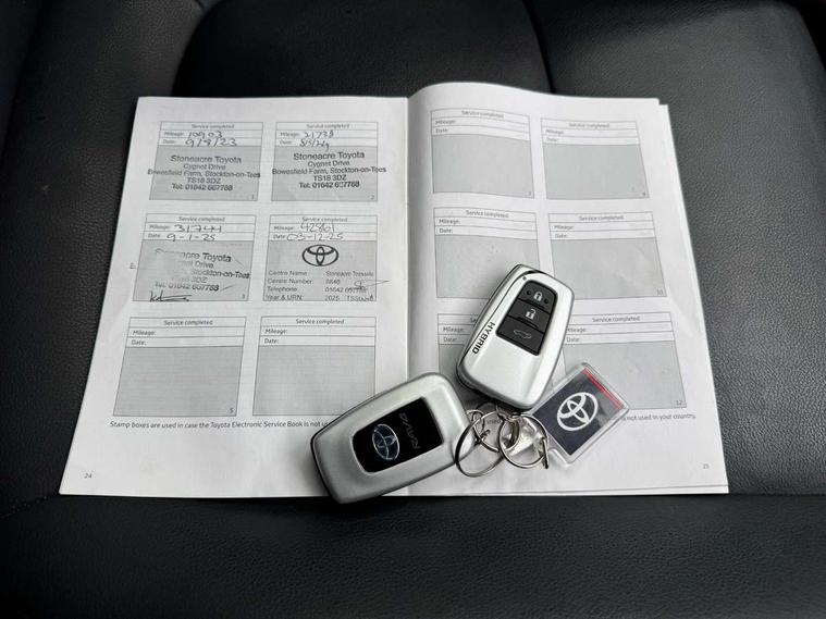 7" TFT multi information display, Analog tachometer, Apple car play and Android auto, Blind spot monitoring with rear cross traffic alert, Bluetooth system, Cyclist Detection, Drive mode selector, eCall emergency call system, ECO-driving indicator, Electric power steering, EV audible alert, Front parking sensors, Full range intelligent adaptive cruise control, Hybrid system indicator, Lane departure warning system, Lane trace assist, Lights on warning, Low screen washer fluid warning, Memory on adjustable speed limiter, MirrorLink, My T Connected services, Night Time Pedestrian Detection, Power boot opening and closing, Push button start, Rear parking camera, Rear parking sensors, Remote boot door release in cabin, Remote boot door release in key, Road sign assist - RSA, Touch 2 Go navigation system including 3D maps and voice control, Traffic sign recognition, Trip computer, Voice control system, Vehicle Stability Control (VSC), 6 speakers, 8" Multimedia display touch screen, Auxiliary socket for external MP3 player, DAB audio, Toyota touch media system, USB connection, Adaptive automatic high beam, Automatic headlamp levelling, Automatic headlights, Automatic wipers, Automatically retractable door mirrors, Black roof rails, Body colour door handles, Body colour door mirrors, Body colour rear spoiler, Body colour roof, Body coloured bumpers, Body coloured Shark-fin antenna, Door mirror puddle lights, Dual exhaust pipes, Electric adjustable door mirrors, Electrochromatic rear view mirror, Emergency brake-light signal (EBS), Follow me home headlights, Front fog lights, Front wiper de-icer, Front wipers with variable intermittent facility, Headlight cleaners, Heated door mirrors, LED daytime running lights, LED High mounted stop lamp, LED rear combination lights, Meshed shape upper front grille, Power front windows, Power rear windows, Privacy glass, Projector LED headlights, Rear screen wiper - intermittent, Rear side wing doors, Rear windscreen defogger, Rear wing door, Silver front under-run, Silver rear under-run, Trailer sway control, Turning signal integrated indicators in door mirrors, 12 volt front socket, 3 rear headrests, 3 seat bench in 2nd row, 60/40 split fold rear seat back, Boot light, Clean air filter, Driver and front passenger personal light, Driver and front passenger Whiplash Injury Lessening seats, Driver and passenger sunvisors with illuminated vanity mirrors, Driver seat memory function, Dual sided deck board in boot, Dual zone automatic air conditioning, Floor mats, Folding rear centre armrest, Front and rear bottle holders, Front centre armrest, Front footwell lights, Front headrests, Front passenger seat, Front seat and rear pockets, Front/rear roof mounted assist grips, Grey roof lining, Heated driver and front passenger seats, Heated steering wheel, Illuminated entry system, Isofix child seat preparation, Leather gear shift with chrome surround, Leather upholstery, Light blue ambient lighting on front cupholders and open tray, Luggage area tonneau cover, Manual telescopic and tilt 3-spoke leather steering wheel with Chrome insert, Manually reclining and sliding front passenger seat, Multimedia switches on steering wheel, Pollen filter, Power height-adjustable sliding reclining and lumbar support for driver seat, Rear coat hooks, Rear door armrests, Rear passenger air vents, Rear view display in display audio screen with dynamic guide lines, Reclining rear seats, Satin chrome interior door handles, Sunglasses holder, Telephone and voice recognition switches on steering wheel, 3x3 point rear seatbelts, ABS/EBD, Acoustic vehicle alerting system, Adjustable front driver and passenger seat belt extender, Brake assist function, Brake hold function, Child proof door locks, Collision mitigation braking system, Driver/Front Passenger airbags, Driver/front passenger side airbags, Drivers knee airbag, Electronic parking brake, Electronic Stability Programme (ESP), Front and rear curtain airbags, Front and rear seatbelt reminder, Front passenger airbag detector, Hill start assist, Passenger airbag cut-off device, Pedestrian detection, Pre collision system, Seatbelt pretensioners with load limiters, Toyota safety sense, Traction control, Tyre pressure warning, Glass-breaking alarm sensors, Immobiliser, Intrusion alarm, Light - on and Key in reminder, Motion sensor alarm, Remote central locking, Smart entry + Smart start, Speed sensitive auto door locking, Tilt detection sensors, Piano black centre console with silver insert, Soft-touch black lower dashboard, Soft-touch black upper dashboard with silver insert, 19" 10 spoke silver alloy wheels, Full size spare wheel,