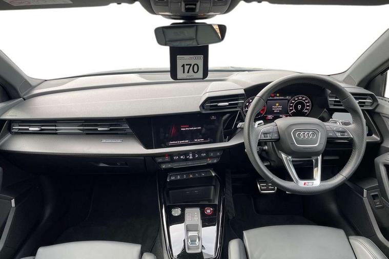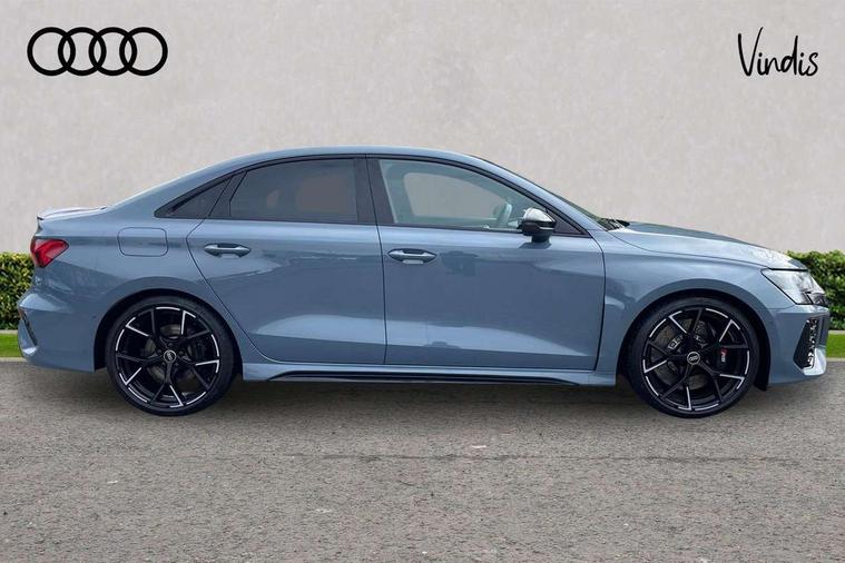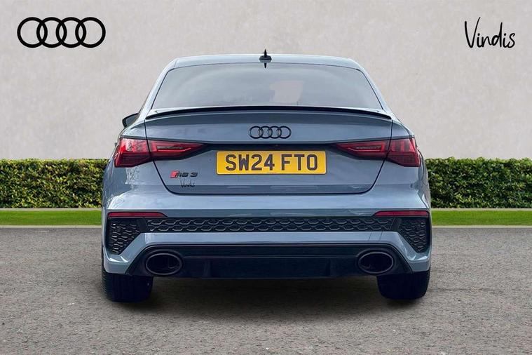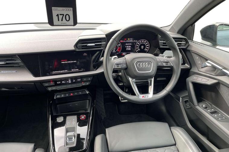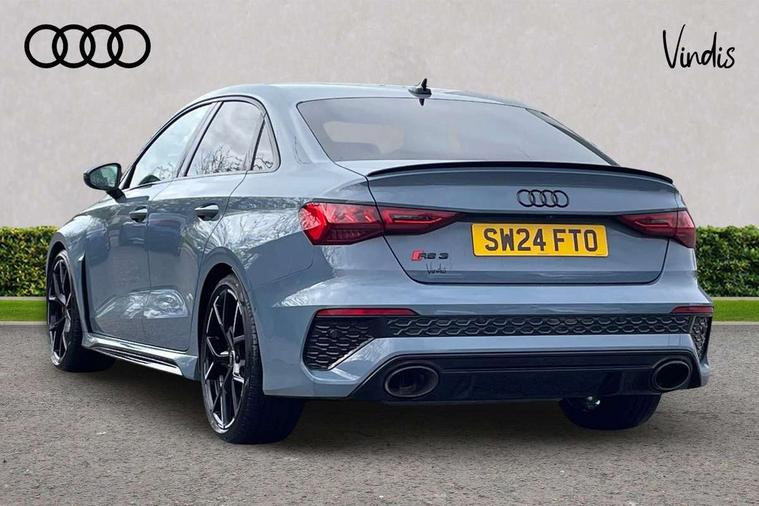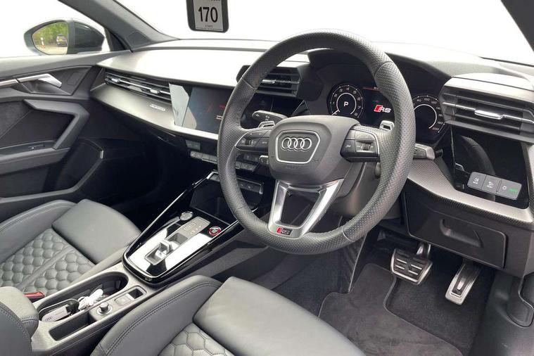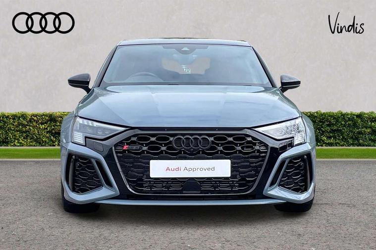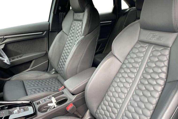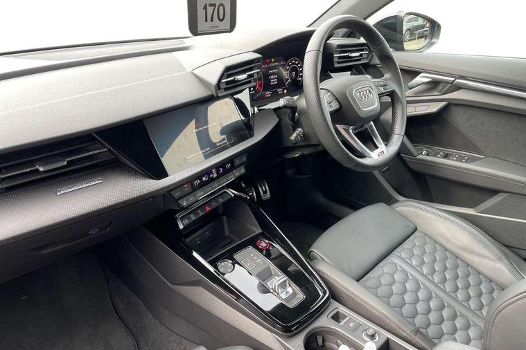 Audi smartphone interface, Audi virtual cockpit with RS specific display 12.3" full colour digital instrument cluster, Automatic start/stop system with recuperation, Bluetooth interface, Collision avoidance assistant, Emergency e-call, Head up Display, Lane departure warning system, Legal emergency call, Parking assist with parking system plus, Power operated tailgate - Luggage compartment lid opens electrically, Progressive power assisted steering, Reversing camera, Quattro permanent four wheel drive, Rear suspension, DAB Digital radio, 3rd brake light, Acoustic glass windscreen, Audi beam uses LEDs to project the Audi sport logo onto the ground as you exit your RS 3, Audi matrix LED headlights, LED rear lights, dynamic front and rear indicators and headlight cleaning system, Auto dimming rear view mirror, Black side skirts, Body colour roof, Carbon fibre engine cover, Electric adj heated/folding + auto dimming exterior mirrors with memory + LED indicator + auto kerb side function for passenger side exterior mirror, Front spoiler in high gloss black, Heat insulating glass windscreen, LED daytime running lights, Light and rain sensors, Panoramic glass sunroof, Privacy glass - dark tinted rear and rear side windows from B-pillar backwards, Rear boot, Rear side wing doors, RS exterior features in gloss black, RS sports exhaust system, 3 seat bench in 2nd row, 3 spoke leather multifunction steering wheel with gear shift paddles, 4 way lumbar support for front seats, 40/20/40 split folding rear seat bench, Black cloth headlining, Dual zone electronic climate control, Electrically adjustable front seats with memory function for driver's side, Front and rear headrests, Front centre armrest, Front sports seats RS embossed logo, Front/rear floor mats, Heated front seats, Honeycomb stitching and RS embossing, Illuminated door sill trims inlays in aluminium with RS 3 logo, RS emblems, Single front passenger seat, Stainless steel pedals and front footrest in black, Aluminium interior elements pack - RS3, Ambient lighting pack - RS3, Comfort and sound pack - RS3, Driver assistance pack with 3 spoke leather multi function steering wheel - RS3, MMI navigation plus with MMI touch - RS3, RS bodystyling - RS3, Storage Pack - RS3, 3x3 point rear seat belts, ABS/EBD, ASR, Audi pre sense front, Driver/Front Passenger airbags, EDL, ESC - Electronic Stability Control + traction control, Front passenger airbag deactivation, Front side airbags with head airbags and interaction airbag, Hill hold assist, Seat belt reminder with passenger presence detection in rear, Tyre pressure loss indicator, Warning triangle and first aid kit, Anti theft alarm, Anti-theft wheel bolts, Electronically operated child lock, Remote control central locking, Full decorative carbon trim, 19" 5 Y spoke black with graphic print alloy wheels, Tool kit, Tyre repair kit,