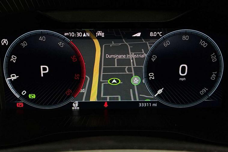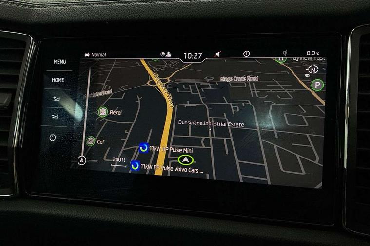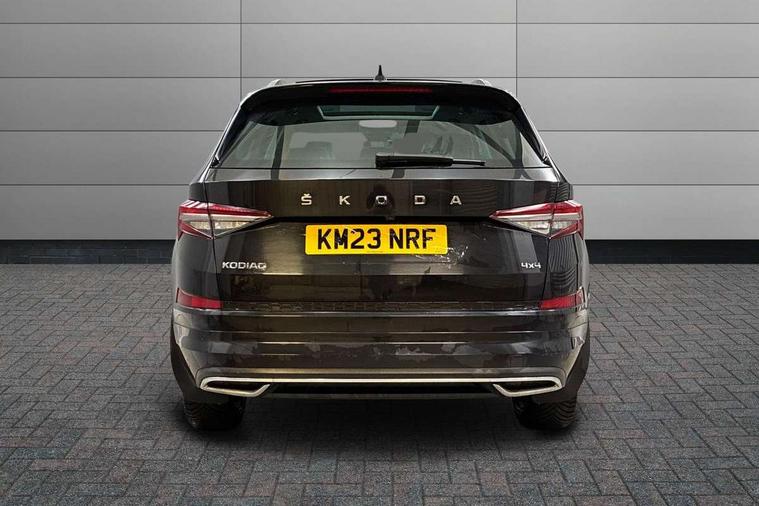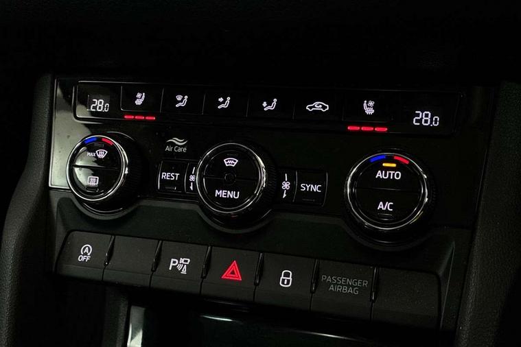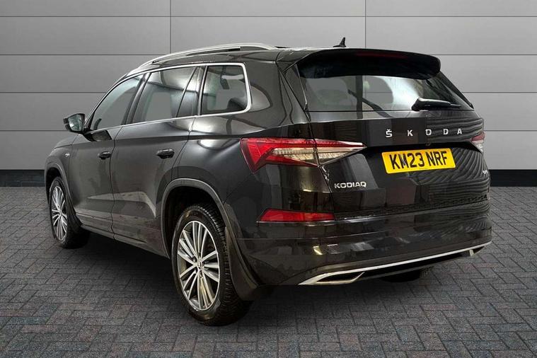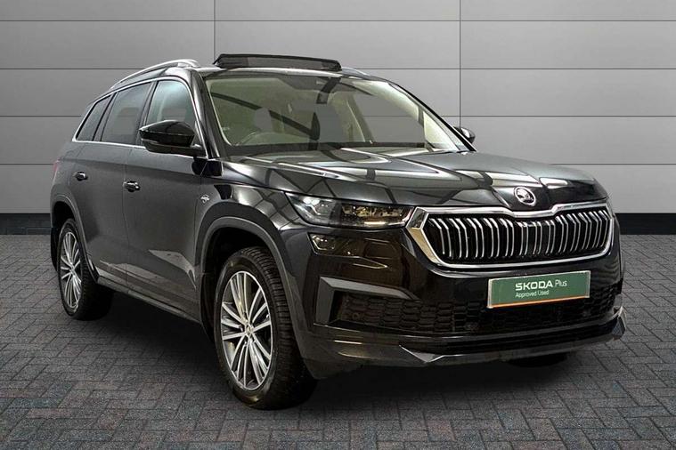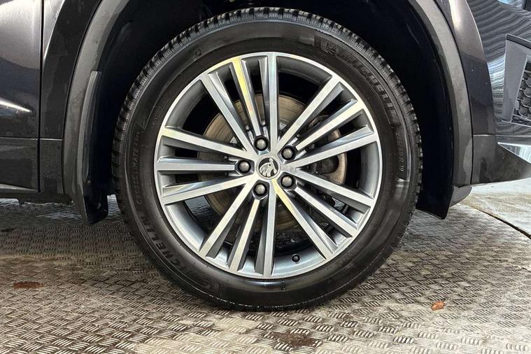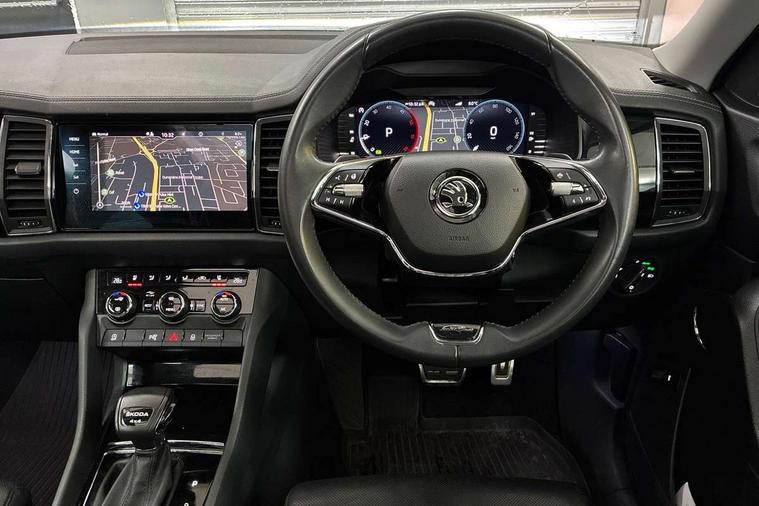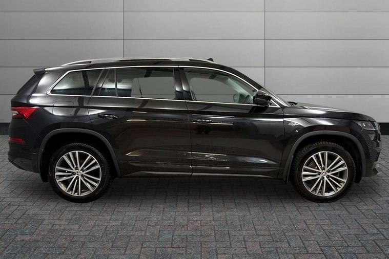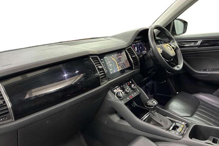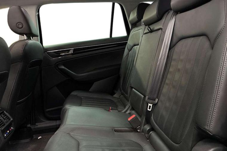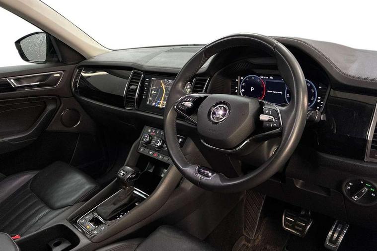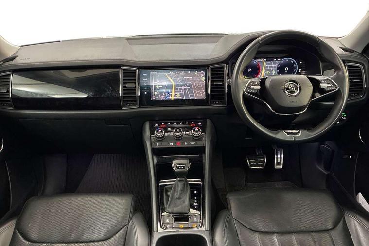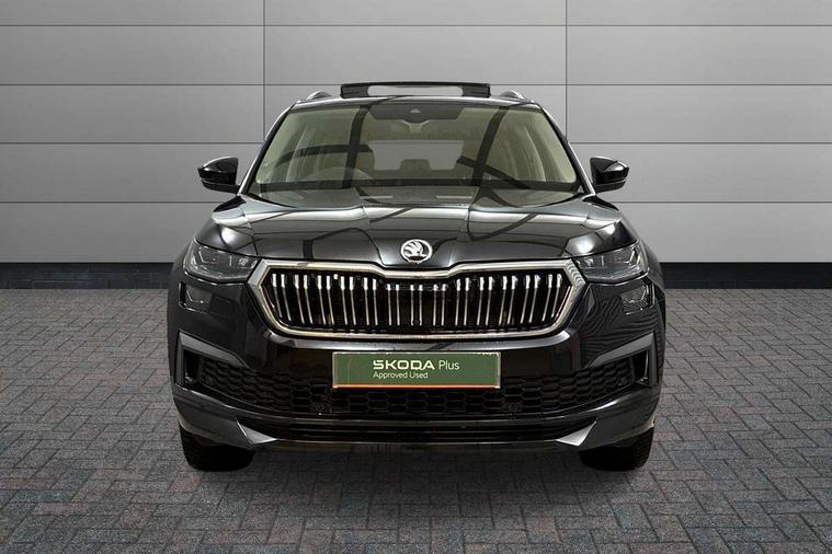 Area view, Blind spot detection system, Bluetooth system, Columbus satellite navigation with 9.2" touchscreen, integrated Wi-Fi, web radio, Digital voice enhancement, e call+, ECO Stop/start function, Exterior temperature indicator, Progressive steering, Smartlink wireless for apple carplay and wired for android auto, Speed limiter, USB C Port x 2 in front centre console, Virtual Cockpit - 10.25" digital display, Wireless charging, Canton sound system, DAB Digital radio, Aero front windscreen wipers with intermittent function, Aero rear window wiper, Auto dimming rear view mirror, Black wheel arch surrounds, Body colour bumpers, Body colour door mirrors and handles, Body colour door panels, Chrome front grille, Chrome roof rails with chrome window surround, Electric adjustable/heated/folding door mirrors, driver side auto dimming with boarding sports and memory function, Electric front and rear windows, Extended rear spoiler with finlets in gloss black, Front fog lights, Full LED matrix headlights with AFS (adaptive front light system), cornering function and AWL (all weather lighting system), Headlight washers, Heated rear window, Invisible tailpipe, L&K front and rear bumpers including lower rear chrome strip, LED daytime running lights, LED rear fog light, LED third brake light in rear spoiler, Light assistant (coming/leaving home/tunnel light), Off-road style lower front bumper element, Panoramic sunroof, Privacy glass, Rain and light sensors, Rear LED lights (high functionality) with welcome effect and dynamic indicators, Rear side wing doors, Safety reflectors on front and rear doors, Window control switches with black trim, Without engine designation, 12V socket in boot, 2 rails with 2 hooks, 2 seat bench in 3rd row, 3 seat bench in 2nd row, 4 foldable roof handles with rear coat hooks, 60:40 foldable rear seat with sliding adjustment and backrest angle adjustment, Aluminium pedals, Bottle holders in door panel in the 1.5 litre front and 1 litre rear, Cargo storage compartments, Chrome headlight control button, Chrome interior door handles, Coat hooks on B pillar, Covered storage compartment on driver side, Decorative door sill covers, Front and rear door armrest with black adductor trim, Front centre armrest with storage compartment, cup holder and 12V socket, Front courtesy lights, Gear shift lever with chrome frame and black gloss insert, Grey stitching in front and rear armrests and door armrests + door inserts, Height adjustable front headrests, Illuminated and cooled glovebox, Illuminated luggage compartment, Isofix child seat fittings in outer rear seats with top tether, Manually adjustable steering column, Net programme in boot (1x horizontal Net, 2x vertical Nets), Overhead glasses storage compartment, Pollen filter, Rear centre armrest with cupholders, Single front passenger seat, Sliding trunk cover, Small Bags on the inner sides of the front backrests, Sunvisors with illuminated vanity mirrors, Three rear height adjustable headrests, Ticket holder on A Pillar, Umbrella in door panel, Variable boot floor, LED Interior light pack - Kodiaq, Auto door release and activation of warning lights, Child locks on rear doors, Driver and front passenger airbag with knee airbag and front passenger airbag deactivation, Electronic parking brake with hill start assist, Emergency rear braking signal, ESC (incl. ABS+MSR+ASR+EDS+HBA+DSR+RBS+MKB), Front assist with autonomous emergency braking, Front side airbags with curtain airbags, Fuel cut off safety device, Height adjustable front 3 point seatbelts + pretensioners, Hill hold control, Rear disc brakes, Safety vest holder in door, Seat belt reminder for all seats, Tailgate unlocking from outside, Three point rear seat belts, Two tone horn, Tyre pressure monitor, Alarm with interior monitoring and tilt sensor with safe function, Anti-theft wheel bolts, Immobiliser, Keyless entry and start system (KESSY), Remote central locking with 2 keys, Grey stitching in dashboard, Piano black decorative inserts, Plaquette L&K front fenders, Temporary spare wheel (space saver),