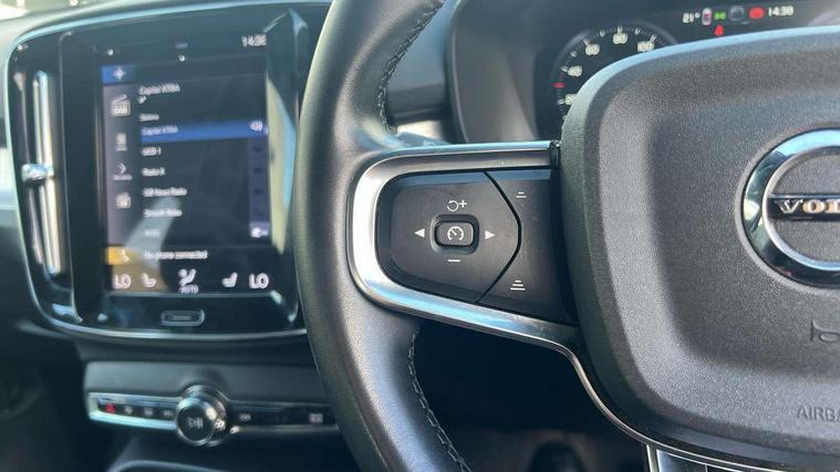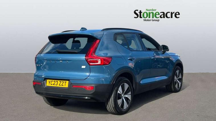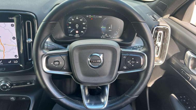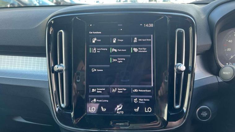 12.3" Active TFT crystal driver's instrument display, 360 degree surround view parking camera, 9" centre console portrait touch screen, Adjustable steering wheel force, Bluetooth hands free telephone kit, Cruise control, Drive mode selector, E-call, Front park assist, Hands free power tailgate, Lane keep assist with driver alert control, Oncoming Lane Mitigation, Rear park assist, Sensus navigation with European mapping and traffic information, Speed limiter, Speed sensitive steering, Voice activated control for key functions, Wireless Smartphone Integration includes Apple CarPlay and Android auto, Wireless/Inductive Mobile Phone Charging, 3.7 kW monophase on board charger, 7m 10amp charge cable with 3 pin plug and 7m 1 phase 16amp type 2/mode 3 charge cable, Dynamic chassis, Electric front axle drive, Recharging port located in nearside front wing, DAB Digital radio, Low speed exterior sound speaker, Sensus connect with high performance sound, 8 speakers/250W, front USB and 2 rear type C USB, Steering wheel mounted remote controls, Adaptive brake lights with high level LED brake lights, Auto dimming feature for exterior door mirrors, Auto dimming interior mirror, Automatic headlamp levelling, Automatic LED Headlights + Active high beam incorporating daytime running lights, Front and rear electric windows, Front recharge aluminium tread plates, High gloss black front and rear skid plate, High gloss black mesh front grille with high gloss black surround, High gloss black window trim, Home safe and approach lighting, Integrated roof rails in high gloss black, LED front fog lights, Puddle lights, Rain sensor with automatic windscreen wiper activation, Rear side wing doors, Rear wiper, Roof antenna, Roof spoiler, Visible VIN plate, 12V socket in front tunnel console and luggage compartment, 2-Zone electronic climate control with CleanZone air quality system and pollen filter, 3 seat bench in 2nd row, 3 Spoke tailored steering wheel with chrome trim, 60/40 versatile split folding rear seat, A-pillar parking ticket holder, C-pillar Recharge logo, Centre console cupholders and storage, Floor mats, Front door pocket, front cupholder, ambient front door, rear reading, rear courtesy, instrument panel and tailgate lighting, Front footwell illumination, Front headrests, Front reading light and theatre lighting, Front seat cushion extensions, Front tunnel pocket, Glovebox bag hook, Heated front seats, Height adjustable passenger seat, Height/reach adjustable steering column, High gloss centre tunnel deco, Illuminated glovebox, Illuminated luggage compartment, Illuminated vanity mirrors, Isofix attachments on outer rear seats, Load protection net, Multi directional lumbar support, Power driver seat with memory + exterior mirrors memory, Rear armrest / integral cup holders / storage tray, Rear headrests, Single front passenger seat, Underfloor cargo storage, Climate pack without heated front seats - XC40, 3x3 point rear seatbelts, City safety includes pedestrian, cyclist and large animal detection and front collision warning with full auto brake, Drivers knee airbag, Dual stage driver/passenger airbags, Electronic parking brake with auto hold, First aid kit, Front and outer rear seatbelt reminder and pretensioners, Front seats SIPS airbags, Hill descent control, Hill start assist, Inflatable curtain, Passenger airbag cut-off device, Power child locks on rear doors, Road sign information display, Run off Road Mitigation, Run off Road Protection, SIPS (Side Impact Protection System), Slippery road and hazard light alert, Stability and Traction Control with Spin control, Engine Drag Control and Corner Traction Control, Tyre pressure monitoring system, Vehicle deceleration control with Anti-lock Brake System, Electronic Brake Distribution and Emergency Brake Assist, Warning triangle, WHIPS whiplash protection system - front, Anti-theft alarm including immobiliser/volume sensor + level sensor, Care key with user defined top speed, Key integrated remote control central locking + fuel flap with deadlocking system and auto open/close power windows, Keyless drive includes keyless entry and keyless start, Locking wheel nuts, Private locking for tailgate,