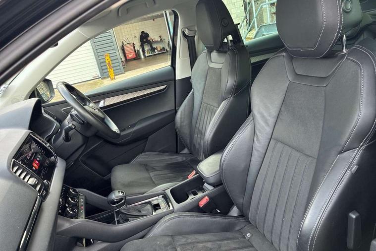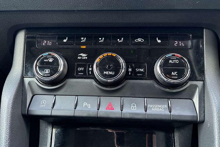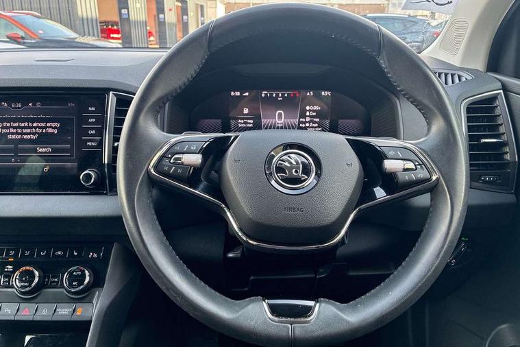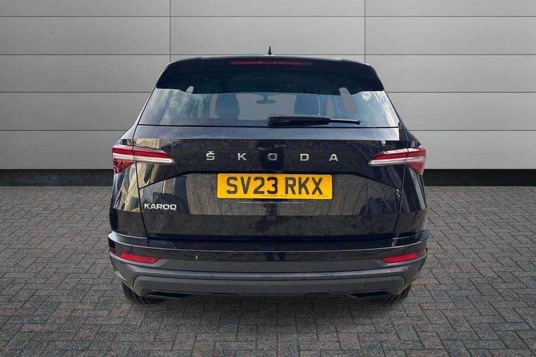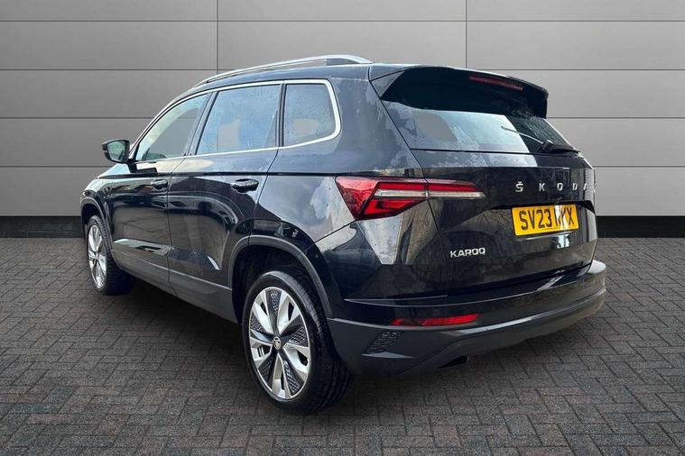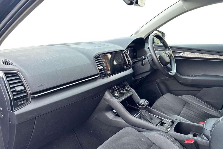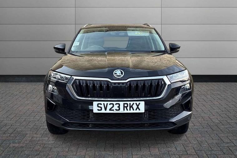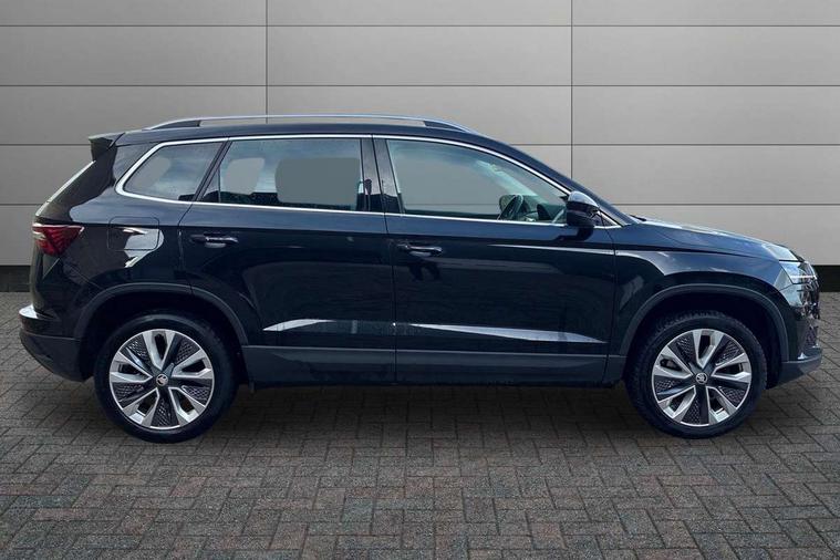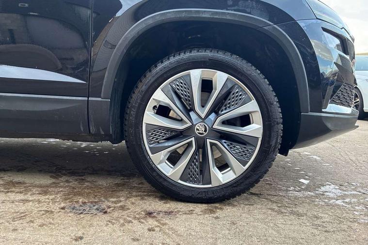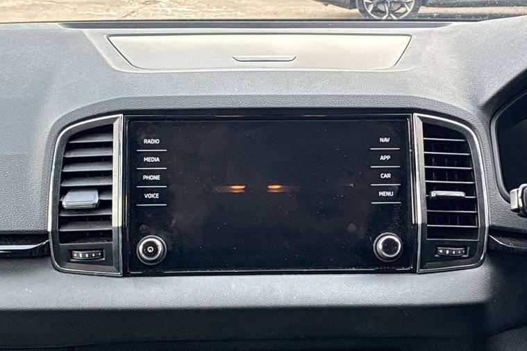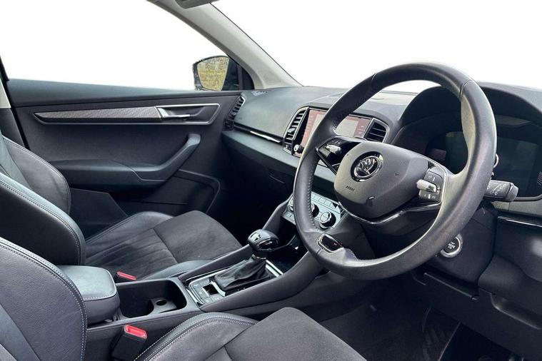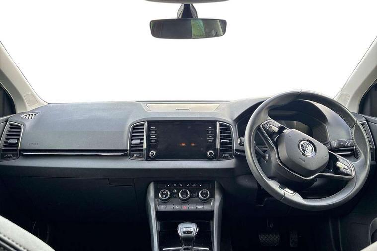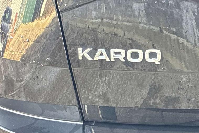 8" Digital display, Care connect, Driver fatigue sensor, Emergency services call system, Outside temperature gauge, Service interval indicator, SmartLink wireless for Apple and wired for Android, Start/stop system with regenerative braking, USB C Port x 2 in front centre console, 8 Speakers, DAB radio with Bluetooth, USB connection, Acoustic glass, Aero front windscreen wipers with intermittent function, Auto dimming rear view mirror with light and rain sensors, Black electric window control buttons, Body colour door mirrors and handles, Dynamic headlight range control with cornering light function, Electric front and rear windows with child proof lock, Heated rear windscreen, LED daytime running lights, LED rear lights with high functionality welcome effect and dynamic indicators, Light assistant (coming/leaving home/tunnel light), Plastic scuff plates, Privacy glass, Rear side wing doors, Rear spoiler, Rear window wiper with washer system and intermittent control, Safety reflectors on front doors, 1.5 litre bottle holders in driver and front passenger door panels, 12V socket in boot, 12v socket in front centre armrest with storage compartment and rear air vents, 2 spoke leather heated multifunction steering wheel with DSG paddles, 2 x Tablet holder, 3 rear height adjustable headrests, 3 seat bench in 2nd row, 4 foldable roof handles with rear coat hooks, Black floor carpet, Chrome inner door handles, Decorative door sills with KAROQ badging, Double sided boot floor, Foldable hooks in the boot, Front head restraints, Height adjustable front three point seats belts with tensioners, Height/reach adjust steering wheel, Ice scraper, Illuminated glovebox, Illuminated luggage compartment, Isofix child seat preparation for front passenger seat, Isofix child seat preparation outer rear, Manual lumbar support for front seats, Pen holder, Pollen filter, Rear boot cover, Rear reading lights, Rubbish bin door, Safety vest holder, Single front passenger seat, Storage box in upper central dashboard closed, Sunvisors with illuminated vanity mirrors, Textile floor mats, Ticket holder, VarioFlex seats with standard rear seat release, Boot pack - Karoq, Chrome roof rails + chrome pack - Karoq, Parking pack - Karoq, Automatic door unlocking in case of crash, Automatic fuel cut off in case of crash, Child locks on rear doors, Driver airbag, Electronic parking brake with auto hold function, Emergency rear braking signal, ESC including ABS, MSR, ASR, EDS, HBA, DSR, RBS, MKB and traction control, Front side airbags, Hill hold control, Knee airbags, Passenger airbag with switch-off function, Pedestrian monitor, Seatbelt reminder signalisation and pretensioner for all seats, Three point seatbelts rear, Two tone horn, Tyre pressure display, Tyre pressure monitor, Alarm with interior monitoring, back up horn and tilt sensor with safe function, Electronic engine immobiliser, Keyless entry and start/stop, Remote central locking with 2 remote folding keys, Chrome framed air vents, 18" Procyon silver alloy wheels with anthracite aero inserts, Anti-theft wheel bolts protection, Storage on wheel cover, Tool kit,