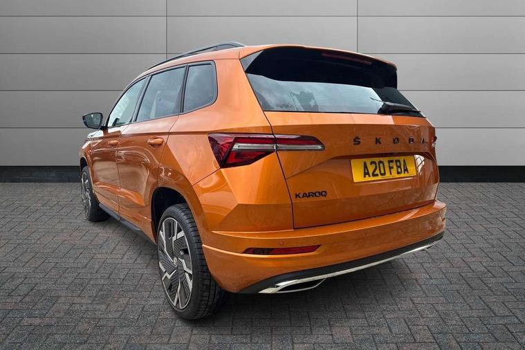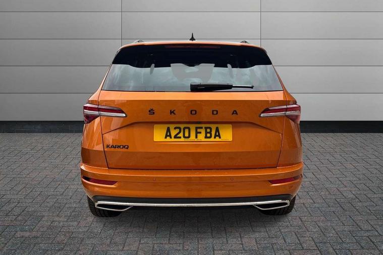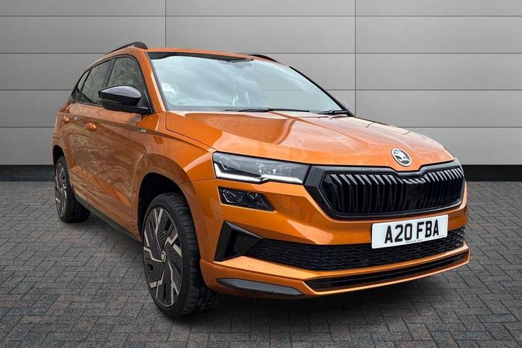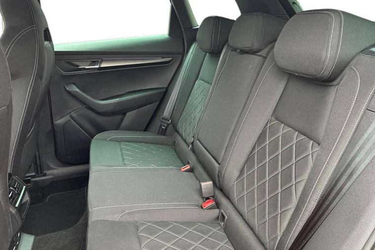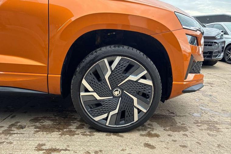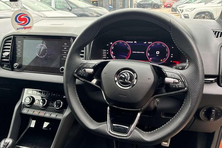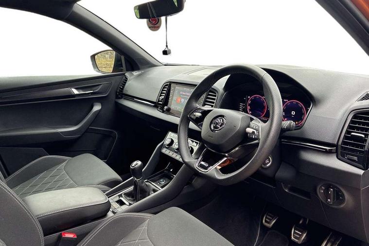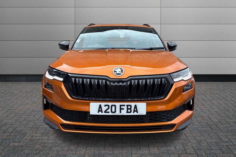 8" Digital display, Advanced driver attention and drowsiness monitor, Emergency services call system, Outside temperature gauge, Sensor for driver assistance systems, Service interval indicator, SmartLink wireless for Apple and wired for Android, Start/stop system with regenerative braking, USB C Port x 2 in front centre console, Virtual Cockpit - 10.25" digital display, Virtual pedal with electrically operated boot door, Wireless smartphone charging, Canton sound system, DAB radio with Bluetooth, USB connection, Acoustic glass, Aero front windscreen wipers with intermittent function, Auto dimming rear view mirror with light and rain sensors, Black door mirrors, Black electric window control buttons, Black radiator grille, Black roof rails, Body colour door handles, Electric front and rear windows with child proof lock, Front door steps with SportLine logo, Heated rear windscreen, LED 3rd brake light, LED daytime running lights, LED rear lights with high functionality welcome effect and dynamic indicators, Light assistant (coming/leaving home/tunnel light), Panoramic sliding sunroof, Plastic scuff plates in door apertures, Privacy glass, Protective door side sills in body colour, Rear diffuser, Rear side wing doors, Rear spoiler, Rear window wiper with washer system and intermittent control, Safety reflectors on front doors, Skoda lettering on tailgate in black, Sportline badge on front fender, Sportline decorative inserts with badging, Sports front and rear bumpers, 1.5 litre bottle holders in driver and front passenger door panels, 12V socket in boot, 12v socket in front centre armrest with storage compartment and rear air vents, 2 x Tablet holder, 3 rear height adjustable headrests, 3 seat bench in 2nd row, 3 spoke leather sports multifunction steering wheel and silver stitching, 4 foldable roof handles with rear coat hooks, Black floor carpet, Chrome inner door handles, Double sided boot floor, Foldable hooks in the boot, Front head restraints, Height adjustable front three point seats belts with tensioners, Height/reach adjust steering wheel, Ice scraper, Illuminated glovebox, Illuminated luggage compartment, Isofix child seat preparation for front passenger seat, Isofix child seat preparation outer rear, Manual lumbar support for front seats, Pen holder, Pollen filter, Rear boot cover, Rear reading lights, Rear seats fixed folding and divided 60:40, Rubbish bin door, Safety vest holder, Single front passenger seat, Storage box in upper central dashboard closed, Sunvisors with illuminated vanity mirrors, Textile floor mats, Ticket holder, Titan black interior ceiling, Umbrella under passenger seat, Under passenger seat storage compartment, Welcome animation with sportline logo, Light Pack - Karoq, Non Smokers pack, Automatic door unlocking in case of crash, Automatic fuel cut off in case of crash, Driver airbag, Electronic parking brake with auto hold function, Emergency rear braking signal, ESC including ABS, MSR, ASR, EDS, HBA, DSR, RBS, MKB and traction control, Front side airbags, Head airbags, Hill hold control, Knee airbags, Passenger airbag with switch-off function, Pedestrian monitor, Seatbelt reminder signalisation and pretensioner for all seats, Three point seatbelts rear, Two tone horn, Tyre pressure monitor, Alarm with interior monitoring, back up horn and tilt sensor with safe function, Electronic engine immobiliser, Keyless entry and start/stop, Remote central locking with 2 remote folding keys, Black air vent surround, Black centre console, carbon door decor, Satin black dashboard, Satin black door trim, 19" Sagittarius anthracite alloy wheels, Anti-theft wheel bolts protection, Breakdown and tool kit,