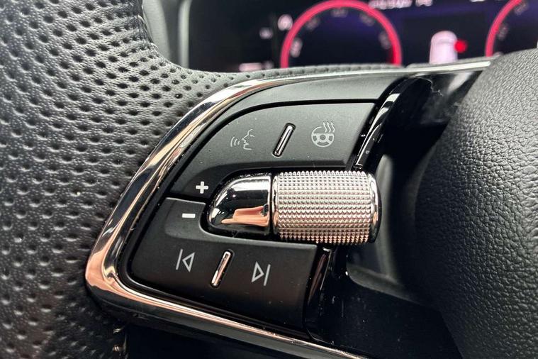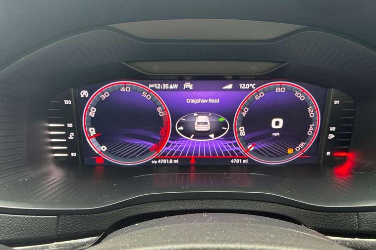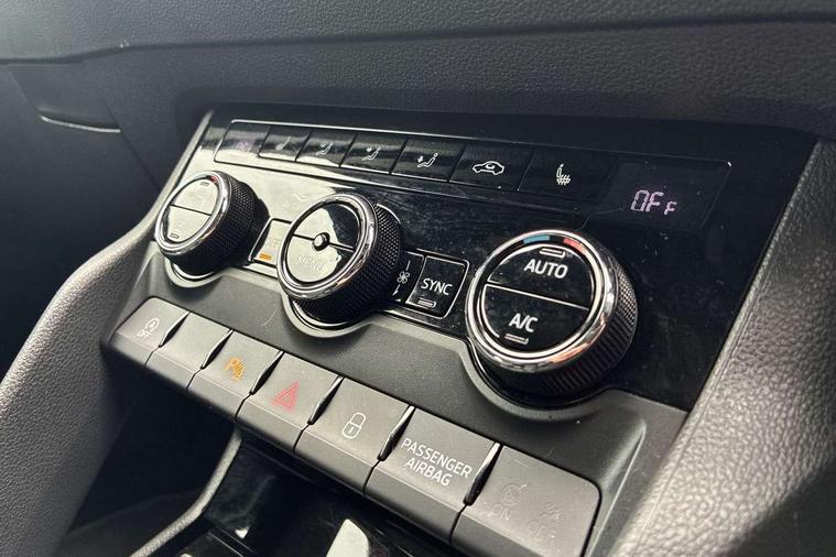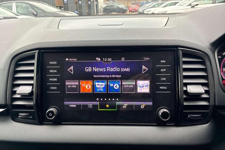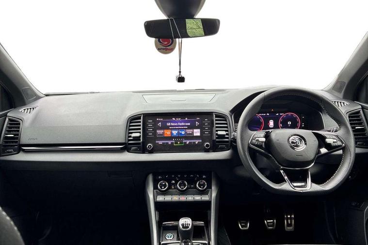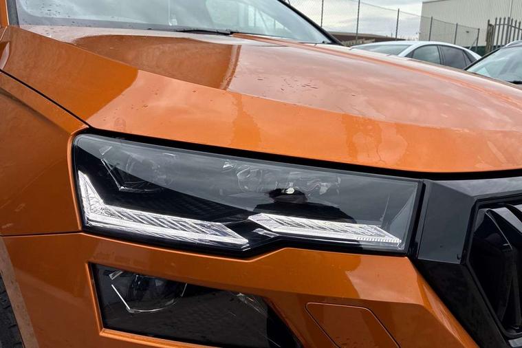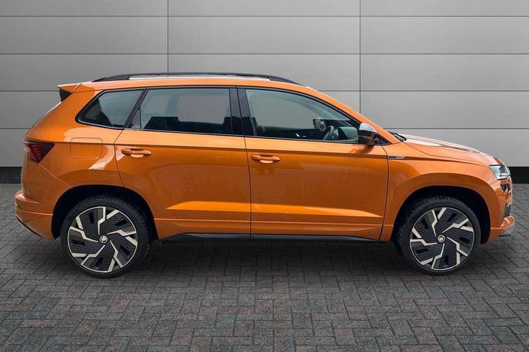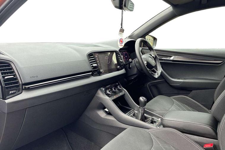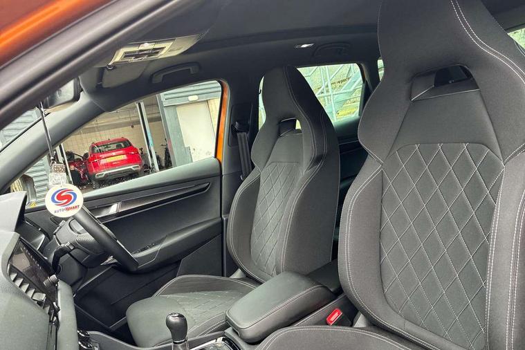 8" Digital display, Advanced driver attention and drowsiness monitor, Emergency services call system, Outside temperature gauge, Sensor for driver assistance systems, Service interval indicator, SmartLink wireless for Apple and wired for Android, Start/stop system with regenerative braking, USB C Port x 2 in front centre console, Virtual Cockpit - 10.25" digital display, Virtual pedal with electrically operated boot door, Wireless smartphone charging, Canton sound system, DAB radio with Bluetooth, USB connection, Acoustic glass, Aero front windscreen wipers with intermittent function, Auto dimming rear view mirror with light and rain sensors, Black door mirrors, Black electric window control buttons, Black radiator grille, Black roof rails, Body colour door handles, Electric front and rear windows with child proof lock, Front door steps with SportLine logo, Heated rear windscreen, LED 3rd brake light, LED daytime running lights, LED rear lights with high functionality welcome effect and dynamic indicators, Light assistant (coming/leaving home/tunnel light), Panoramic sliding sunroof, Plastic scuff plates in door apertures, Privacy glass, Protective door side sills in body colour, Rear diffuser, Rear side wing doors, Rear spoiler, Rear window wiper with washer system and intermittent control, Safety reflectors on front doors, Skoda lettering on tailgate in black, Sportline badge on front fender, Sportline decorative inserts with badging, Sports front and rear bumpers, 1.5 litre bottle holders in driver and front passenger door panels, 12V socket in boot, 12v socket in front centre armrest with storage compartment and rear air vents, 2 x Tablet holder, 3 rear height adjustable headrests, 3 seat bench in 2nd row, 3 spoke leather sports multifunction steering wheel and silver stitching, 4 foldable roof handles with rear coat hooks, Black floor carpet, Chrome inner door handles, Double sided boot floor, Foldable hooks in the boot, Front head restraints, Height adjustable front three point seats belts with tensioners, Height/reach adjust steering wheel, Ice scraper, Illuminated glovebox, Illuminated luggage compartment, Isofix child seat preparation for front passenger seat, Isofix child seat preparation outer rear, Manual lumbar support for front seats, Pen holder, Pollen filter, Rear boot cover, Rear reading lights, Rear seats fixed folding and divided 60:40, Rubbish bin door, Safety vest holder, Single front passenger seat, Storage box in upper central dashboard closed, Sunvisors with illuminated vanity mirrors, Textile floor mats, Ticket holder, Titan black interior ceiling, Umbrella under passenger seat, Under passenger seat storage compartment, Welcome animation with sportline logo, Light Pack - Karoq, Non Smokers pack, Automatic door unlocking in case of crash, Automatic fuel cut off in case of crash, Driver airbag, Electronic parking brake with auto hold function, Emergency rear braking signal, ESC including ABS, MSR, ASR, EDS, HBA, DSR, RBS, MKB and traction control, Front side airbags, Head airbags, Hill hold control, Knee airbags, Passenger airbag with switch-off function, Pedestrian monitor, Seatbelt reminder signalisation and pretensioner for all seats, Three point seatbelts rear, Two tone horn, Tyre pressure monitor, Alarm with interior monitoring, back up horn and tilt sensor with safe function, Electronic engine immobiliser, Keyless entry and start/stop, Remote central locking with 2 remote folding keys, Black air vent surround, Black centre console, carbon door decor, Satin black dashboard, Satin black door trim, 19" Sagittarius anthracite alloy wheels, Anti-theft wheel bolts protection, Breakdown and tool kit,