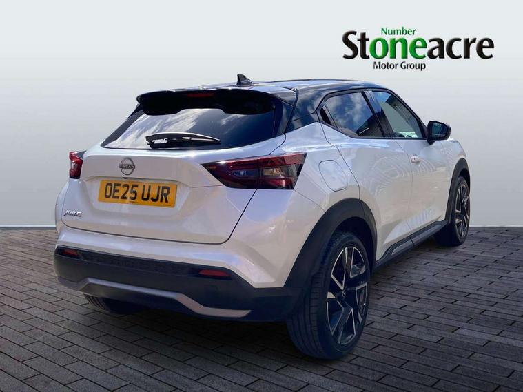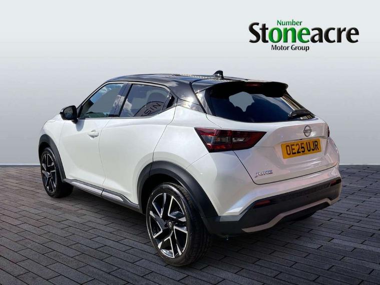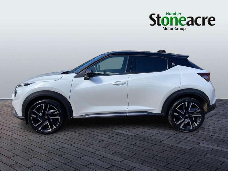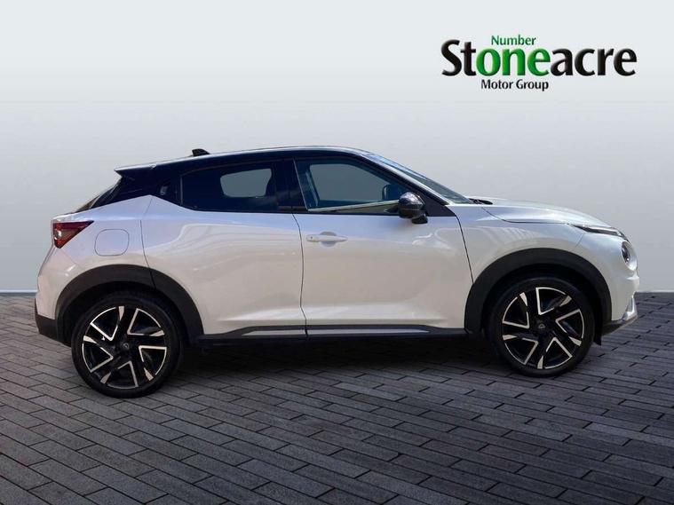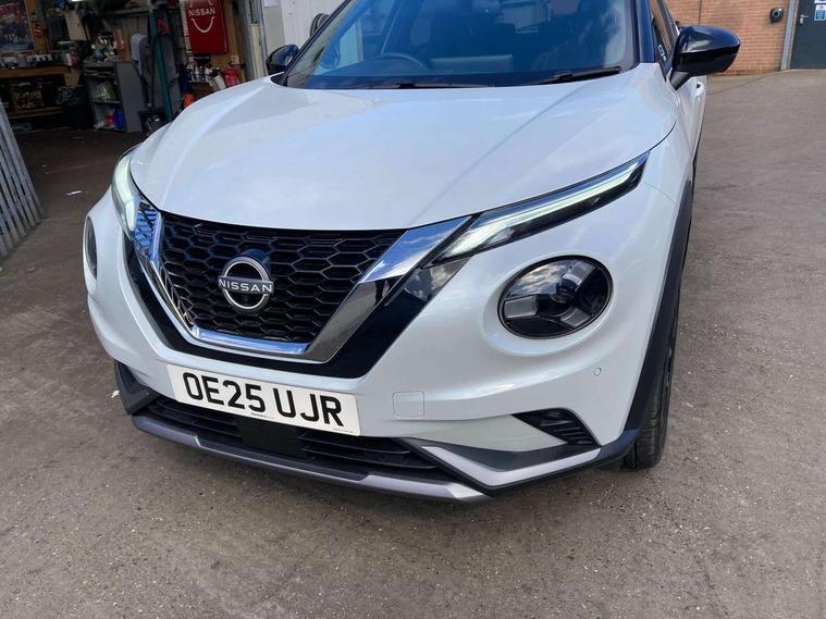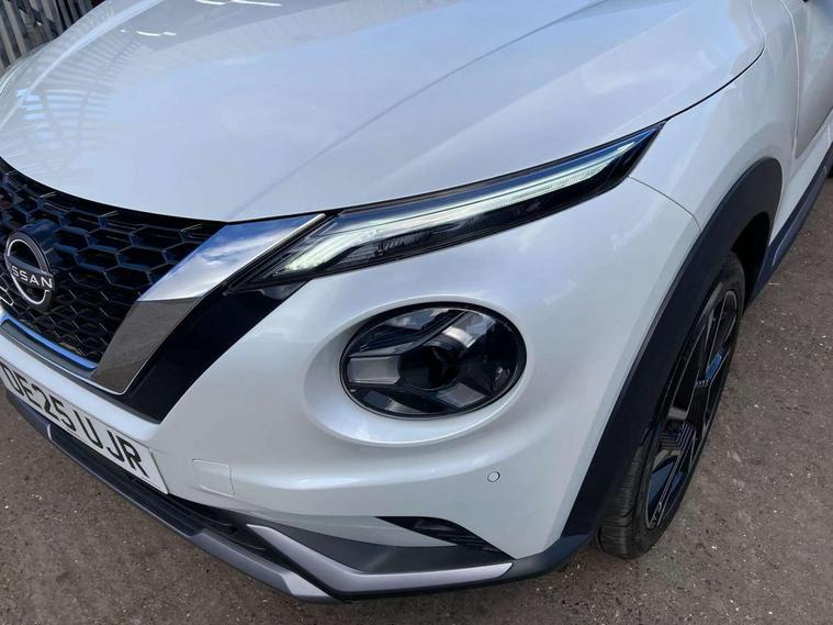 12.3" full colour TFT screen combimeter, Drive modes select (Eco, normal and sport), Emergency and breakdown call, Front parking sensor, Idle start/stop system, Intelligent driver alert system, Intelligent lane intervention, Lane departure warning system, Nissan connect 12.3" touch screen entertainment system, Nissan connect nav with TomTom traffic, Nissan connect services, Outside temperature sensor, Power Steering, Rear parking sensor, Stop/start button, Traffic sign recognition, Trip computer, Voice recognition, WiFi connectivity, Wireless Apple CarPlay and Google Android auto, Wireless Smartphone charger, 10 Bose speakers 6 speakers and 2 headrest speakers for driver/passenger seats, 2 X Rear console USB port, Bluetooth system, USB, Aux-in and 12V socket, Bose personal sound stage control, DAB Digital radio, Auto dimming frameless rear view mirror, Automatic hazard signal with emergency stop signal, Body colour door handles, Electrically adjustable door mirrors with integrated indicators, Follow me home headlights, Front and rear electric window with one touch driver window, Heated and auto folding door mirrors, High beam assist, LED 3rd brake light, LED daytime running lights, LED front fog lights, LED headlamps, LED rear fog lamp, LED rear lamps, One touch passenger window, Rain sensor windscreen wipers, Rear privacy glass, Rear side wing doors, Rear wiper, Roof spoiler, Shark fin roof antenna in solid Black, Three blink turn signal, 3 height adjustable rear headrests, 3 seat bench in 2nd row, 60/40 split folding rear seat, Automatic climate control, Card holder on driver sunvisor, Door ambient lighting, Driver seat back pocket, Driver side rear coat hanger, Driver/passenger sunvisors and vanity mirrors, Front and rear cabin lights, Front armrest, Front door pockets with bottle holders, Front head restraints, Front/rear passenger grab handles, Gear console ambient circle lighting, Height adjustable driver's seat, Internal chrome door handles, Leather gearshift knob, Luggage board, Luggage space lighting, Monoform sporty seats, Multifunction steering wheel, Passenger seat back pocket, Rear door bottle holders, Single front passenger seat, Smooth synthetic leather steering wheel, Synthetic leather kneepad, Telescopic steering wheel adjustment, Two cupholders in front centre console, Two rear isofix child seat anchorage points with top tether, Welcome light and console tray ambient lighting, Advanced safety shield pack - Juke Manual, Heat pack with height adjustable passenger seats - Juke, Interior personalisation pack - Juke, Satin grey exterior personalisation pack - Juke, ABS with EBD and brake assist, Active ride control, Active Trace Control, Driver and passenger airbags, Driver and passenger side airbags, Electric handbrake with auto hold function, Electronic Stability Programme (ESP), Front and rear curtain airbags, Height adjustable seatbelts, Hill start assist, Intelligent emergency braking with pedestrian and cyclist recognition, Rear door child safety locks, Seatbelt reminder for driver/front passenger and rear seats, Three 3 point rear seatbelts, Traction control, Tyre pressure monitoring system, VDC Dynamic Vehicle Control, Alarm, Immobiliser, Intelligent key and start push button with walk away lock and approach unlock functions, Remote central locking, 19" Alloy wheels with deep 3D effect, Tyre puncture repair kit,