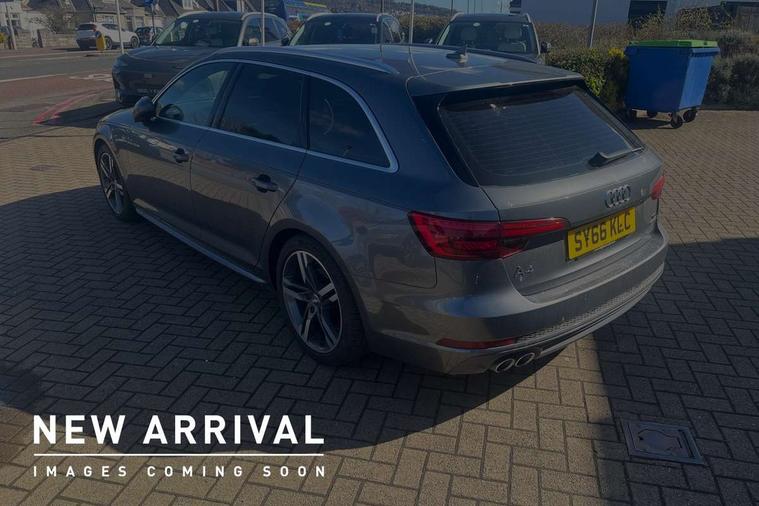 Audi drive select, Audi Pre sense collision avoidance, Audi smartphone interface, Electro-mechanical PAS, Power boot opening and closing, Service interval indicator, Stop/start button, Voice control system, 2 USB ports, Aux input, DAB digital radio module, MMI radio plus with CD player, Acoustic windscreen, Air inlets in titan black with two horizontal inlays in chrome, Auto dimming rear view mirror, Automatic headlights + automatic windscreen wipers, Body colour bumpers, Chrome door handles, Chrome rolled exhaust, Electric adjustable heated door mirrors, Electric front windows, Electric rear windows, Headlight range control, LED daytime running lights, LED indicators in door mirrors, Rear diffuser in Twilight grey matt, Rear wiper, Roof spoiler, 3 zone climate control, Black cloth headlining, Front centre armrest with 12v socket, Front sport seats, Front/rear floor mats, Gearshift paddles, Illuminated door sill finishers, Isofix child seat preparation for front passenger/outer rear seats inc passenger airbag deactivation, Jack and tool kit, Perforated leather gearknob, Reach + rake adjustable steering column, Rear headrests, Retractable load area cover, Split folding rear seats, Stainless steel foot rest, Stainless steel pedals, Sunvisors with vanity mirrors, Top tether anchor plate for isofix child seat, S line exterior styling pack - A4 Avant, 3 point seatbelts on all rear seats, ABS/EBD, Adaptive driver and front passenger airbags, Electromechanical parking brake, ESP, First aid kit, Front head airbags, Front seatbelt pretensioners + load limiters, Front side airbags, Seatbelt warning, Traction control, Tyre pressure monitoring system, Warning triangle, Keyless start, Locking wheel bolts, Remote central locking, Thatcham category 1 alarm + immobiliser, Space saver spare wheel,