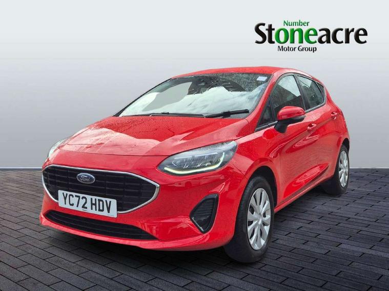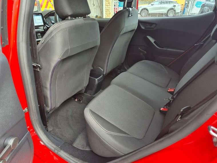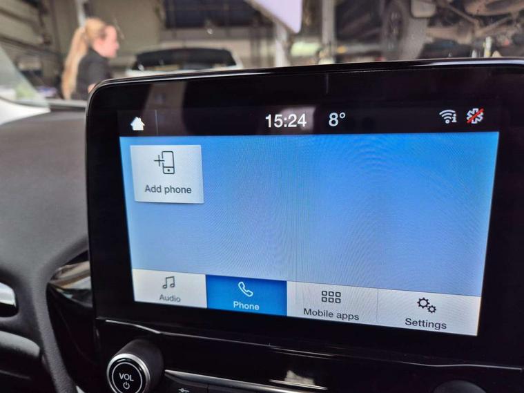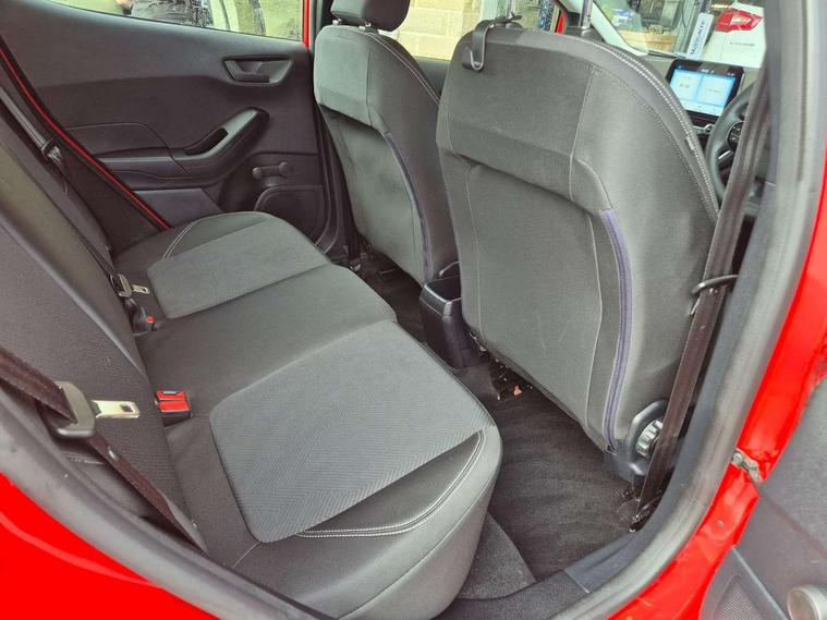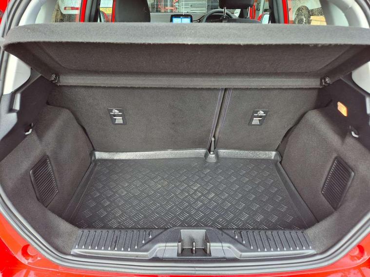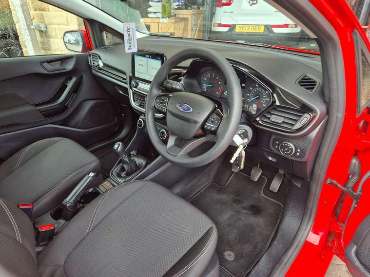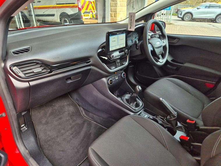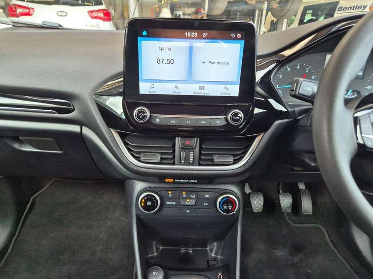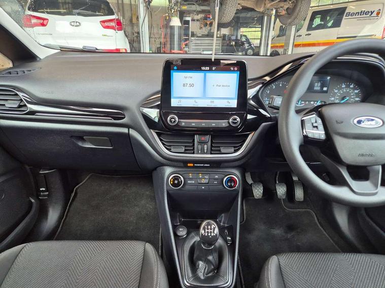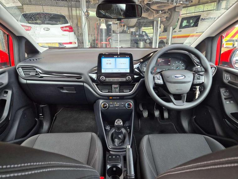 Bluetooth system, Electric power steering, Ford easy fuel, Trip computer, 2 USB ports, Auxiliary input socket, DAB Digital radio, Ford SYNC includes 8" touchscreen, 6 speakers, apple carplay, android auto and emergency assistance, Steering wheel mounted controls, Body colour bumpers, Body colour door handles, Body colour rear spoiler, Chrome beltline trim, Electric front windows/one touch facility, Electric rear windows, LED projector low beam headlamps with LED daytime running lights, Mesh design front grille with chrome surround, Quickclear heated windscreen, Rear wiper, 12V Accessory socket in centre console, 60/40 split folding rear seat, Adjustable head restraints, Ambient lighting, Boot carpet, Chrome inner door handles, Cloth upholstery, Footwell illumination, Front floor mats in velour, Front map reading lights, Front seat and rear pockets, Illuminated glovebox, Load area light, Luxury woven headliner, Manual 2 way passenger seat adjust, Manual 4-way driver seat adjust, Manual air conditioning, Overhead console with sunglasses holder, Pollen filter, Rake/reach adjustable steering wheel, NCAP Pack - Fiesta, 3 point seatbelts on all rear seats, ABS+EBA, Curtain airbags, Driver and passenger airbags, Drivers knee airbag, Electronic stability control with hill start assist, Front passenger airbag deactivation, Front side airbags, Tyre pressure monitoring system, MyKey system, Remote central locking & engine immobiliser, Thatcham Cat.1 alarm, 16" 8 spoke alloy wheels with rock metallic machined finish, Tyre repair kit,