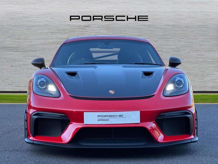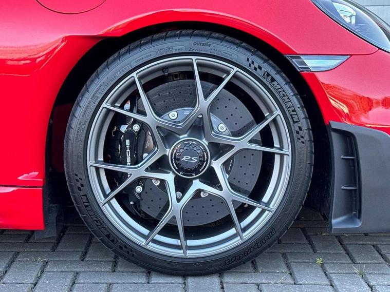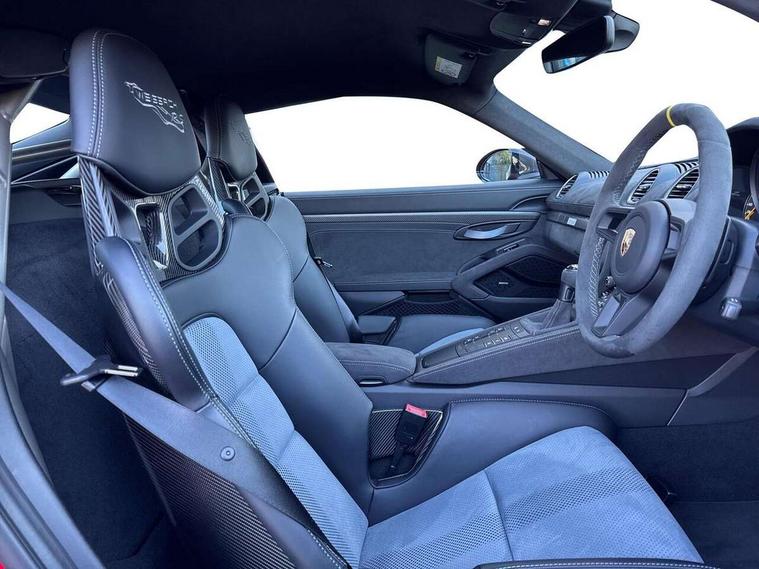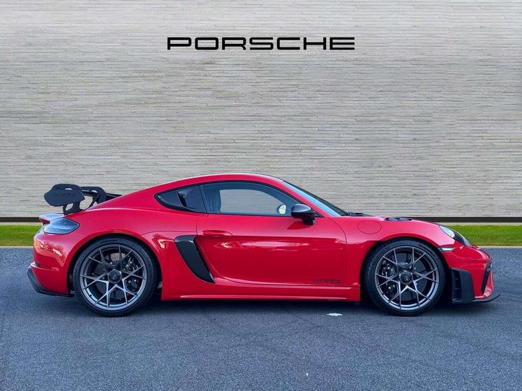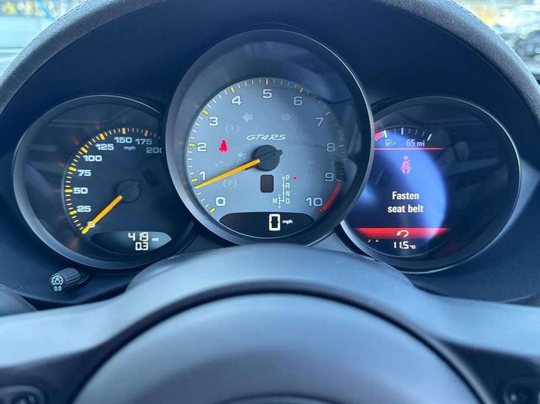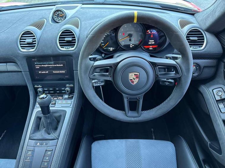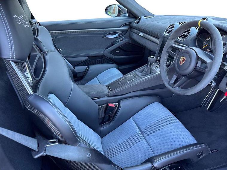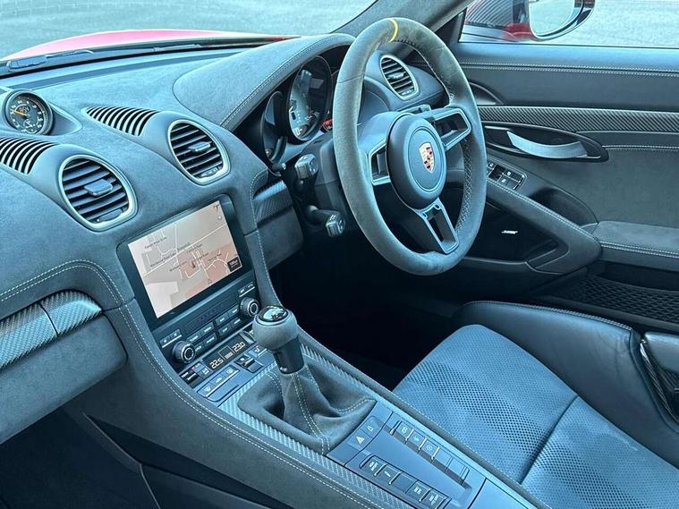 Auto start and stop system, Cruise control, Digital displays for vehicle speed, chosen gear, odometer, trip odometer and clock, eCall emergency call system, Electromechanical power steering with variable steering ratio and speed dependent steering assistance, Instrument cluster with central rev counter and high-resolution 4.6 inch colour display, Porsche track precision app, 64 litre fuel tank, Adjustable chassis for race track use (toe, camber, anti-roll bars), Adjustable race track chassis with RS specific spring rates and shock absorber tuning, Aluminium block and cylinder heads, Closed underbody panelling, Direct fuel injection (DFI), Dry sump lubrication with separate engine oil tank, Dynamic gearbox mount system, Electronically control damping system with 2 manual selectable Normal and Sport modes, Forged titanium connecting rods, Gasoline particulate filter, Oil supply with fully variable pressure oil pump, 7 suction stages, oil centrifuge and additional oil supply via crankshaft, Porsche Active Suspension Management (PASM) sport suspension with lowered 30mm ride height, Porsche Doppelkupplung (PDK) - 7 speed dual clutch transmission with manual control by steering wheel gearshift paddles and GT specific gear selector, Porsche stability management (PSM) including ABS with two switchable stages (ESC OFF and ESC+TC OFF), Porsche TORQUE Vectoring (PTV) with mechanical rear differential lock, Rear wheel drive, Two seater vehicle with mid mounted engine, Two three-way catalytic converters and on-board diagnostics for monitoring emission control system and coated particulate filter, Variable intake manifold with two switchable resonance valves, VarioCam Plus variable valve timing and switchable valve lift, Water cooled with thermal management, DAB Digital radio, Integrated 4G/LTE compatible SIM including data for the Porsche Connect Services, Integrated compatible SIM including Porsche Connect Services, Navigation incl porsche + Apple Carplay, connect module, wireless internet access, carfinder, remote vehicle status, remote service and vehicle track, USB interface in central storage compartment, Wifi and music streaming, Automatic headlight activation including welcome home lighting, Black side window trim, Body colour bumpers, Bonnet made of carbon fibre reinforced plastic (CFRP) in exterior colour with black NACA air inlets for brake cooling, Centre wheel bolts in black including wheel hub cover with RS logo in silver, Electrically adjustable heated exterior mirrors on door waist rails, aspherical on driver's side, Exclusive design fuel filler cap, Fixed rear spoiler, Flow optimized stainless steel lightweight sports exhaust system with 2 tailpipes made of stainless steel in high gloss black, Front apron with large cooling intakes with grilles and spoiler lip with recessed GT4 RS logo in black and central air outlet, Front wheel arches made of carbon fibre reinforced plastic (CFRP) in exterior colour including wheel arch ventilation in black, Green tinted heat insulating glass, Grey top tinted windscreen, Heated rear windscreen, Intelligent lightweight body in Aluminium/Steel composite construction, LED 3rd brake light, LED tinted taillights and integral 4-point brake lights and reversing lights, Porsche logo in accent trim on rear apron painted in satin black, Power windows with one touch operation and door seal protection, Rain sensor, Rear apron lower part in black with diffuser including fins, Rear boot, Separate tinted auxiliary lights in the front end with LED indicators and position lights, Side air intakes with one grille, sideblades including GT4 RS logo in black synthetic, Variable intake system with two switchable resonance flaps and six individual throttle valves, Wide opening rear hatch with rear screen made of lightweight glass, Windscreen washer system with aero wiper blades and washer jets, 12V sockets in passenger footwell, Adjustable fan with air recirculation and defroster functions, Airbox cover with GT4 RS logo in silver and black, Ascending centre console with uncovered storage compartment and closed storage compartment, Footwell illumination, Front and rear luggage compartments, Front headrests, Heated seats, LED reading lights, orientation, ignition lock, additionally luggage compartment and glove compartment lighting, Lightweight door panels with storage net in black and opening loops in arctic grey, Lockable glovebox, PDK gear changer lever with manual alley, grip area and shiift gaiter in Race tex, shift pattern in racing yellow, Race-Tex roof lining and A pillar trims, RS sport steering wheel, Single front passenger seat, Sports look pedal and footrest with stainless steel surround in matt brushed, Storage compartments in each doors, Two individual cup holders (Passenger side, integrated into dashboard trim strip), Two zone automatic climate control, Carbon interior pack in satin finish - Cayman, Interior pack with items in leather and Race-tex - Cayman, ASR, Electrically controlled parking brake, Front seatbelt pretensioners + load limiters, Full size driver and passenger airbags, Lightweight spring strut axle front/rear, McPherson front axle + lightweight springs incl helper, anti-roll bar, all suspension mountings ball jointed, Passenger airbag deactivate switch, Porsche side impact protection doors with thorax airbag in outer backrest side bolster and head airbag for driver/passenger in door panel, Tyre pressure monitoring system (TPM) with track mode, Alarm system with interior surveillance, Dashcam preparation, Engine immobiliser with in key transponder, central locking and remote control, Tyre repair kit,