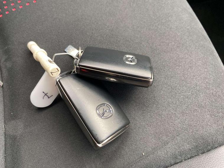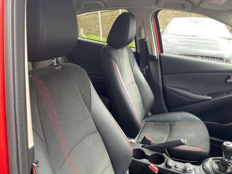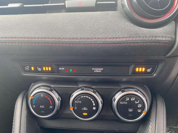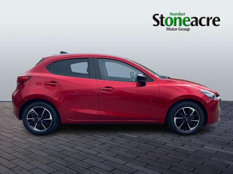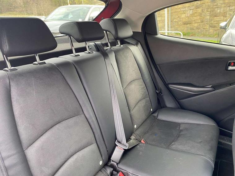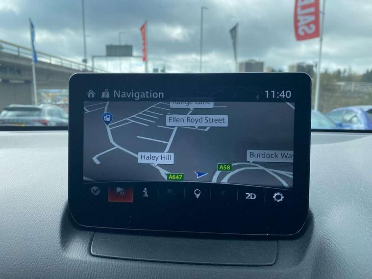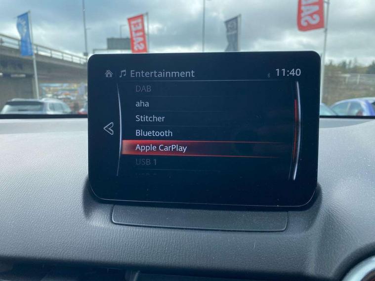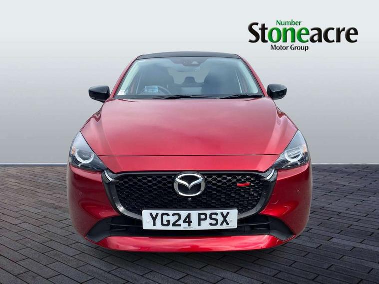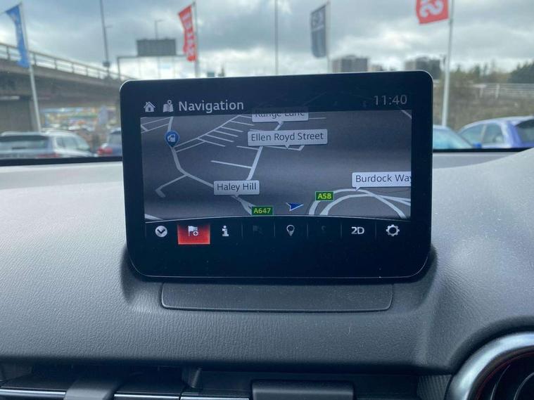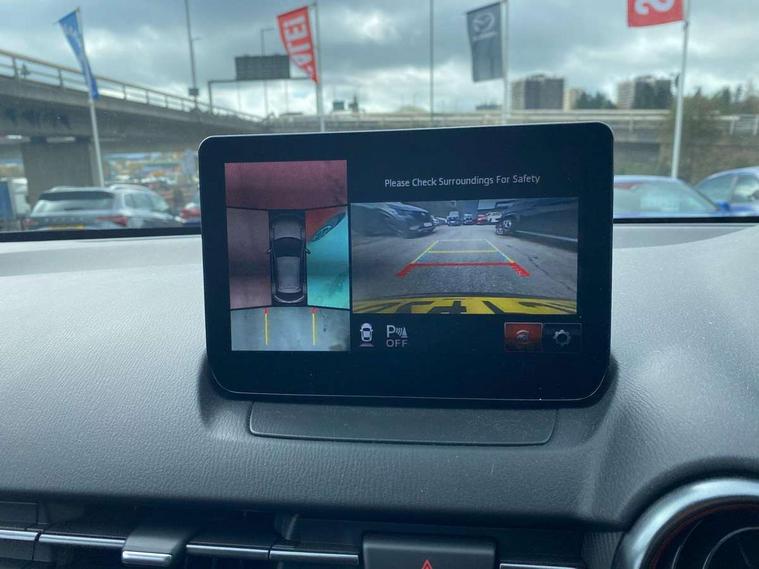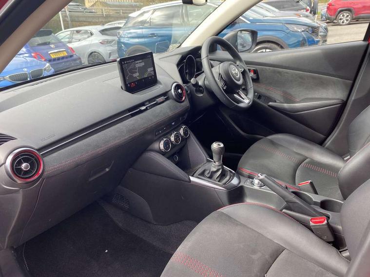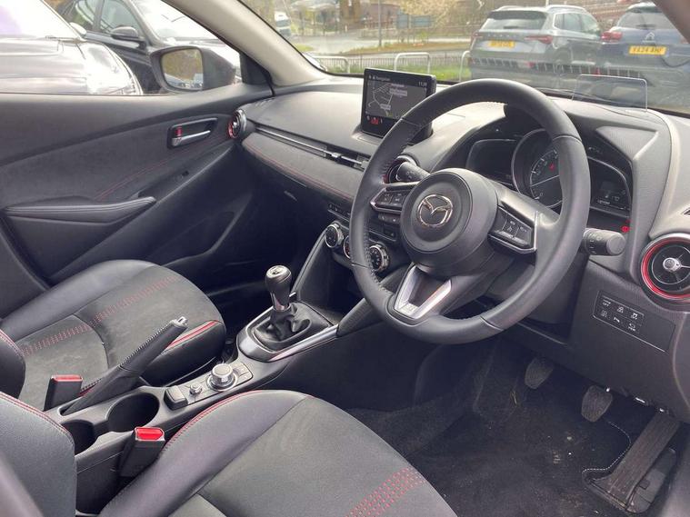 Adjustable speed limiter, Analogue rev counter, Cruise control, Digital instrument cluster, Digital speed display meter, E-call, Emergency stop signalling system, Engine start/stop button, Integrated bluetooth, Lane departure warning system, Lane keep assist, Mazda connect with 8" colour touch screen, Navigation system, PAS, Service indicator, Tailgate, Trip computer, Wireless Apple CarPlay and wired Android Auto, i-stop, Mazda M hybrid, AM/FM/DAB radio with 6 speakers with USB and AUX inputs, Multimedia Commander including separate volume dial, Steering wheel mounted audio/bluetooth controls, Auto dimming rear view mirror, Auto headlight levelling, Black carbon effect roof, Black door mirrors, Black Shark-fin antenna, Body coloured front bumper with black lower bezel, Body coloured rear bumper with black lower mouldings and red accent, Chrome exhaust tailpipes, Coming/leaving home lighting function, Dusk sensing headlights, Electric adjustable/heated/folding door mirrors, Electric front/rear windows with one touch auto up/down for driver's window, Front honeycomb grill with red accent, Gloss black finish signature wing, Heated rear window, LED indicator lights, LED third brake light, Privacy glass, Rain sensing front wipers with adjustable sensitivity and speed, Rear side wing doors, Rear wiper, Signature LED daytime running lights, 3 seat bench in 2nd row, 60/40 split rear seats, Black/red air vent accents, Climate control air conditioning, Driver, Front passenger and two rear grab handles with coathooks, Drivers seat manual slide recline and height adjustment, Drivers/front passengers covered vanity mirrors and drivers ticket holder, Front centre storage with two cupholders, Front head restraints, Front passenger and driver door pockets, Front passenger seat manual slide, recline and height adjust, Front passenger seatback pockets, Gear shift indicator, Glovebox, Heated front seats with 3 stage setting, Heated leather steering wheel, Interior courtesy light with integrated spotlight, ISOFIX child seat anchorage points attached on outer rear seats, Leather gear knob, Leather handbrake, Leather/Cloth upholstery, Luggage compartment light, Single front passenger seat, Three height adjustable rear head restraints, Tilt/telescopic adjustable steering wheel, Driver Assistance pack - Mazda 2, 2x3 point front seatbelts with pre-tensioners, 3 point seatbelts on all rear seats, Anti-lock braking system (ABS), Collision mitigation braking system, Dynamic stability control + Traction control, ESP, Front and rear curtain airbags, Front driver, passenger and rear seat seatbelt warning, Front dual stage driver and single stage front passenger airbags, Front side airbags, Front smart city brake support, G-Vectoring control plus, Hill launch assist, Manual child lock in rear doors, Passenger airbag cut-off switch, Tyre pressure monitoring system, Deadlocking system, Power door locks, Remote central locking, Smart keyless entry, Thatcham accredited alarm and immobiliser, Black soft touch dashboard panel with red stitching colour coordination, 16" Black metallic machined alloy wheels, Emergency tyre repair kit,