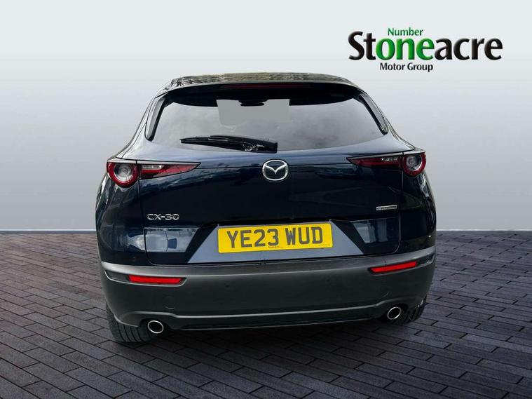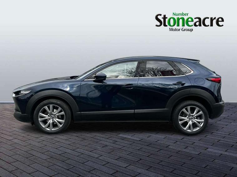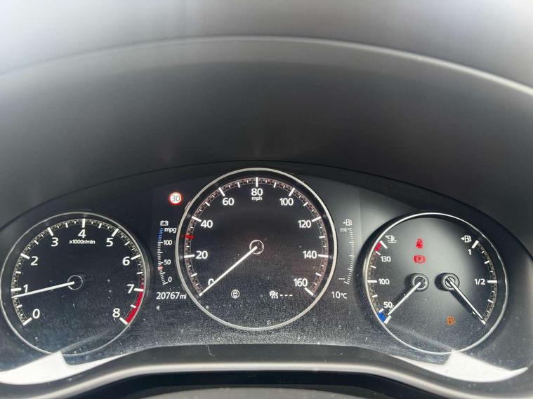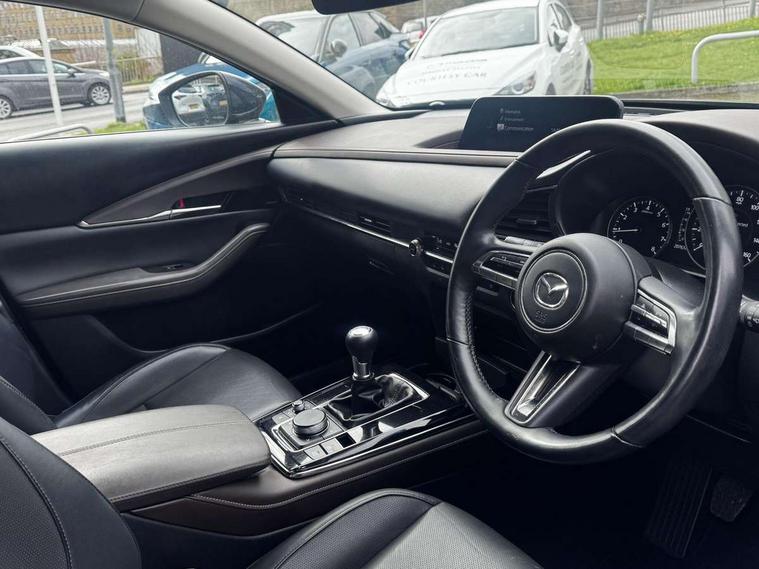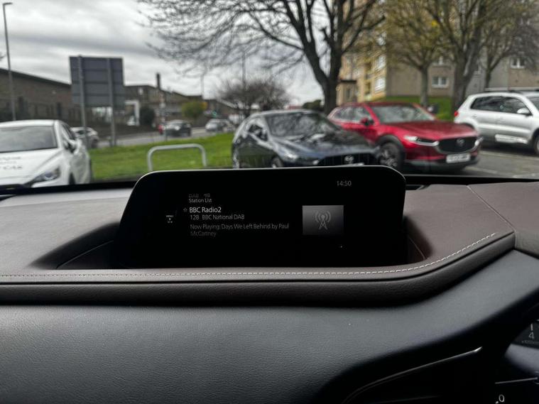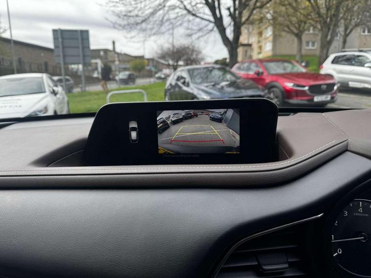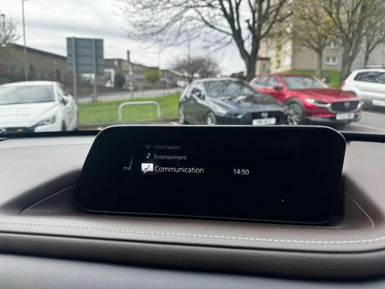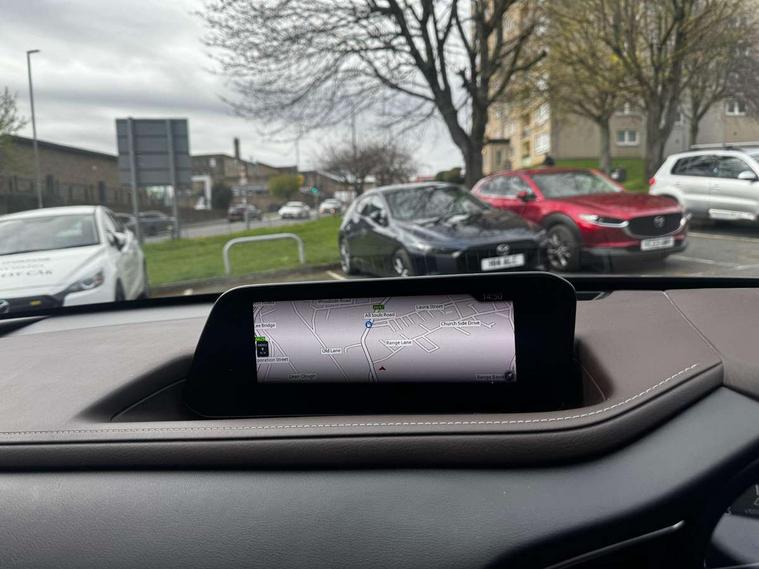 7" TFT Colour driver instrument panel display, 8.8" Colour centre touch screen display with Mazda Connect infotainment, Adaptive cruise control (Mazda radar cruise control), Apple car play/Android Auto, Blind spot monitoring with rear cross traffic alert, Driver attention alert system, E-call with GPS, Emergency stop signalling system, Engine start/stop button, Front and rear parking sensors, Integrated bluetooth, Integrated Mazda navigation system, Intelligent speed assist, Lane keep assist system (LAS) with Lane departure warning system (LDWS), Mazda connected services, PAS, Power lift gate, Reversing camera, Service indicator, Tailgate, Traffic sign recognition, Trip computer, Windscreen projected colour active driving display (HUD), Cylinder Deactivation, i-stop, 2 USB charging ports in front inner central armrest, AM/FM and DAB radio, Bose surround sound system with 12 Speaker, Bose center point, Bass match and audio pilot technology, Multimedia Commander including separate volume dial, Steering wheel mounted audio/bluetooth controls, Auto dimming driver's door mirror, Auto headlight levelling, B-pillar and C-pillar garnishes in piano black finish, Body coloured, electrically adjustable, heated auto power folding door mirrors with integrated indicators, Chrome finish signature wing in front grille, Coming/leaving home lighting function, Door mirrors with adjustable memory and tilt-down function when reversing, Dual chrome exhaust, Dusk sensing headlights, Electric front/rear windows with one touch auto up/down, Frameless auto dimming interior rear view mirror, Front kodo turn signal, Gloss black front grille, Gloss black rear roof spoiler, High beam assist, LED Headlights, LED signature daytime running lights, Privacy glass (rear side windows and rear screen), Rain sensing front wipers with adjustable speed and intermittent wipe, Rear fog lights, Rear side wing doors, Rear wiper, Signature LED rear combination lights, Third brake light, 12V power outlet in centre console, 3 seat bench in 2nd row, 60/40 split fold down rear seats, Chrome horn pad ring, Chrome interior trim accents with steering wheel centre bezel, surround of engine start / stop button and glove box handle, Dashboard, door cards and front centre armrest in rich brown leather, Driver and front passenger visors with covered vanity mirror and driver ticket holder, Driver's seat, power tilt, slide, recline, height and lumbar adjustment, Driver, front passenger and two rear door storage, Driver, Front passenger and two rear grab handles with coathooks, Dual zone climate control air conditioning with rear air vents, Folding rear centre armrest with two cup holders, Front and rear (x3) head restraints, Front and rear LED lighting, Front armrest, Front centre storage with two cupholders with lid, Front passenger seatback pockets, Front passengers seat manual slide, recline and height adjustment, Gear shift indicator, Glovebox illumination, Heated front seats with 3 stage setting, Heated steering wheel, ISOFIX child seat anchorage points attached on outer rear seats, Leather upholstery with interior accents, Leather wrapped gear shift knob, Leather wrapped steering wheel with telescopic and tilt adjustment, LED luggage compartment lighting, Light roof headlining and pillars, Rear armrest inner material in cloth, Roof mounted sunglasses holder, Single front passenger seat, 3 point ELR front seat belts x2 with pretensioners, 3 point ELR rear seat belts, Anti-lock braking system (ABS), Drivers knee airbag, DSC - Dynamic Stability Control, Electronic parking brake with auto disengage function and auto hold function, Front and rear curtain airbags, Front dual stage driver and single stage front passenger airbags, Front passenger airbag cut-off switch, Front side airbags, Front smart city brake support, G-Vectoring control plus, Hill launch assist, Manual child lock in rear doors, Mild Hybrid system with regenerative braking, Seatbelt reminder for driver/front passenger and rear seats, Traction control system (TCS), Tyre pressure monitoring system (TPMS), Remote central locking with deadlocking and automatic door lock when driving, Smart keyless entry, Thatcham accredited alarm and immobiliser, Dark vinyl door panel inserts, 18" Silver alloy wheels, Emergency tyre repair kit,