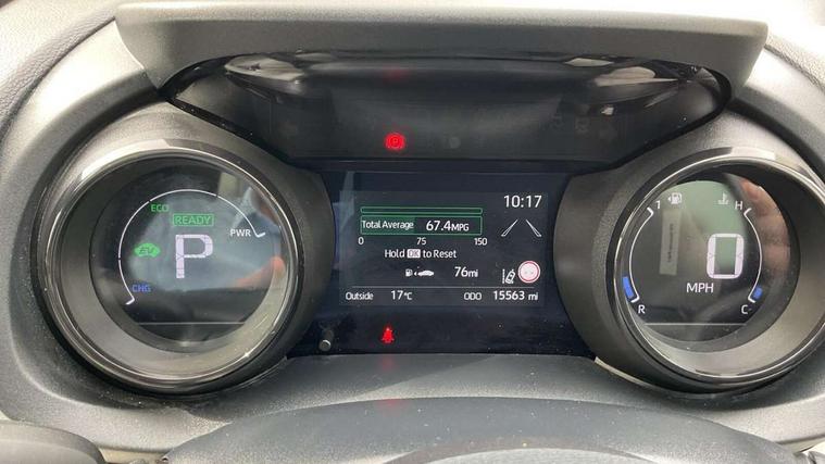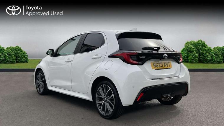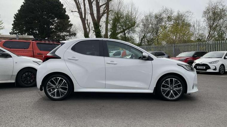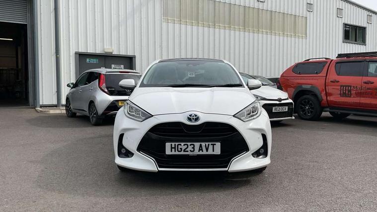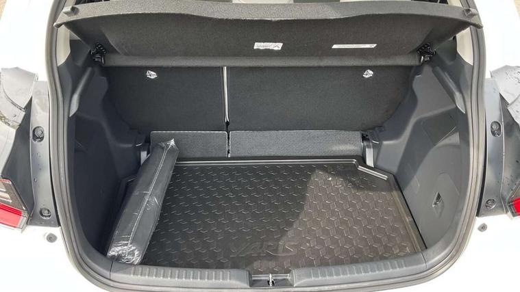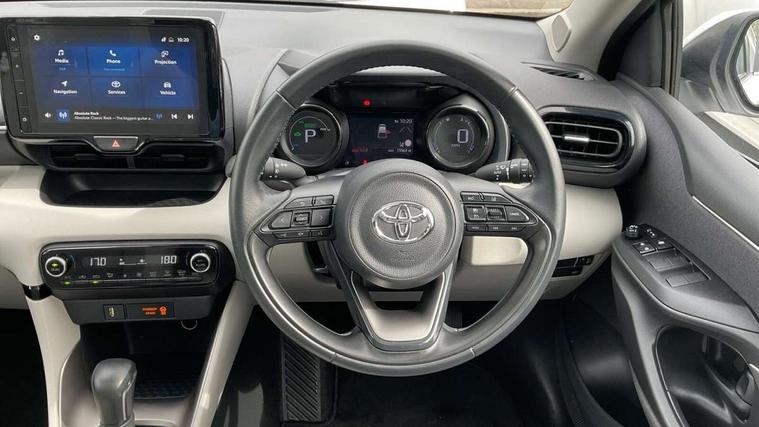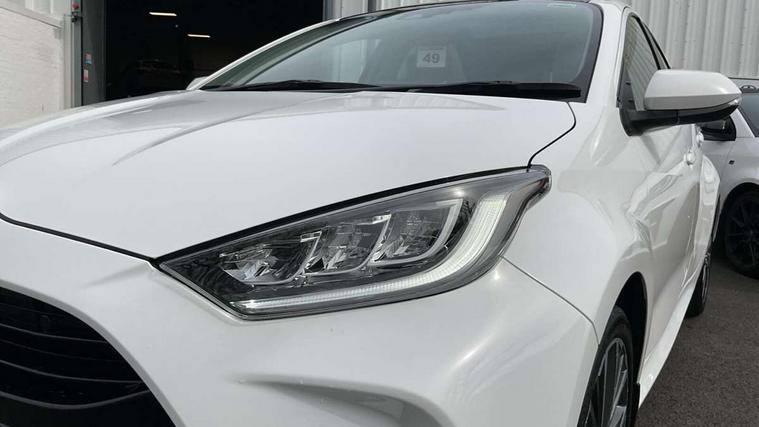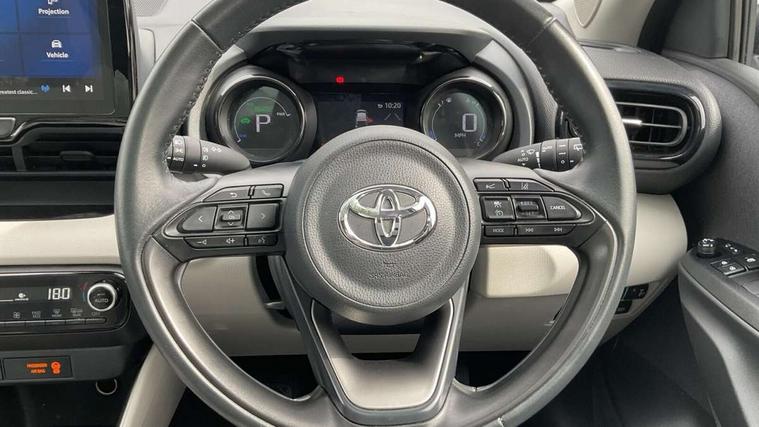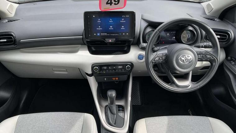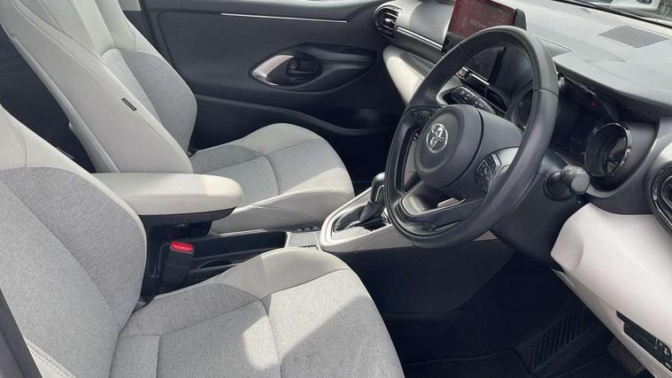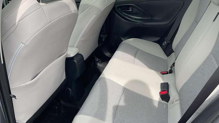 Adaptive cruise control, Adjustable speed limit with speed warning, Blind spot monitoring, Bluetooth connectivity, Colour binocular inspired displays with digital speedometer, E-call, Electric power steering, Hybrid energy display, Multi information display switches on steering wheel, Reversing camera, Smartphone integration with Apple CarPlay and Android auto, Tailgate, Touch 2 navigation system, Voice recognition, Vehicle Stability Control (VSC), 6 speakers, 9" HD multimedia display touch screen with Toyota smart connect, USB connection, Acoustic windscreen glass, Auto windscreen wipers, Automatic headlights, Automatically retractable door mirrors, Body coloured door mirrors, Electric adjustable heated door mirrors, Follow me home headlights, Front auto power windows with anti jam protection, Full LED rear lights, LED daytime running lights, LED front fog lights, LED front light guide, LED Headlights, LED High mounted stop lamp, LED Indicators, LED rear light guide, Manual headlight levelling, Painted chequered front grille, Rain sensor, Rear auto power windows with anti jam protection, Rear privacy glass, Rear side wing doors, Rear spoiler, Rear wiper, Satin lower front grille, Shark fin antenna, Turning signal integrated indicators in door mirrors, Variable front intermittent wipers, 3 adjustable rear headrests, 3 seat bench in 2nd row, 3 spoke leather steering wheel, 60/40 split folding rear seat, Active headrests, Adjustable boot height, Coat hooks in rear grab handles, Cup holders (2 front & door), Data Communication Module (DCM) connected services, Dual zone automatic air conditioning, Fabric seat with partial synthetic leather upholstery, Front armrest, Front sport seats, Glovebox, Grey roof lining, Height adjustable driver's seat, Height adjustable passenger seat, Isofix seat fixing, Leather gearshift, Map pockets on the backs of the front seats, Pollen filter, Shopping bag hooks, Single front passenger seat, Tilt/telescopic steering column, Parking pack - Yaris, 3 point seatbelts on all rear seats, ABS+EBD+Brake assist, Electronic parking brake, Emergency brake light system (EBS), Front passenger airbag on/off switch, Front seatbelt reminder, Hill start assist control (HAC), Rear child proof door locks, Rear seat belt reminder, Supplemental Restraint System (SRS) 8 airbags: Driver & passenger's airbags, dual side curtain airbags, side impact airbags, front centre airbag, Toyota Safety Sense 2, Precollison + Night time Pedestrian & Cyclist Detection, Lane Trace Assist, Auto High Beam, Intelligent ACC & Road Sign Assist, Tyre pressure warning system, 2x Master key, Alarm/immobiliser, Keyless smart entry with push button start, Remote AC via MyT, Remote locking via MyT, Remote powered central double locking doors, Satin chrome interior styling, Soft touch instrument panel, Space saver spare wheel,
