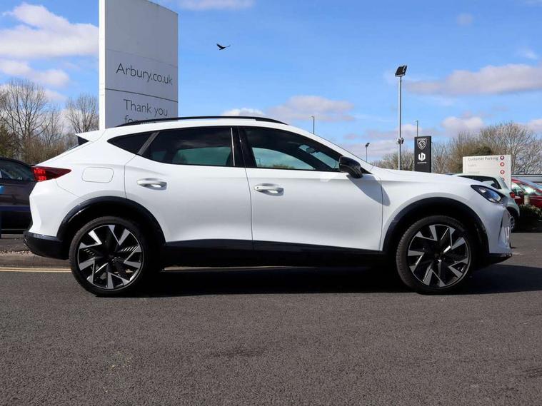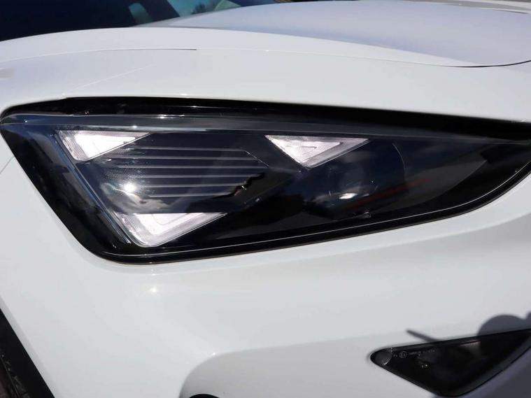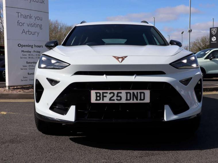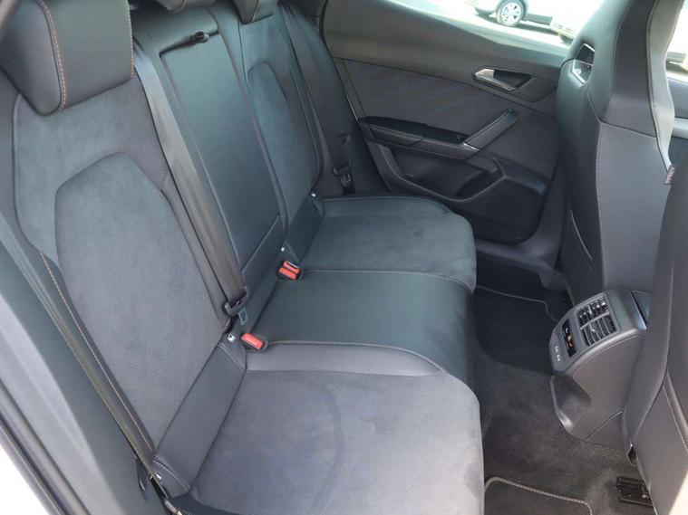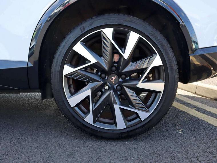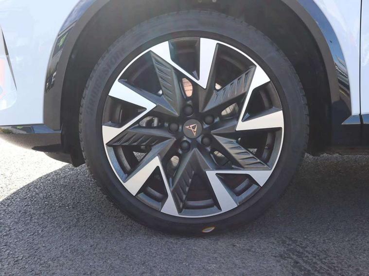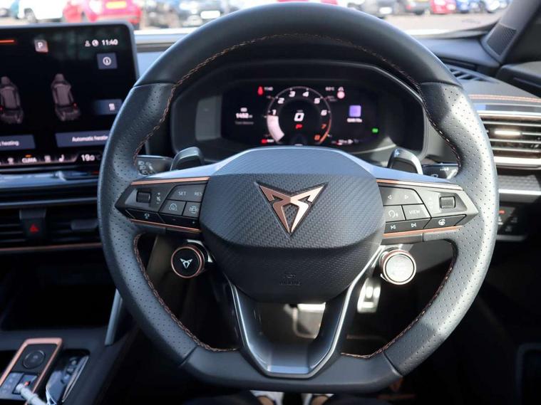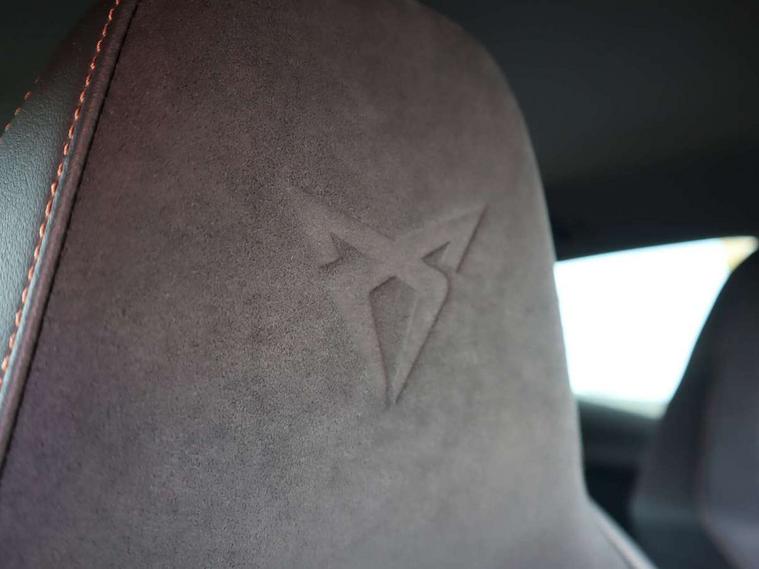10.25" digital cockpit and configurable dashboard, Adaptive cruise control with follow-to-stop and speed limiter, Advanced driver alert system, Driving profile selection, Dynamic road sign display, Emergency steering support with turn assist, Forward collision warning with automatic braking, Front and rear parking sensors, Full link phone integration, Lane assist, Progressive steering, Rear view camera, RPM, trip computer, outside temp gauge, instrument light brightness, low fuel warning light, lights on reminder, gearshift indicator, Service interval indicator, Start/stop system with regenerative braking, Virtual pedal and electric tailgate, Voice control system, Wired Android Auto, Wireless apple carplay, Wireless phone charger, CUPRA sport suspension, Electronic locking differential and dynamic traction support, 2 front and 2 rear USB type C sockets, Media system with navigation, 12.9" touchscreen display, voice control, DAB, steering wheel mounted controls, Auto dimming rear view mirror, Body colour door handles, Body coloured bumpers, Dark grey wing mirror, Daytime running light with automatic headlight control and coming home feature, Door panel ambient lighting, Dynamic headlight range control, Electric front/rear windows, Electrically adjustable heated and folding door mirrors with memory function, Gloss black roof rails and window surrounds, High beam assist, LED 3rd brake light, LED front fog lamps with cornering function, LED Headlights, LED Taillights with dynamic indicator, Rain sensing wipers, Rear diffuser with black simulated exhaust pipes, Rear fog lights, Rear side wing doors, Rear wash/wipe, Tinted rear windows, Welcome lights (within exterior mirror housing), 12V socket, 2 front and 2 rear reading lights, 3 seat bench in 2nd row, 60/40 split rear bench seat with armrest and mechanical seat release, Black headlining, Black interior roof lining, Cupra sports pedals, Dust/pollen filter, Electrically adjustable driver's seat with memory and lumbar support, Front and rear head restraints, Front centre armrest, Heated front seats, Heated supersports multifunction leather steering wheel with satellite buttons and gear shift paddles, Height/reach adjust steering wheel, Illuminated aluminium doorsteps, Illuminated interior front door sills, Illuminated sunvisor with mirror, Isofix, Leather dashboard, door insert and side trim panel, LED smart wraparound lighting, PVC/Dinamica microfiber upholstery + bucket seats, Satellite steering wheel, Single front passenger seat, Storage pockets on rear of front seats, Three zone climate control with control panel in rear, Variable luggage/load compartment floor, 3 point seatbelts on all rear seats, ABS, Brake control system - ESC and brake booster, Child proof door locks, Driver and front passenger airbags with front passenger airbag de-activation, Electronic parking brake, Front and rear disc brakes, Front side curtain airbags, Hill hold control, Public e-call, Seat belt reminder for front and rear seats, Tyre pressure monitoring system, Anti theft alarm system, KESSY Advanced - Keyless start, keyless entry with SAFELOCK, Locking wheel bolts, Copper and aluminium interior detailing, 19" Sandstorm machined sport black and silver alloy wheels,