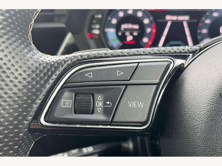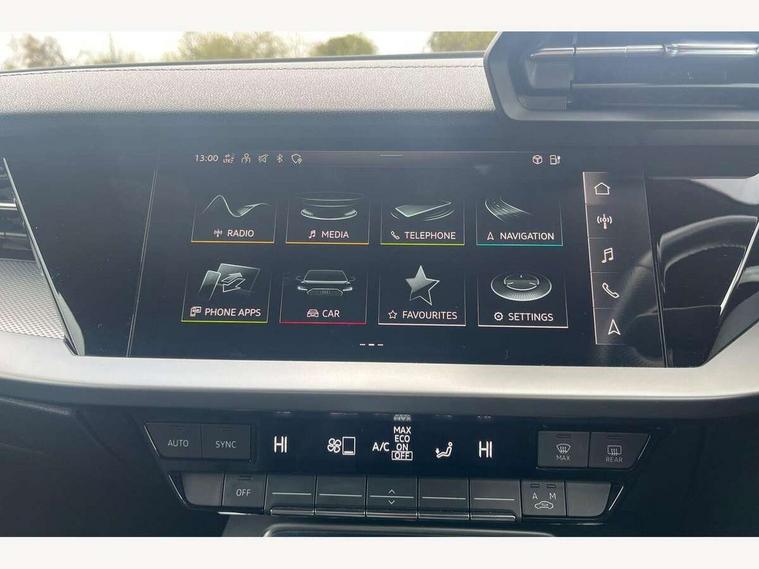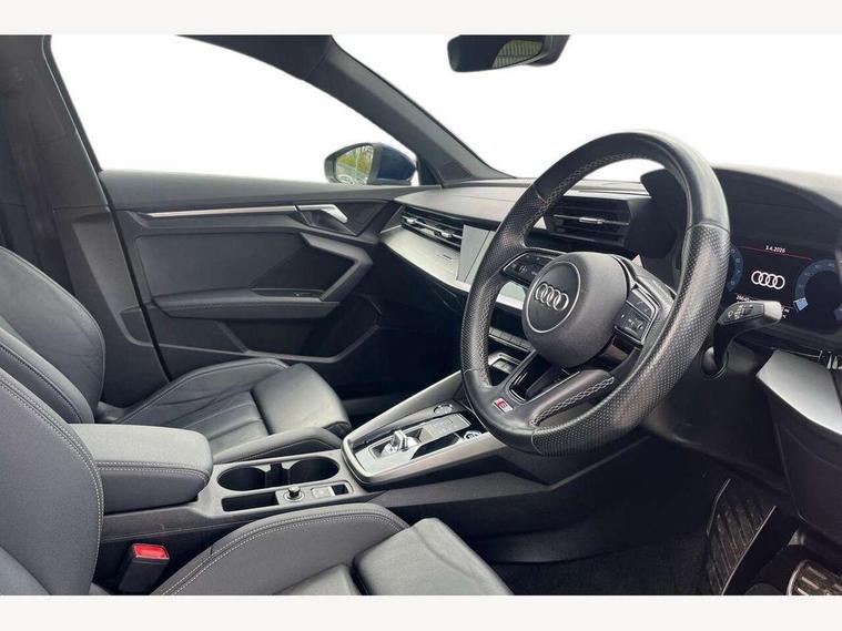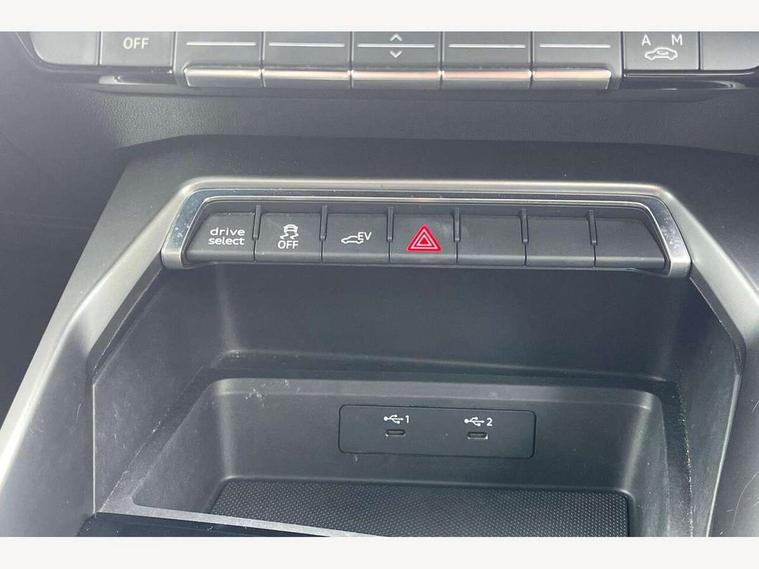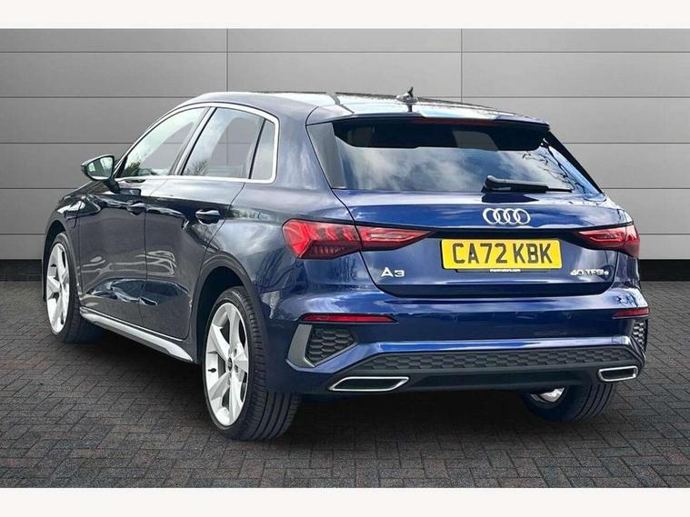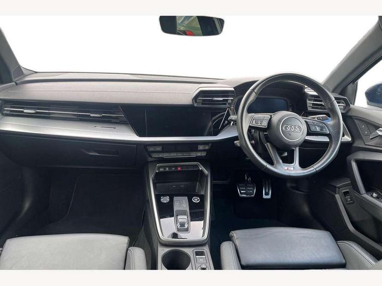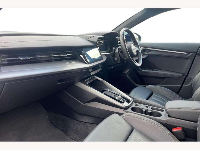 Audi drive select (Auto, Comfort, Dynamic, Efficiency and Individual), Audi smartphone interface, Audi Virtual Cockpit - 10.25" digital and colour instrument cluster, Automatic start/stop system with recuperation, Bluetooth interface, Collision avoidance assistant, e-Call (emergency call), Electromechanical power speed sensitive steering, Lane departure warning system, MMI Navigation Plus with high resolution 10.1" colour touch screen display, Service indicator, Trip computer, Voice control system with natural language interaction, 3 pin 10 amp domestic charging cable, 3.6 kw On-board charger, Standard suspension, Type 2 mode 3 32 amp charging cable, Type 2 socket for AC charging, 2xUSB-C connection with data and charging functions, 6 passive loudspeakers, DAB Digital radio, 3rd brake light, Acoustic glass windscreen, Aluminium window trim, Auto dimming frameless rear view mirror, Electrically adjustable/heated/folding/auto dimming door mirrors with integrated LED indications + kerb view function for passenger side, Front electric windows, Illuminated aluminium inserts front door sills with S logo, LED daytime running lights, LED headlights with LED rear lights and dynamic rear indicators, Light and rain sensors, Privacy glass - dark tinted rear window, rear door and side windows, Rear electric windows, Rear side air outlets in grained matt black, Rear side wing doors, Rear wiper, S line bumpers, S roof spoiler, 12V socket and storage compartment in front centre console, 3 seat bench in 2nd row, 40/20/40 split folding rear seat bench with cupholder, Black cloth headlining, Dual zone electronic climate control, Front and rear centre armrest in leather, Front and rear headrests, Front/rear floor mats, Height and reach adjustable steering wheel, Illuminated vanity mirror, Interior lighting - glove compartment light and right hand side, Luggage compartment floor covering, Manual boot compartment lid, Manually adjustable front seats, Seat side bolsters, Single front passenger seat, Stainless steel pedals and front footrest in black, Twin leather upholstery with front sports seats S embossed logo, Aluminium interior elements pack - A3 Sportback, LED interior lighting pack - A3 Sportback, S line styling pack - A3 Sportback, 3x3 point rear seat belts, Audi pre sense front, Driver and front passenger airbag with passenger airbag deactivation, Electronic Stabilisation Control (ESC) including ABS, ASR and EDL, First aid kit with warning triangle and 2 safety vests, Front side airbags with head airbags and interaction airbag, Pre-sense front with pedestrian and cyclist detection, Seatbelt monitoring, Tyre pressure loss indicator, Anti theft alarm, Anti-theft wheel bolts, Electronically operated child lock, Immobiliser, Remote control central locking, Accent surfaces in the dashboard and centre console in platinum grey silk effect paint finish, Dark spectrum aluminium inlays, Tool kit, Tyre repair kit,