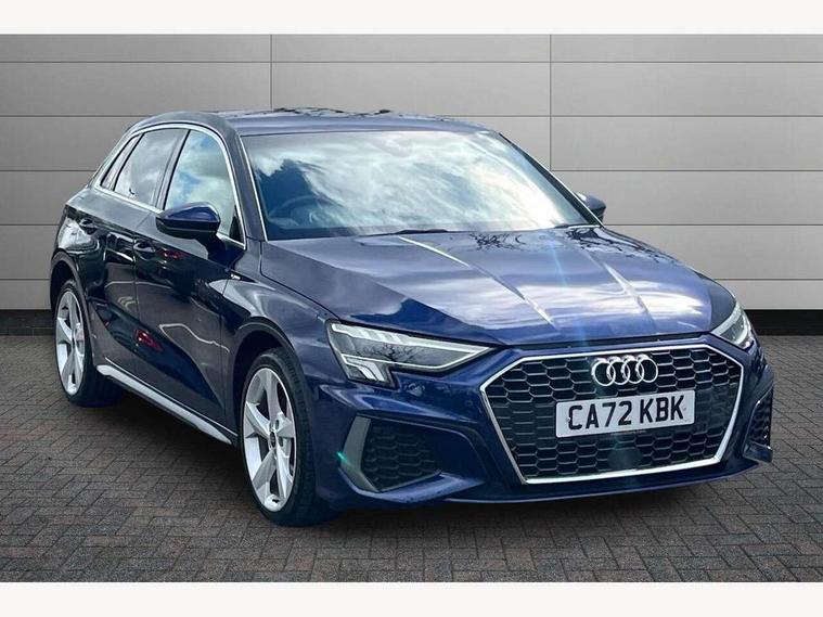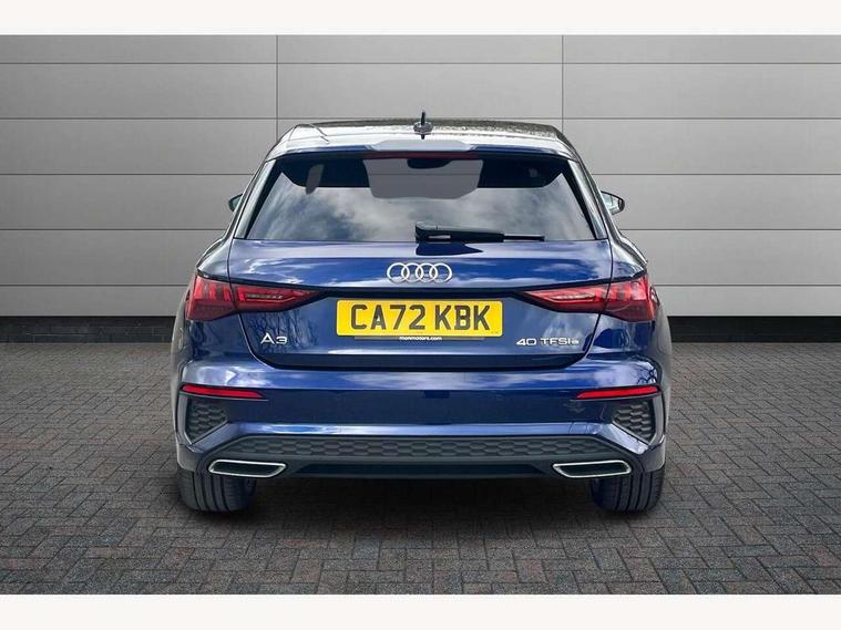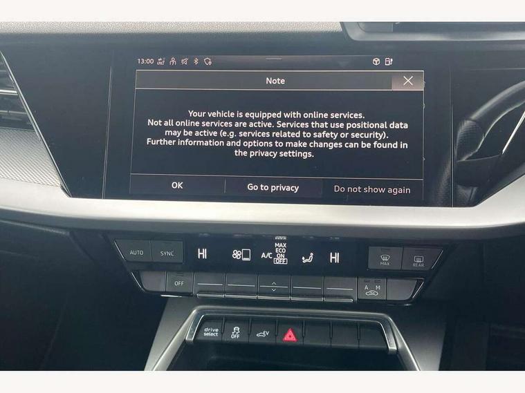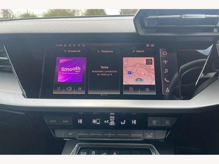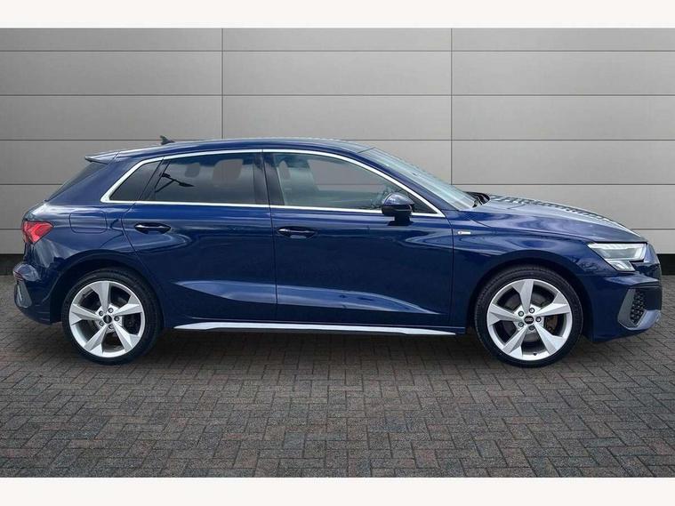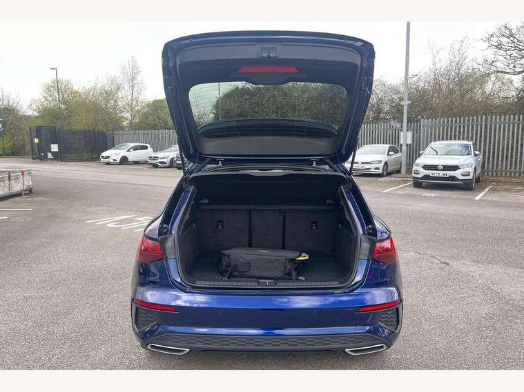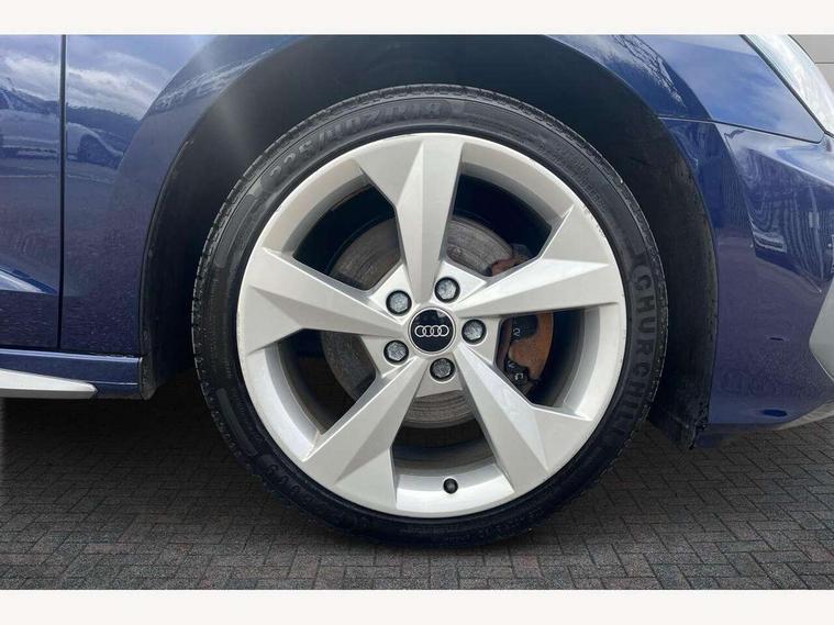 Audi drive select (Auto, Comfort, Dynamic, Efficiency and Individual), Audi smartphone interface, Audi Virtual Cockpit - 10.25" digital and colour instrument cluster, Automatic start/stop system with recuperation, Bluetooth interface, Collision avoidance assistant, e-Call (emergency call), Electromechanical power speed sensitive steering, Lane departure warning system, MMI Navigation Plus with high resolution 10.1" colour touch screen display, Service indicator, Trip computer, Voice control system with natural language interaction, 3 pin 10 amp domestic charging cable, 3.6 kw On-board charger, Standard suspension, Type 2 mode 3 32 amp charging cable, Type 2 socket for AC charging, 2xUSB-C connection with data and charging functions, 6 passive loudspeakers, DAB Digital radio, 3rd brake light, Acoustic glass windscreen, Aluminium window trim, Auto dimming frameless rear view mirror, Electrically adjustable/heated/folding/auto dimming door mirrors with integrated LED indications + kerb view function for passenger side, Front electric windows, Illuminated aluminium inserts front door sills with S logo, LED daytime running lights, LED headlights with LED rear lights and dynamic rear indicators, Light and rain sensors, Privacy glass - dark tinted rear window, rear door and side windows, Rear electric windows, Rear side air outlets in grained matt black, Rear side wing doors, Rear wiper, S line bumpers, S roof spoiler, 12V socket and storage compartment in front centre console, 3 seat bench in 2nd row, 40/20/40 split folding rear seat bench with cupholder, Black cloth headlining, Dual zone electronic climate control, Front and rear centre armrest in leather, Front and rear headrests, Front/rear floor mats, Height and reach adjustable steering wheel, Illuminated vanity mirror, Interior lighting - glove compartment light and right hand side, Luggage compartment floor covering, Manual boot compartment lid, Manually adjustable front seats, Seat side bolsters, Single front passenger seat, Stainless steel pedals and front footrest in black, Twin leather upholstery with front sports seats S embossed logo, Aluminium interior elements pack - A3 Sportback, LED interior lighting pack - A3 Sportback, S line styling pack - A3 Sportback, 3x3 point rear seat belts, Audi pre sense front, Driver and front passenger airbag with passenger airbag deactivation, Electronic Stabilisation Control (ESC) including ABS, ASR and EDL, First aid kit with warning triangle and 2 safety vests, Front side airbags with head airbags and interaction airbag, Pre-sense front with pedestrian and cyclist detection, Seatbelt monitoring, Tyre pressure loss indicator, Anti theft alarm, Anti-theft wheel bolts, Electronically operated child lock, Immobiliser, Remote control central locking, Accent surfaces in the dashboard and centre console in platinum grey silk effect paint finish, Dark spectrum aluminium inlays, Tool kit, Tyre repair kit,